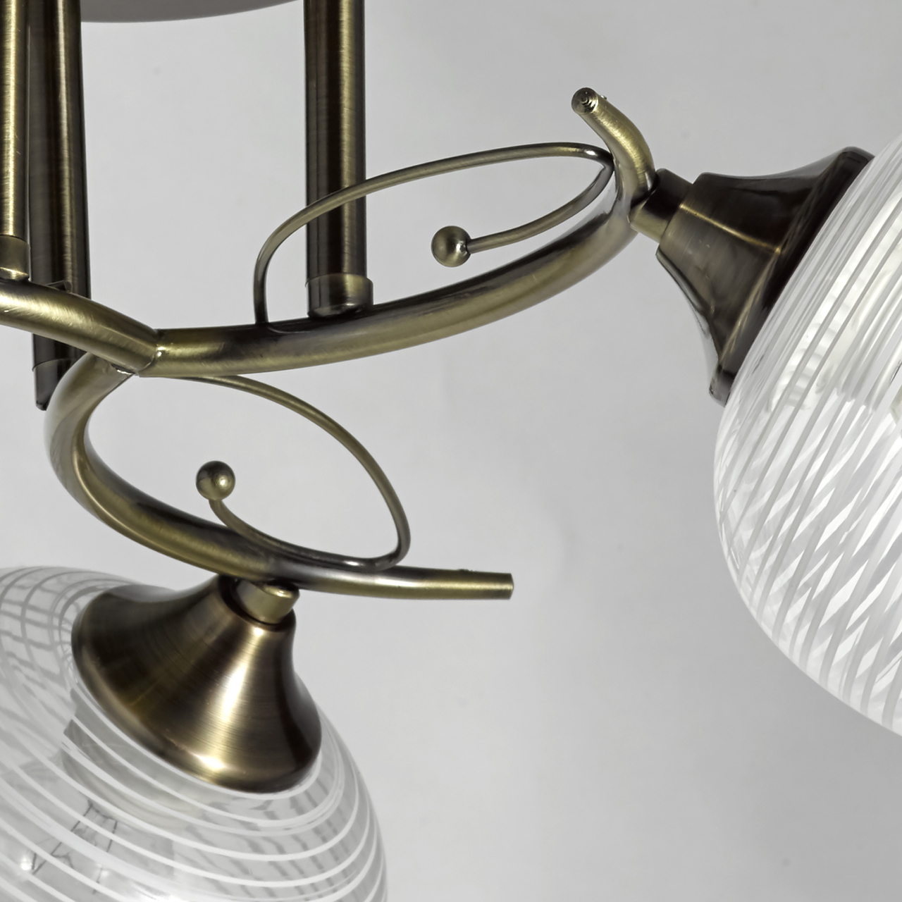 Основание светильника выполнено из металла и гальванизировано в цвет античной бронзы. Стеклянные плафоны окрашены белой краской в тонкую полоску. Края плафонов оплавлены.