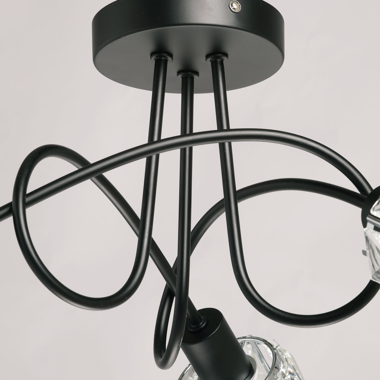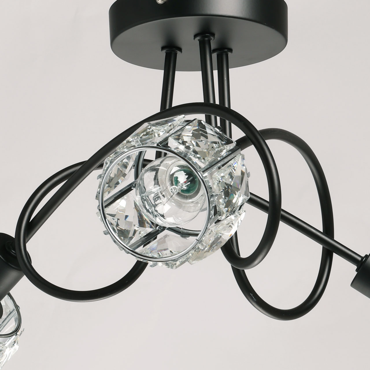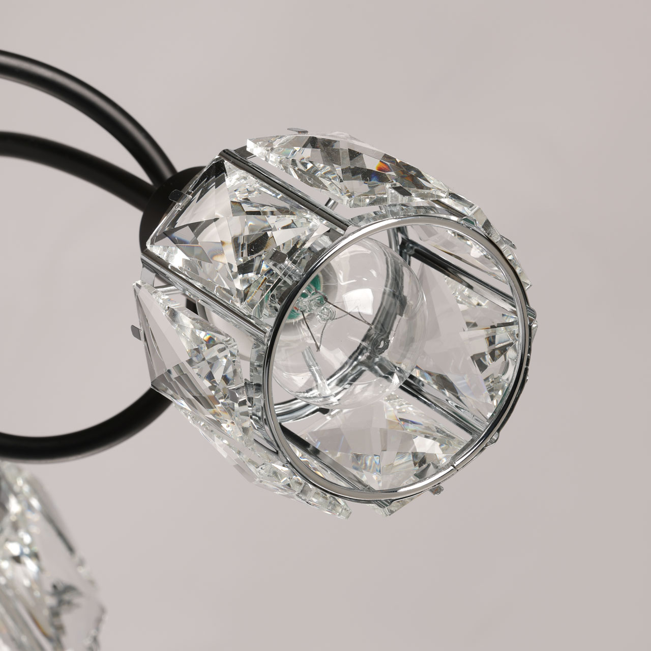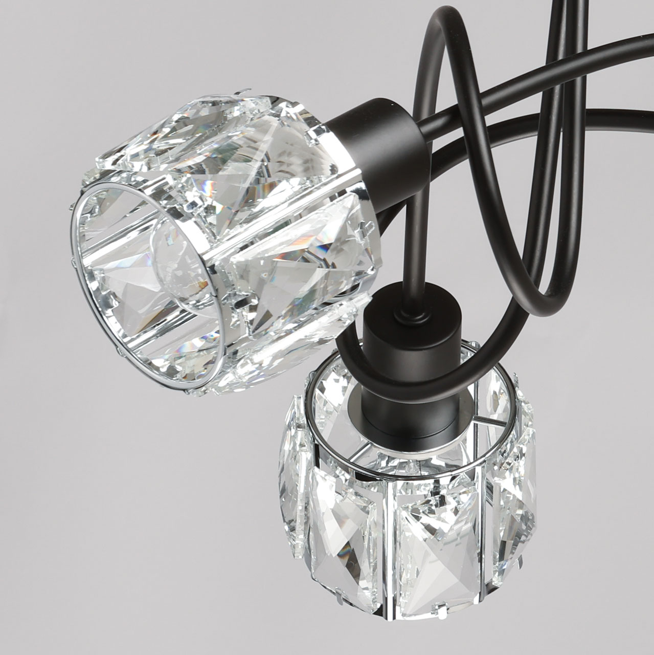 Металлическое основание потолочной люстры окрашено в черный цвет. Плафоны декорированы прозрачным хрусталем прямоугольной формы.