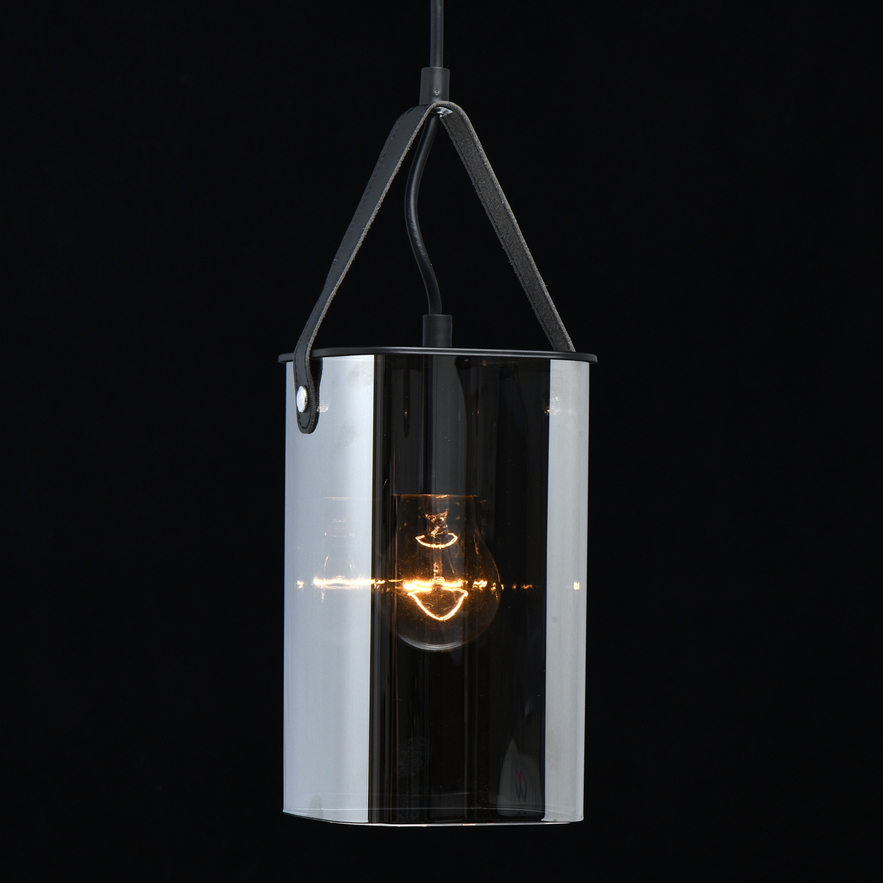 Основание светильника выполнено из металла и окрашено в черный цвет. Стеклянные плафоны гальванизированы в цвет антрацита. Плафоны крепятся к основанию на кожаных ремешках черного цвета.