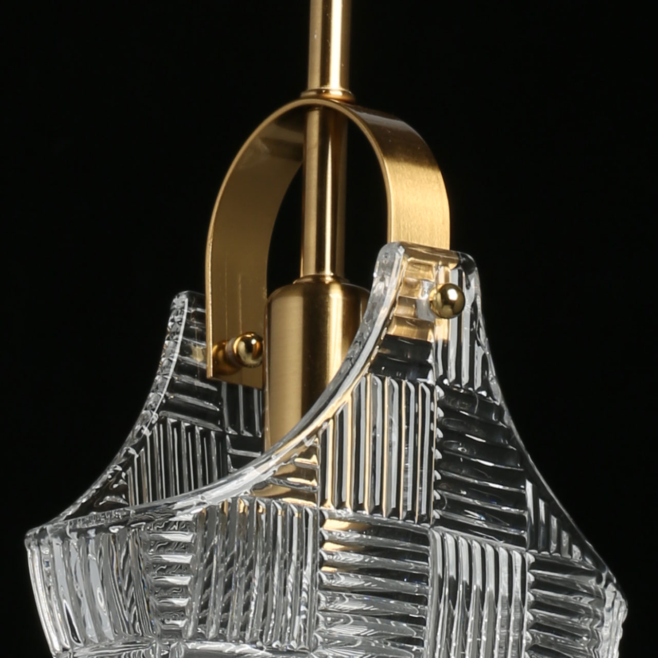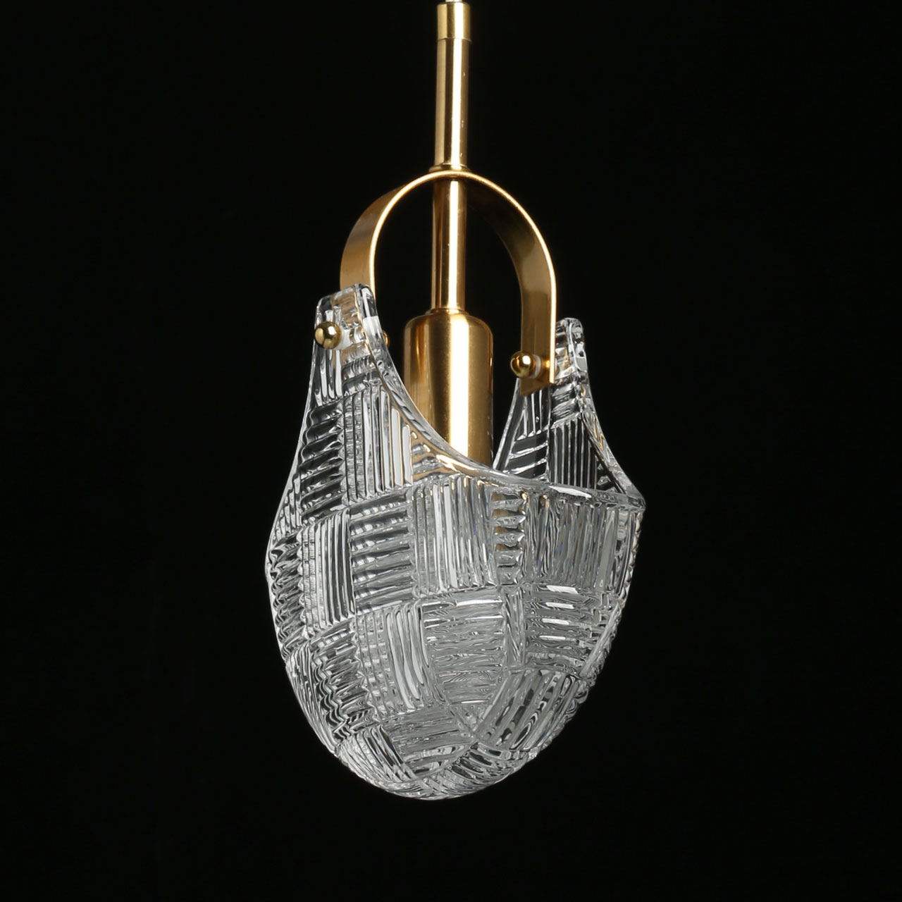 Металлическое основание подвеса гальванизировано в цвет бронзы. Подвесной светильник декорирован плафоном оригинальной формы из прозрачного фактурного стекла, отлитого в сложную форму.