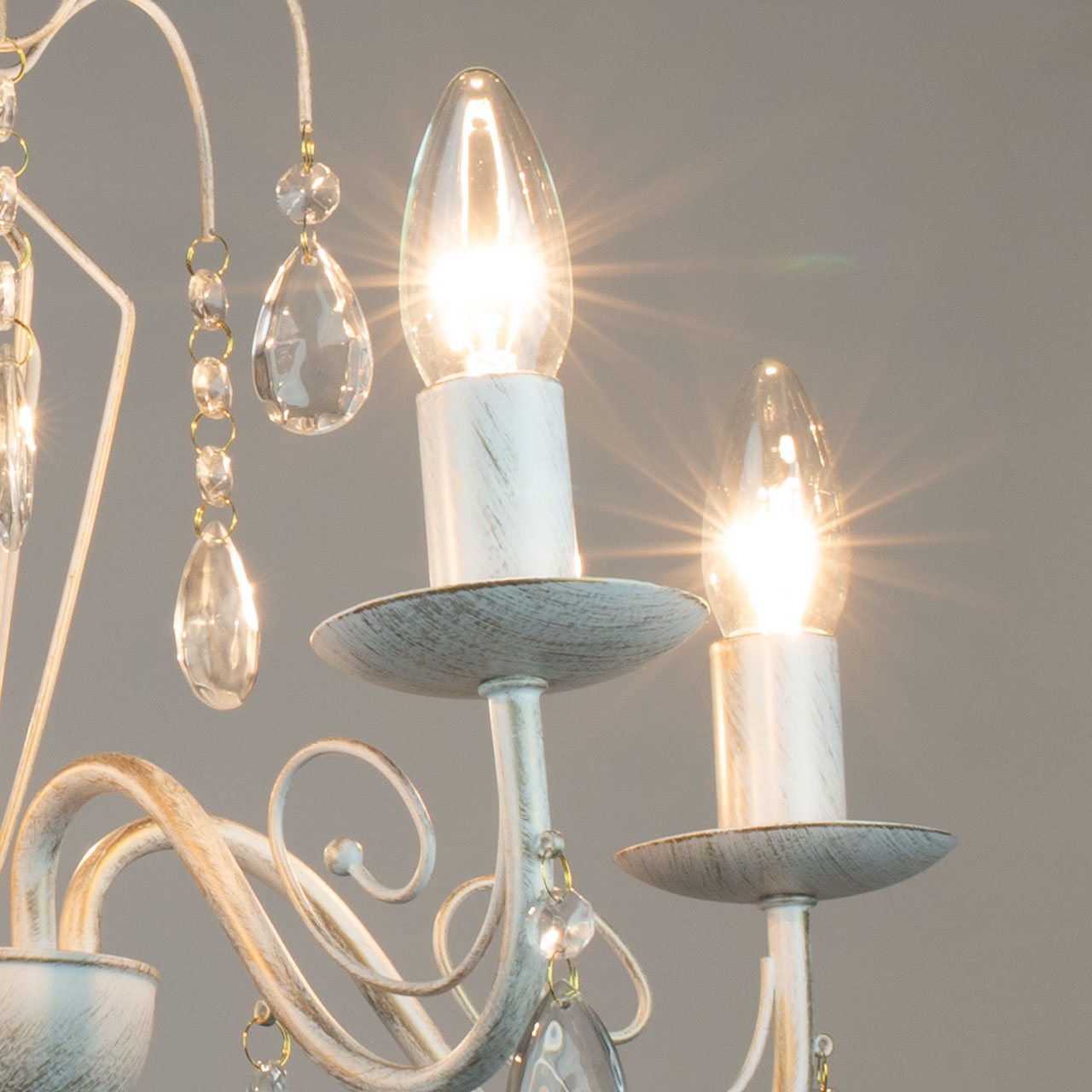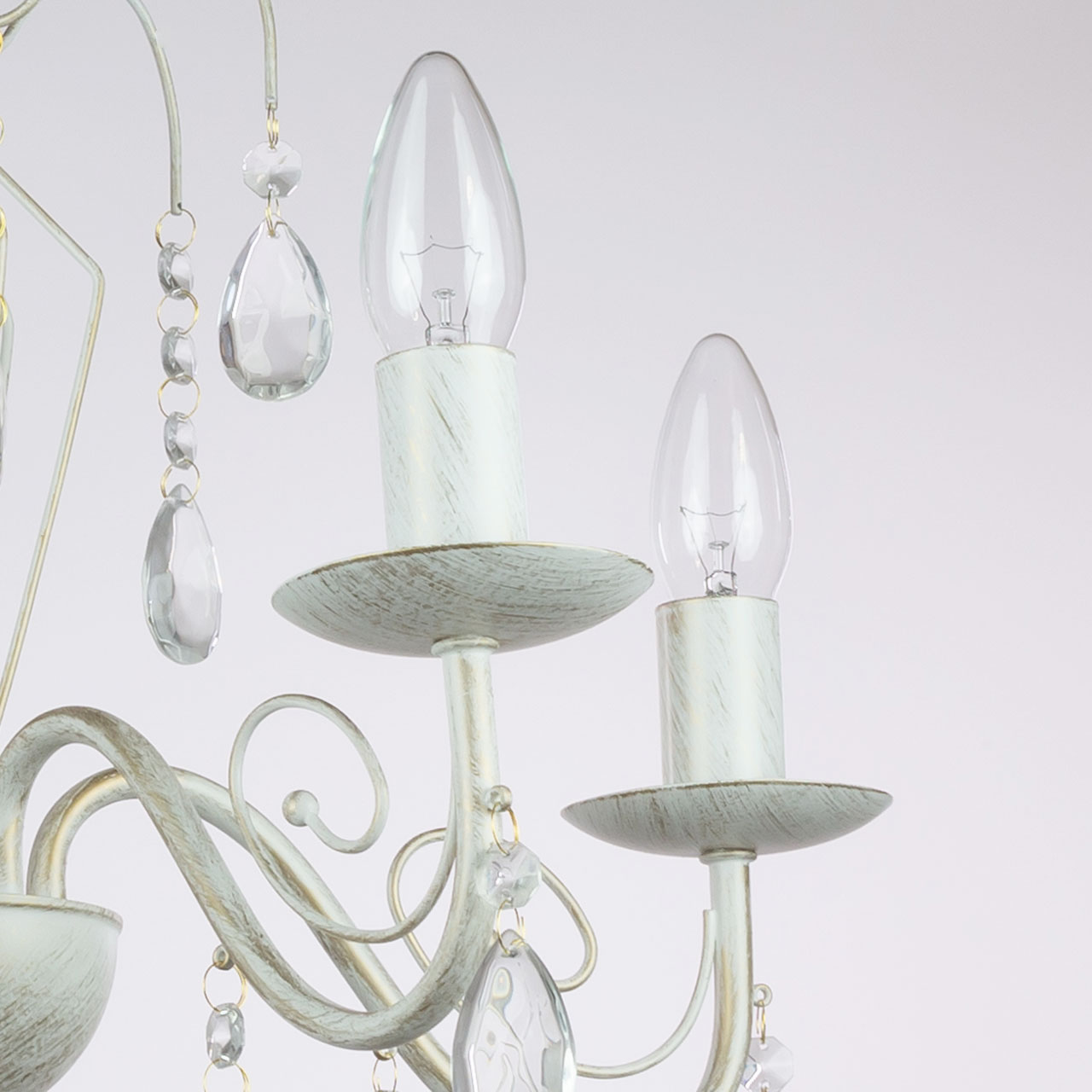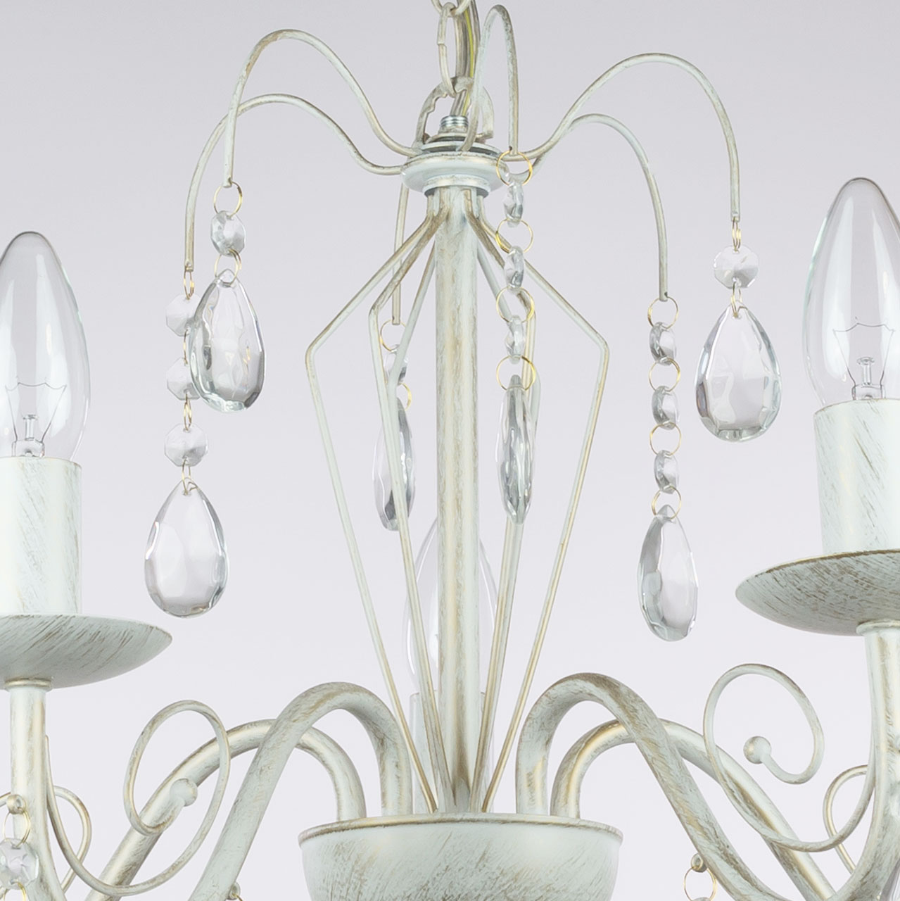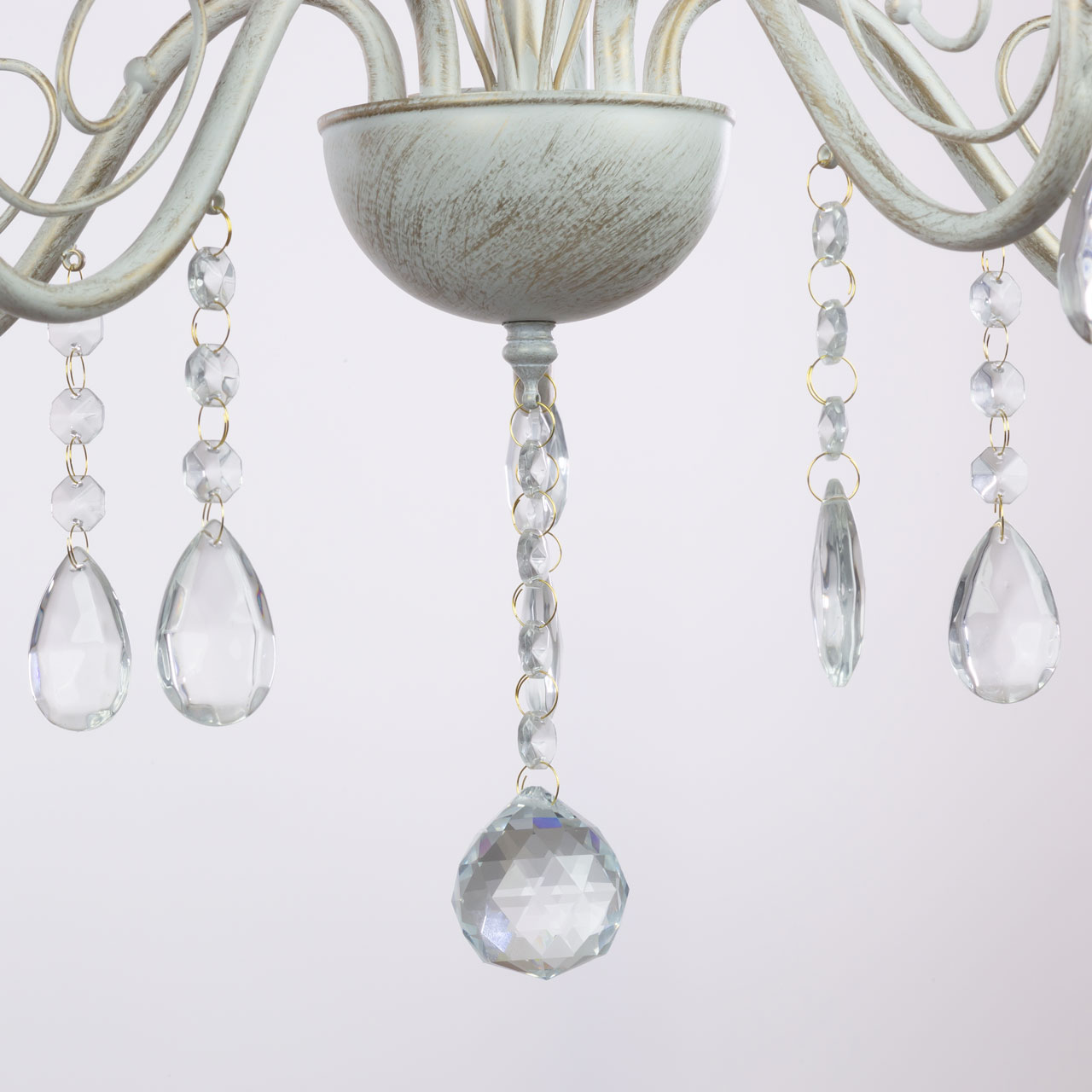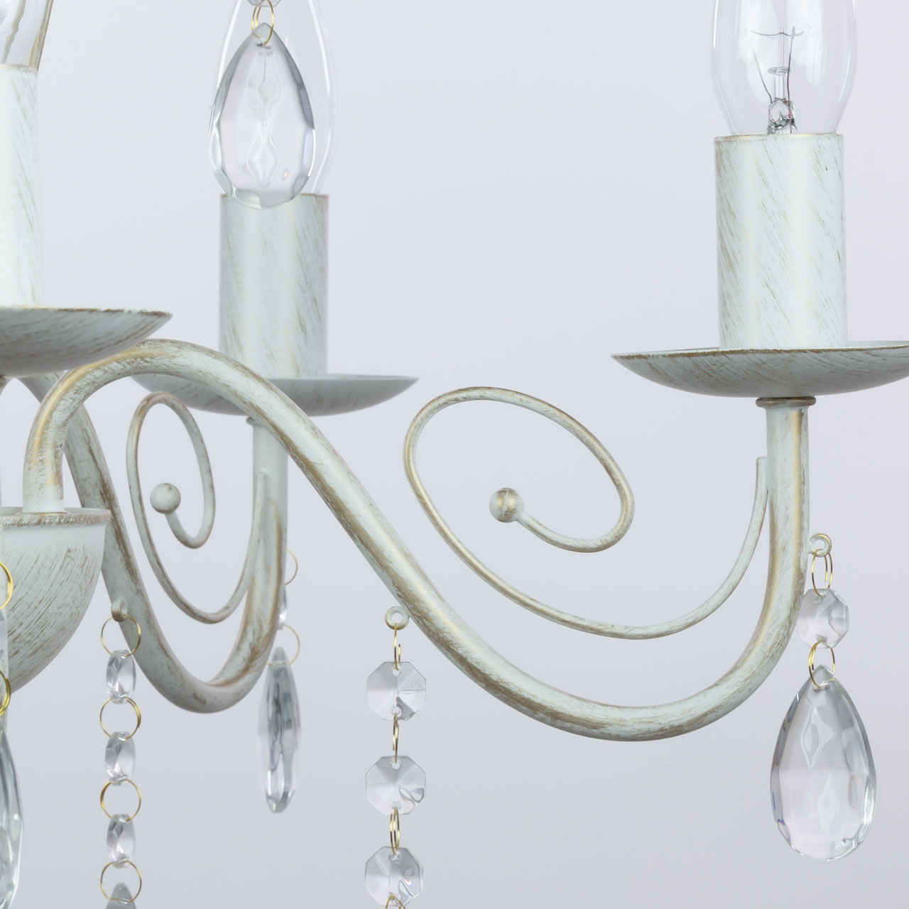 Металлическое основание подвесной люстры окрашено по технологии хай-лайт, где на основной слой белого цвета наносится штрихами декоративный слой золотого цвета. Люстра декорирована прозрачным хрустальным стеклом миндалевидной формы.