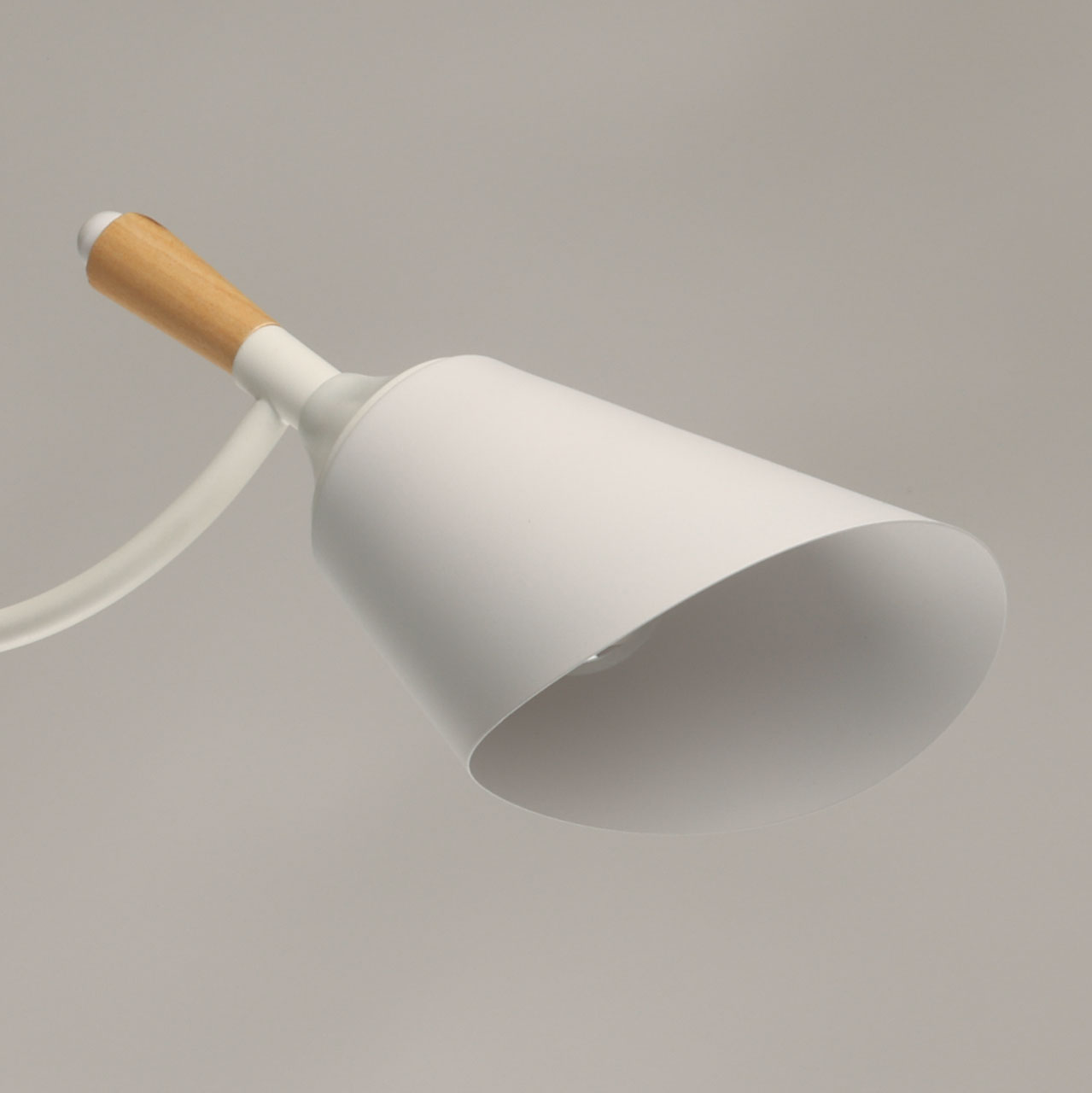 Металлическое основание потолочной люстры окрашено в белый цвет. Металлические плафоны с окрашены в белый цвет. Потолочная люстра декорирована элементами из светлого натурального дерева.