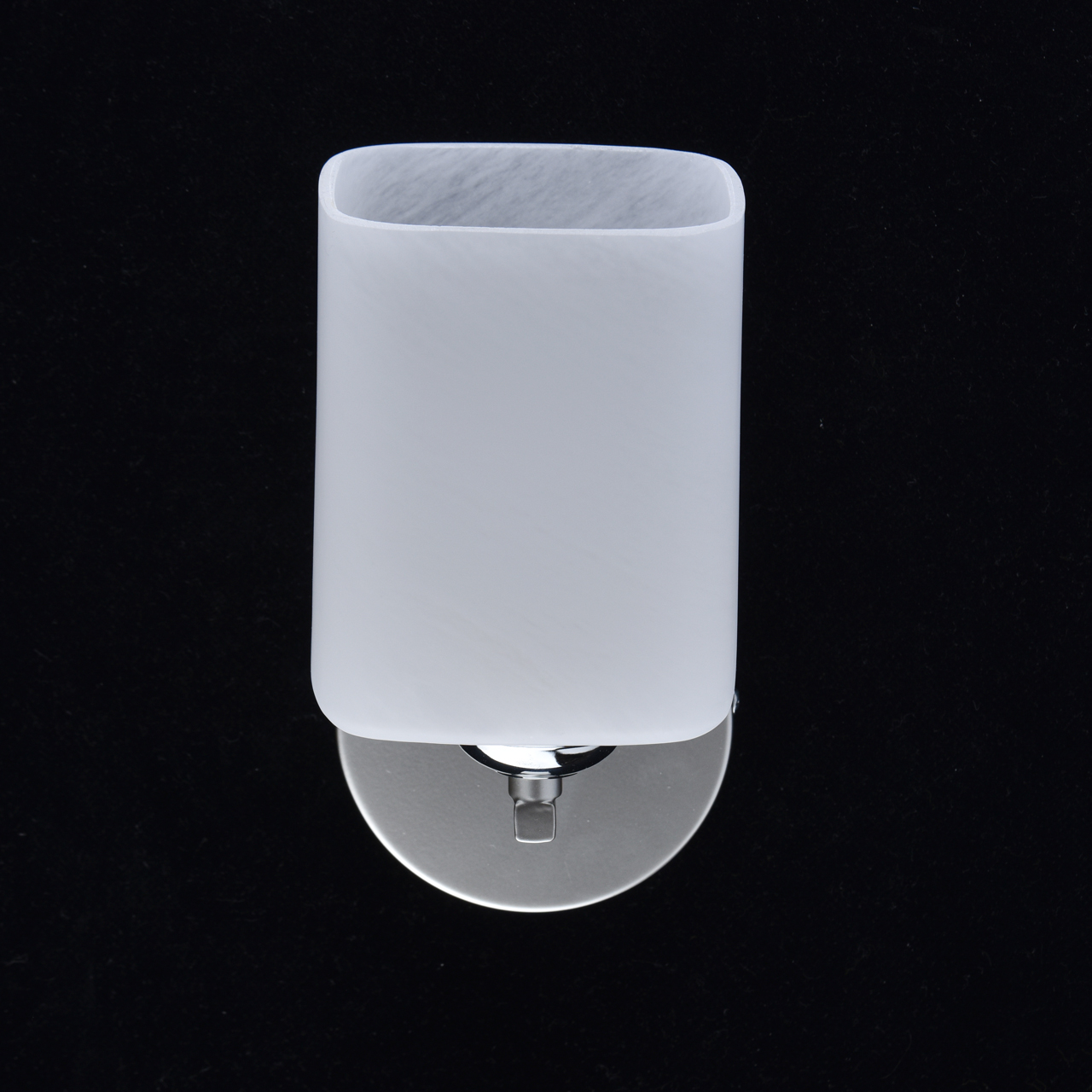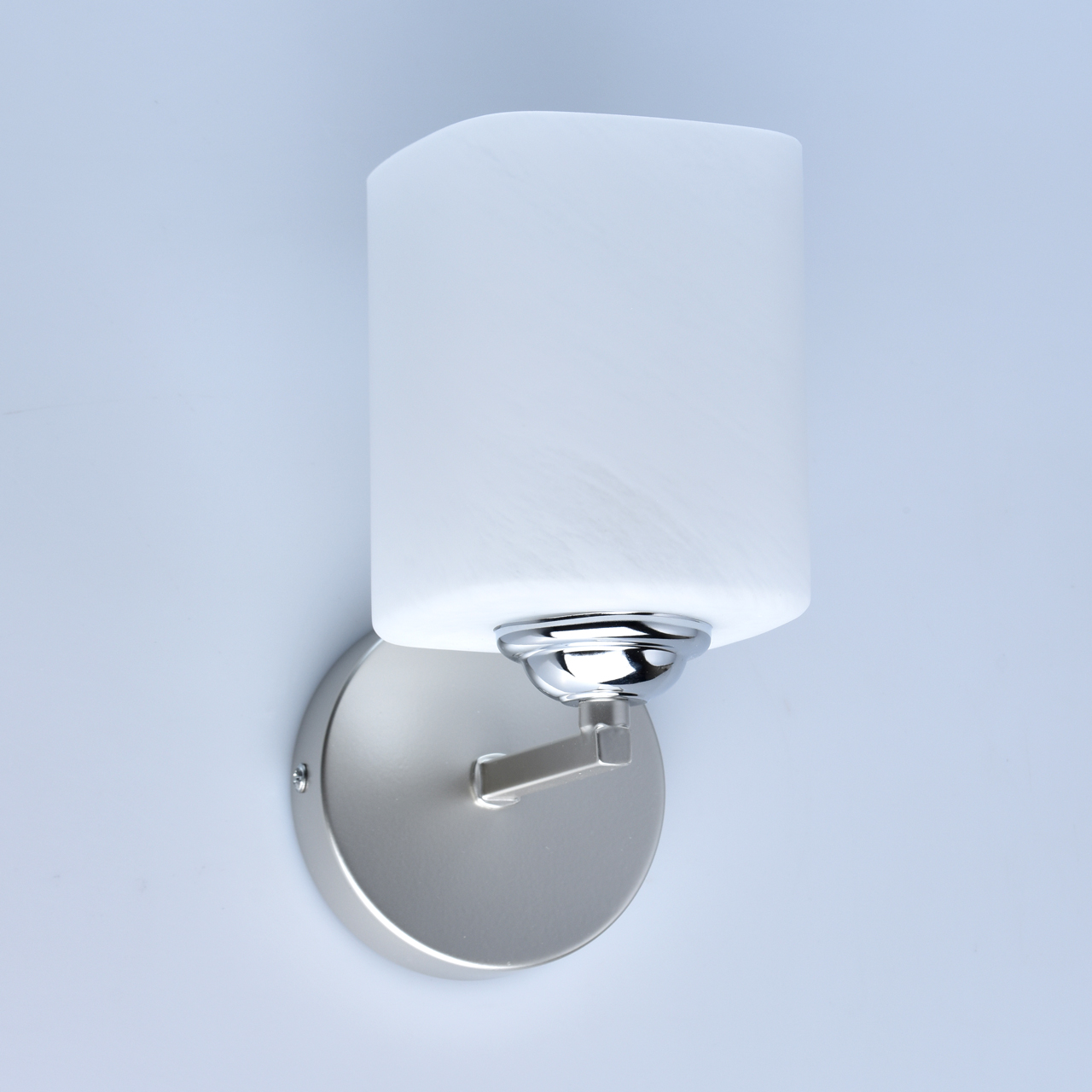 Основание бра выполнено из металла. Корпус и рожок окрашены в цвет перламутрового серебра. Держатель плафона гальванизирован в цвет хрома. Плафон квадратной формы выполнен из алебастрового стекла.