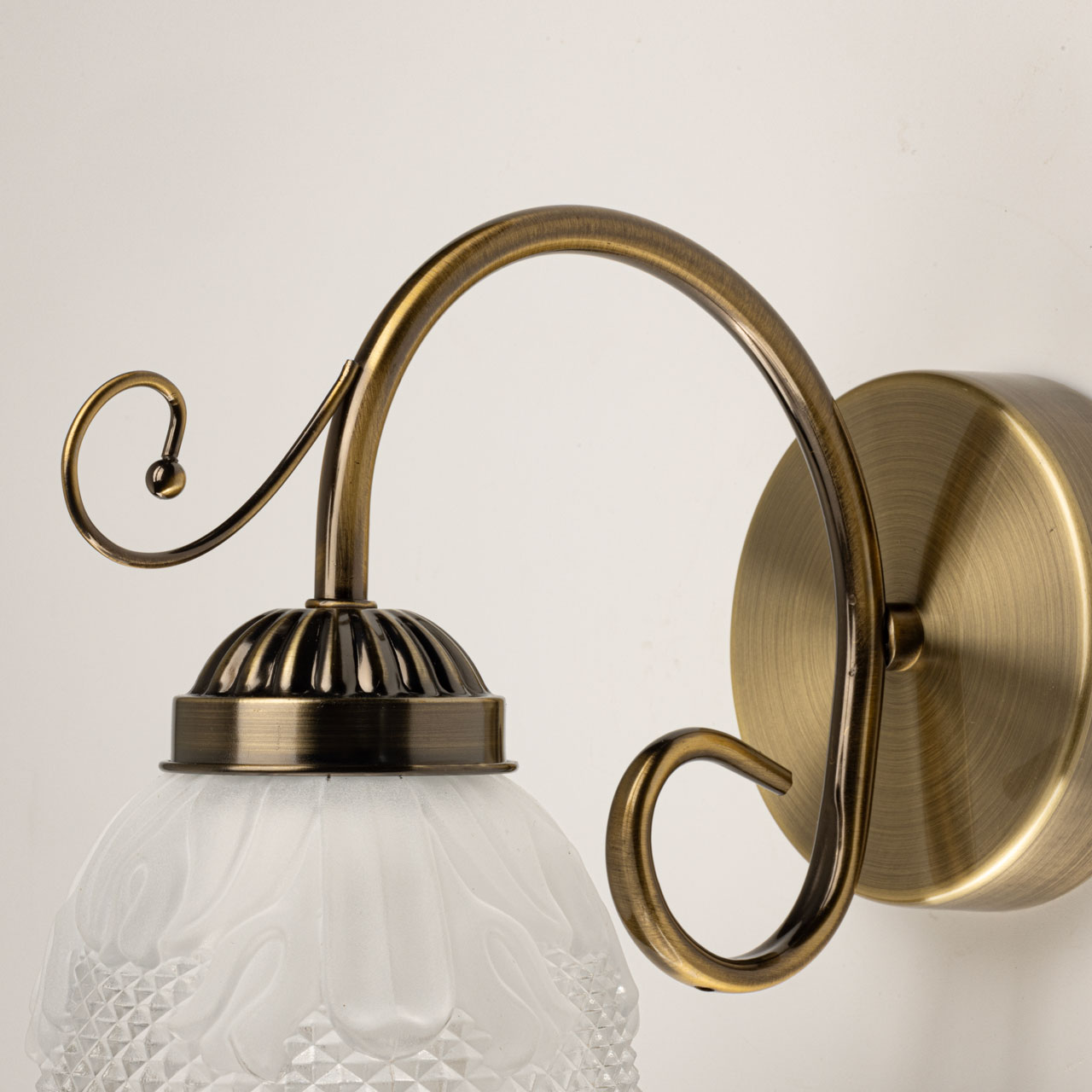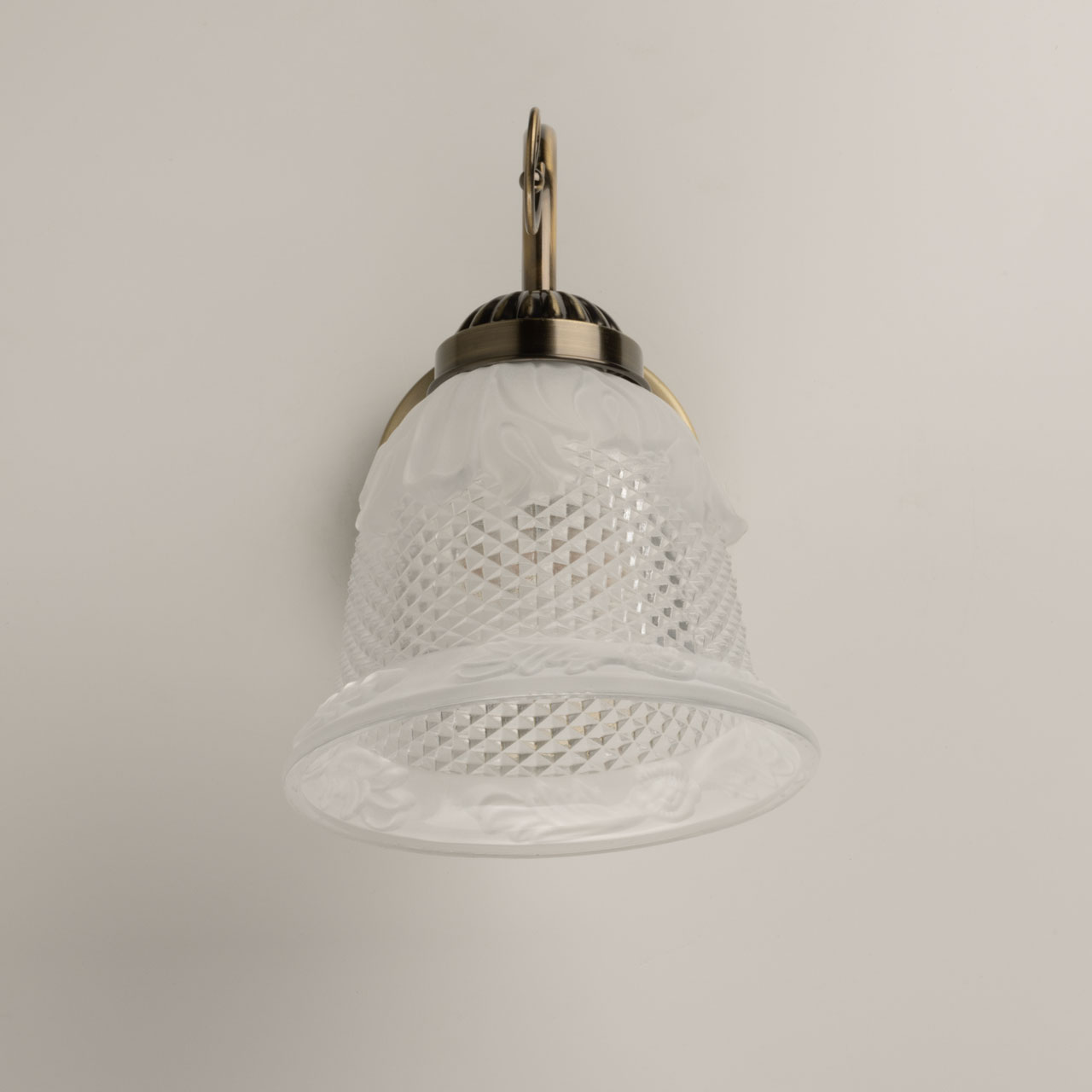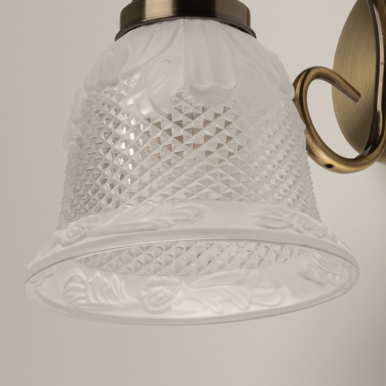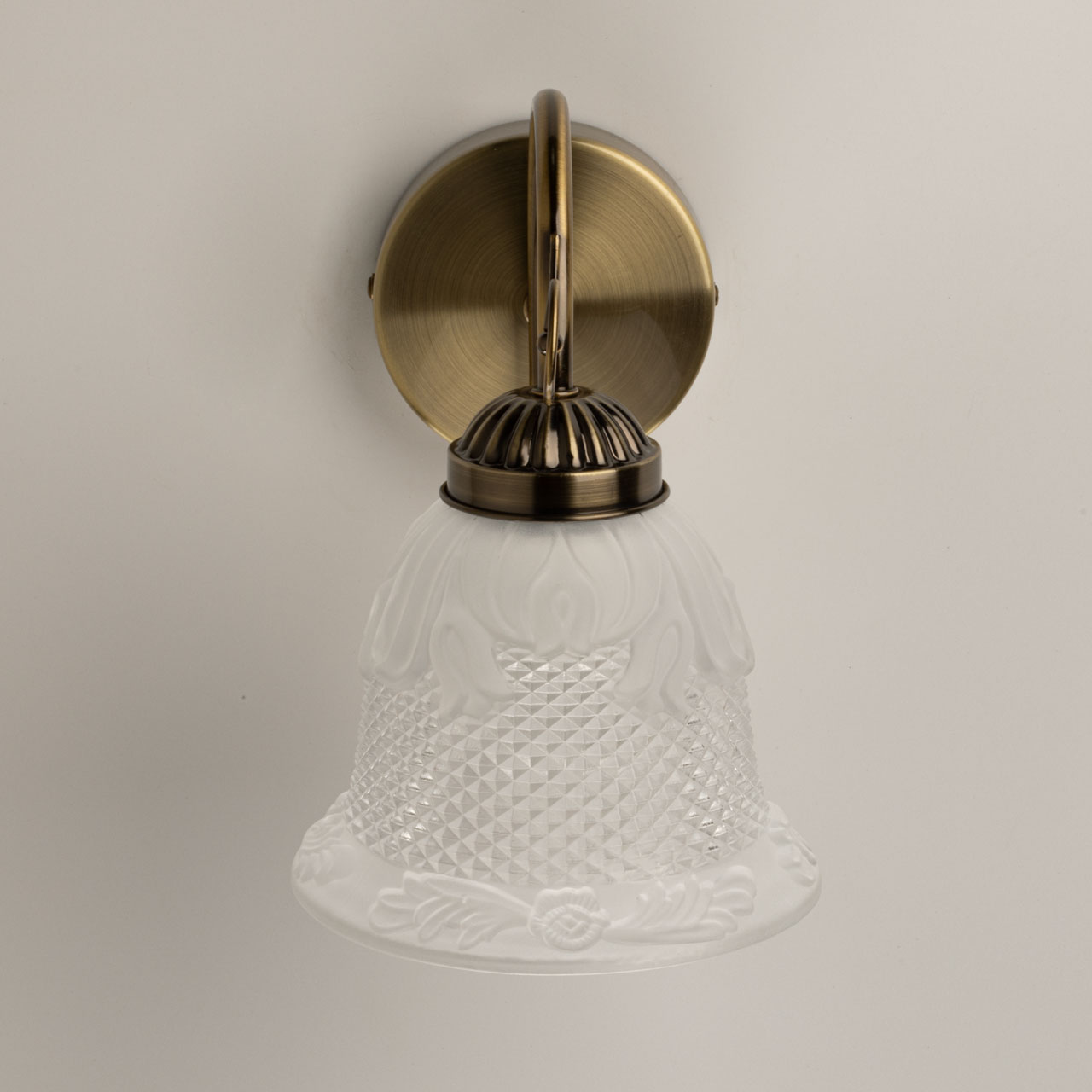 Настенное бра, выполненное в классическом стиле, представляет собой изысканный элемент освещения, который прекрасно дополнит любой интерьер. Его основание изготовлено из металла, который был гальванизирован в элегантный цвет античной бронзы. Этот оттенок придаёт бра не только стильный вид, но и позволяет ему легко вписаться в различные дизайнерские решения. Плафон в форме колокольчика, выполненный из стекла, украшен сложным фактурным узором, который создает интересные световые эффекты, добавляя атмосферности в помещение.Такое бра идеально подходит для создания уюта в зоне отдыха, например, рядом с диваном или креслом в гостиной. Оно станет великолепным акцентом, который привлечет внимание и создаст теплую атмосферу для общения с друзьями или семейного времяпрепровождения. Кроме того, это бра можно использовать в качестве прикроватного светильника в спальне, что позволит создать романтическую и спокойную обстановку для отдыха и расслабления.Благодаря своему универсальному дизайну, настенное бра гармонично сочетается с различными стилями интерьера. Оно будет уместно как в классических и неоклассических интерьере, так и в более современных стилях, таких как прованс или модерн. Это делает его идеальным выбором для тех, кто хочет добавить в своё пространство нотку элегантности и стиля. Кроме того, благодаря разнообразию стилей, это бра станет отличным дополнением к вашему интерьеру, независимо от того, предпочитаете ли вы уютный деревенский стиль или строгую современную эстетику.