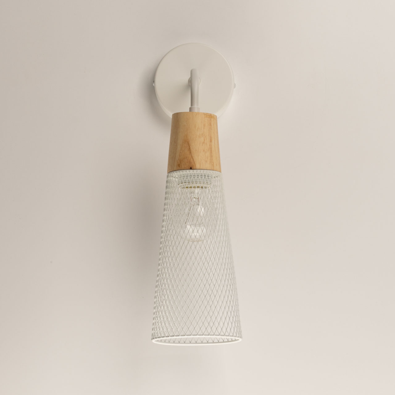Металлическое основание и плафон бра окрашены в белый цвет. Декоративный элемент выполнен из металла с имитацией под натуральное дерево.