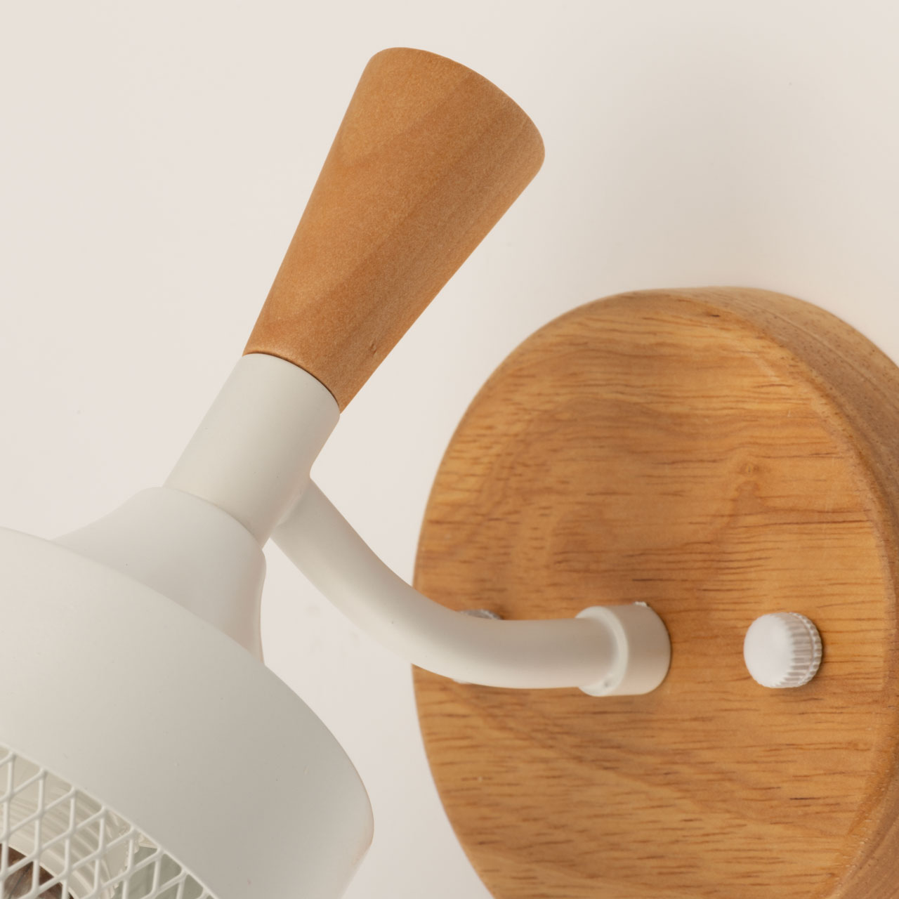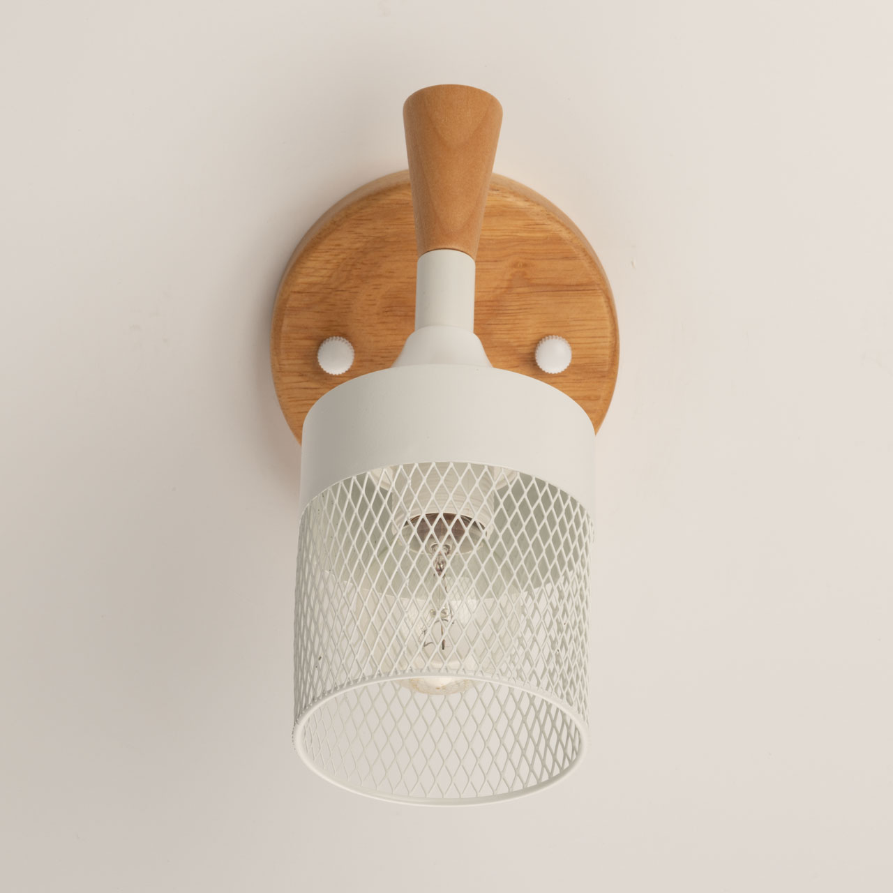 Металлические основание и плафон настенного бра окрашены в белый цвет. Элемент крепления к стене и декор выполнены из натурального дерева.