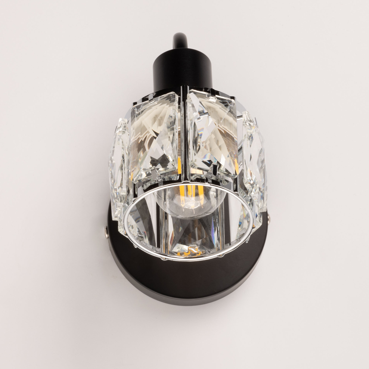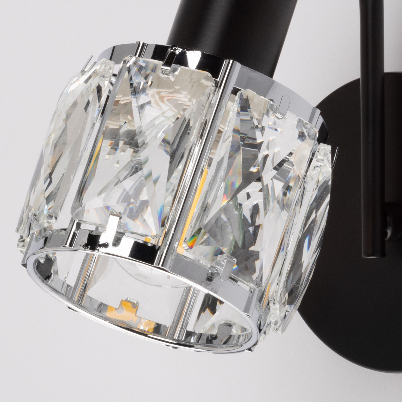 Металлическое основание настенного бра окрашено в черный цвет. Плафон декорирован прозрачным хрусталем прямоугольной формы.