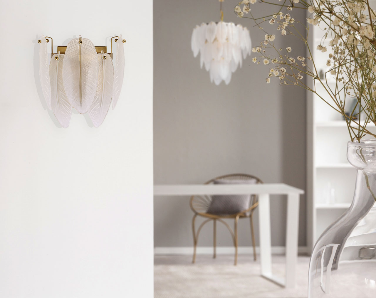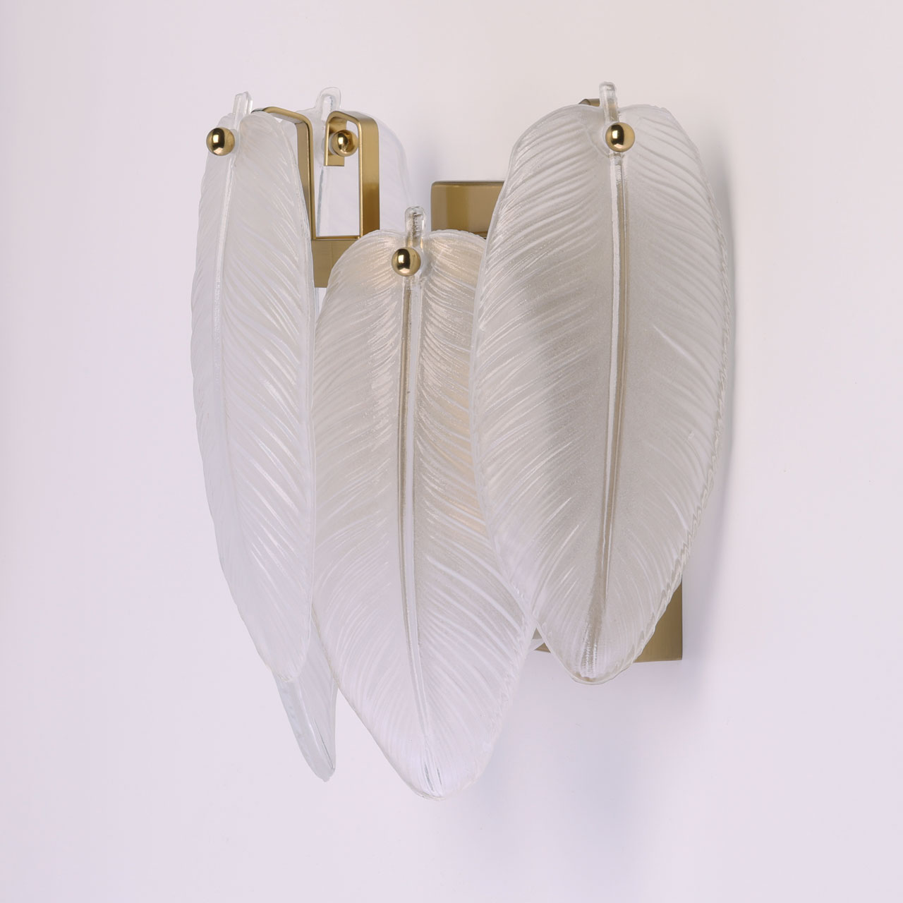 Металлическое основание настенного бра гальванизировано в цвет латуни. Вертикальное бра декорировано матированными стеклянными элементами в форме листьев.