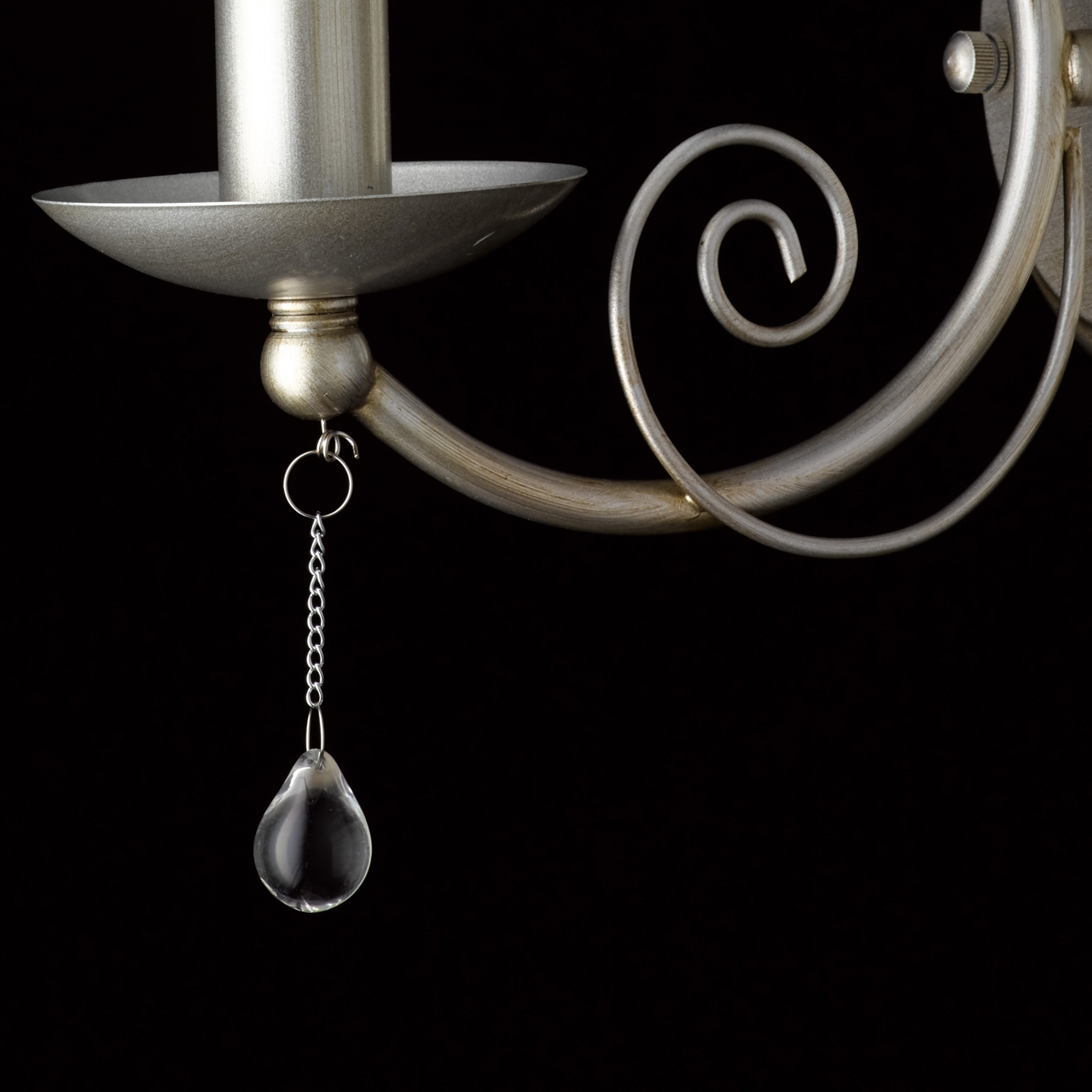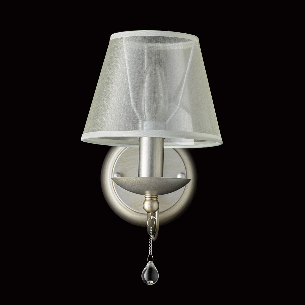 Основание бра выполнено из металла и обработано по технологии хай-лайт, где основной цвет перламутрового серебра, а декоративный — цвет кофе. Светильник декорирован двухслойным текстильным абажуром из органзы бежевого цвета с термостойким акрилом внутри и подвесками из прозрачного стекла. Абажур отделан кантом и прошит. Абажур съемный.