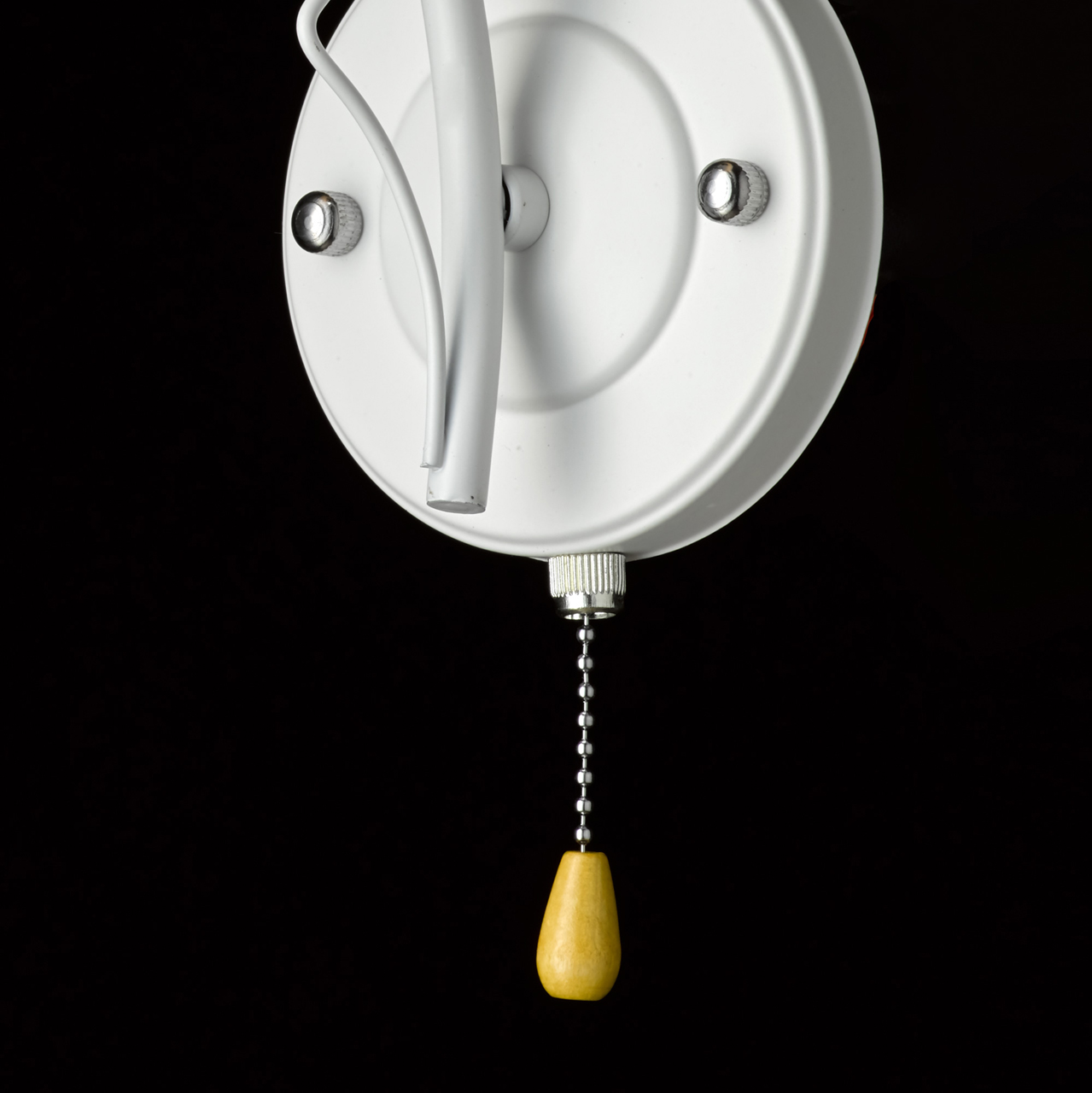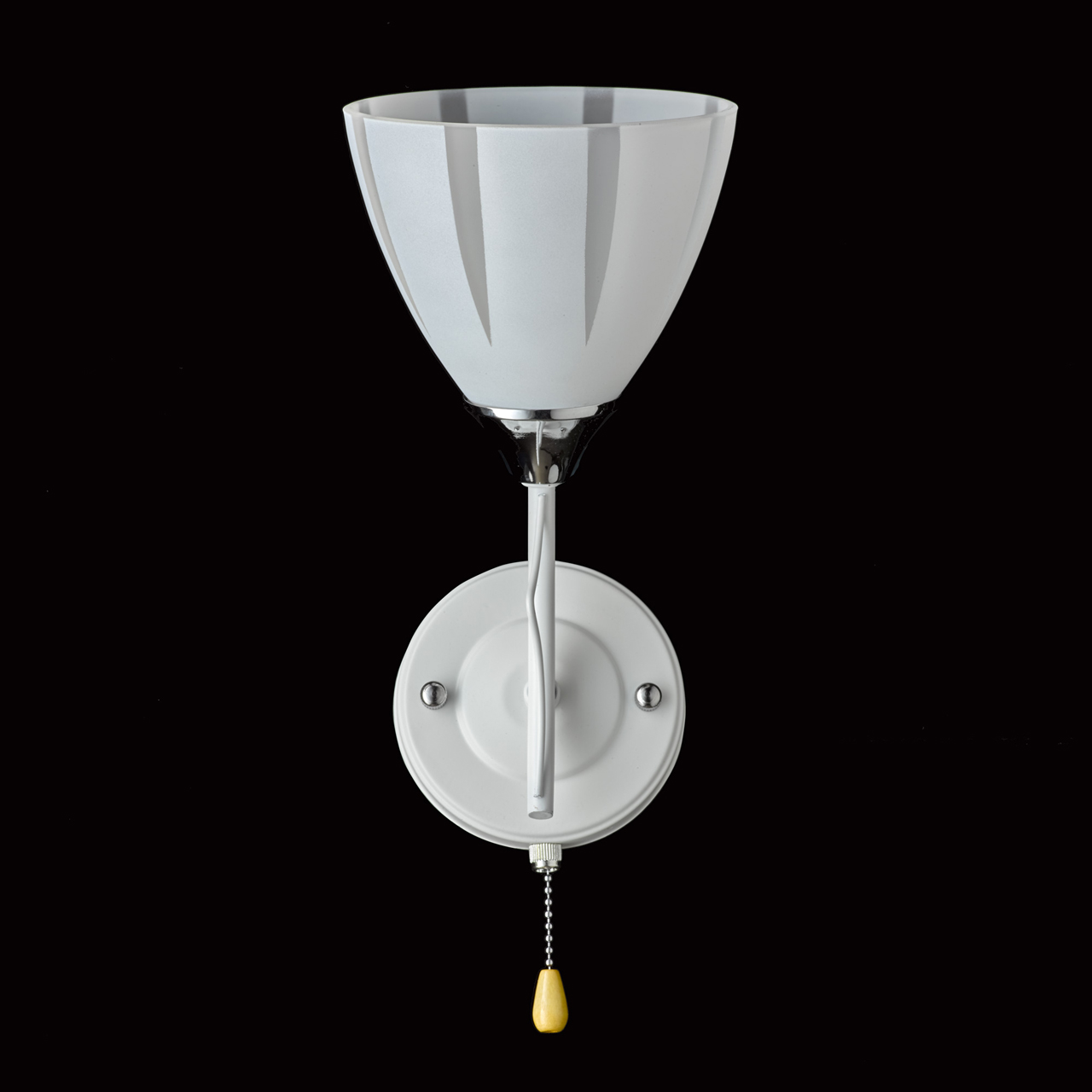 Основание бра выполнено из металла и окрашено в белый цвет. Отдельные элементы основания гальванизированы в цвет хрома. Стеклянный матированный плафон окрашен в белый цвет по трафарету. Светильник декорирован прозрачным хрусталем в форме шара.