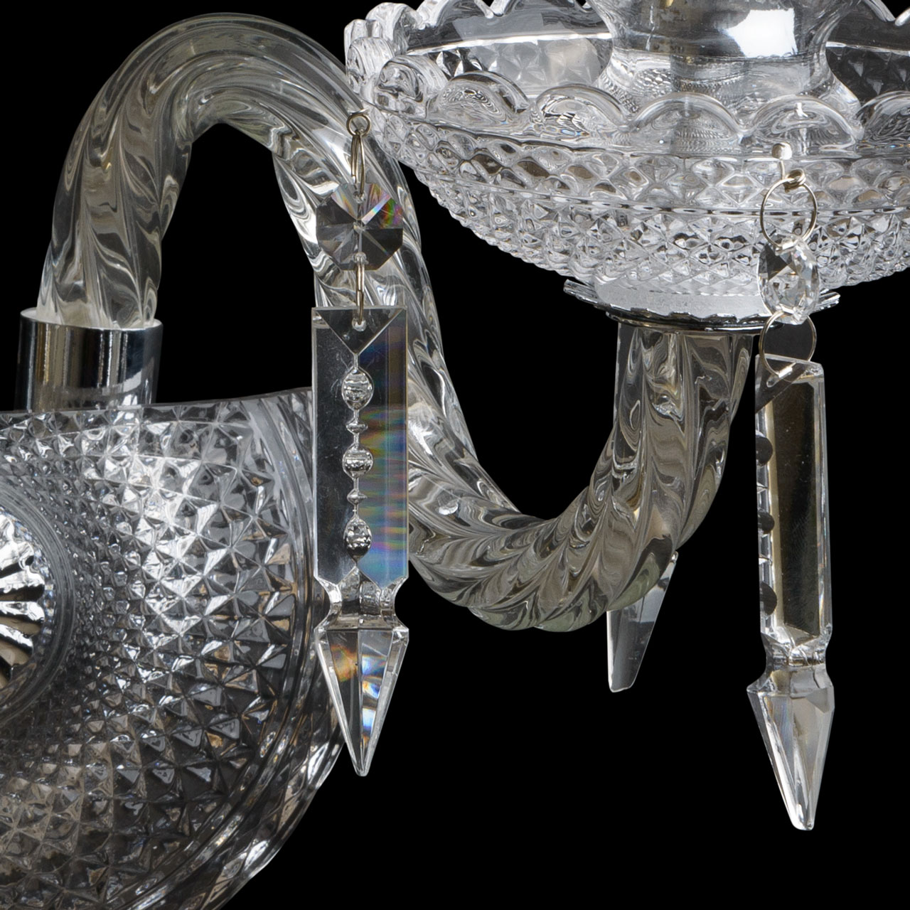 Арматура светильника из сплава металла, гальванизирована в цвет хрома, декорирована прозрачным хрустальным стеклом грановитой огранки. Розетки и декор центральной оси выполнены в одном стиле. Витые рожки произведены гутным способом. Светильник декорирован подвесками из хрусталя F&D 3-х видов оригинальной огранки и оригинальными декоративными элементами.