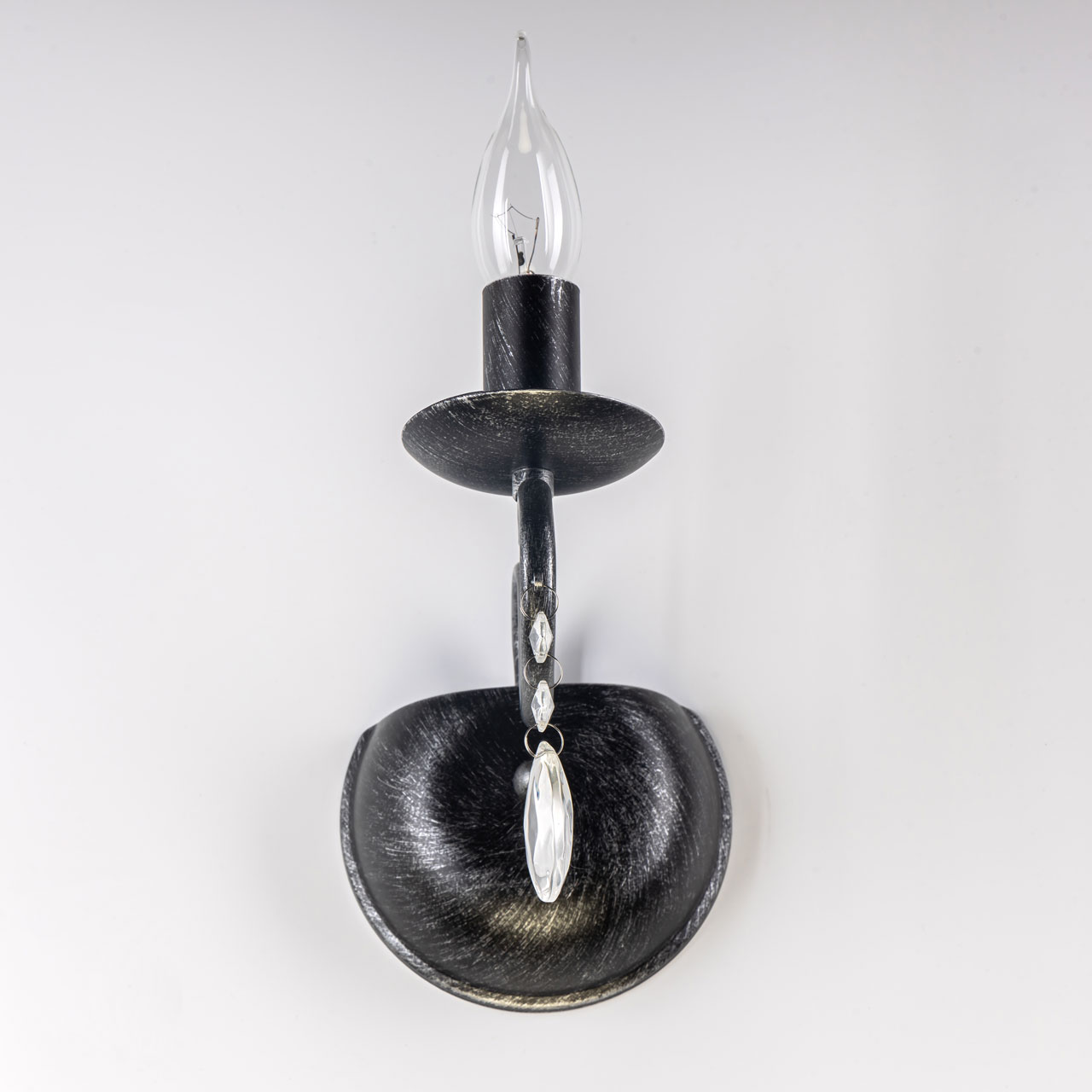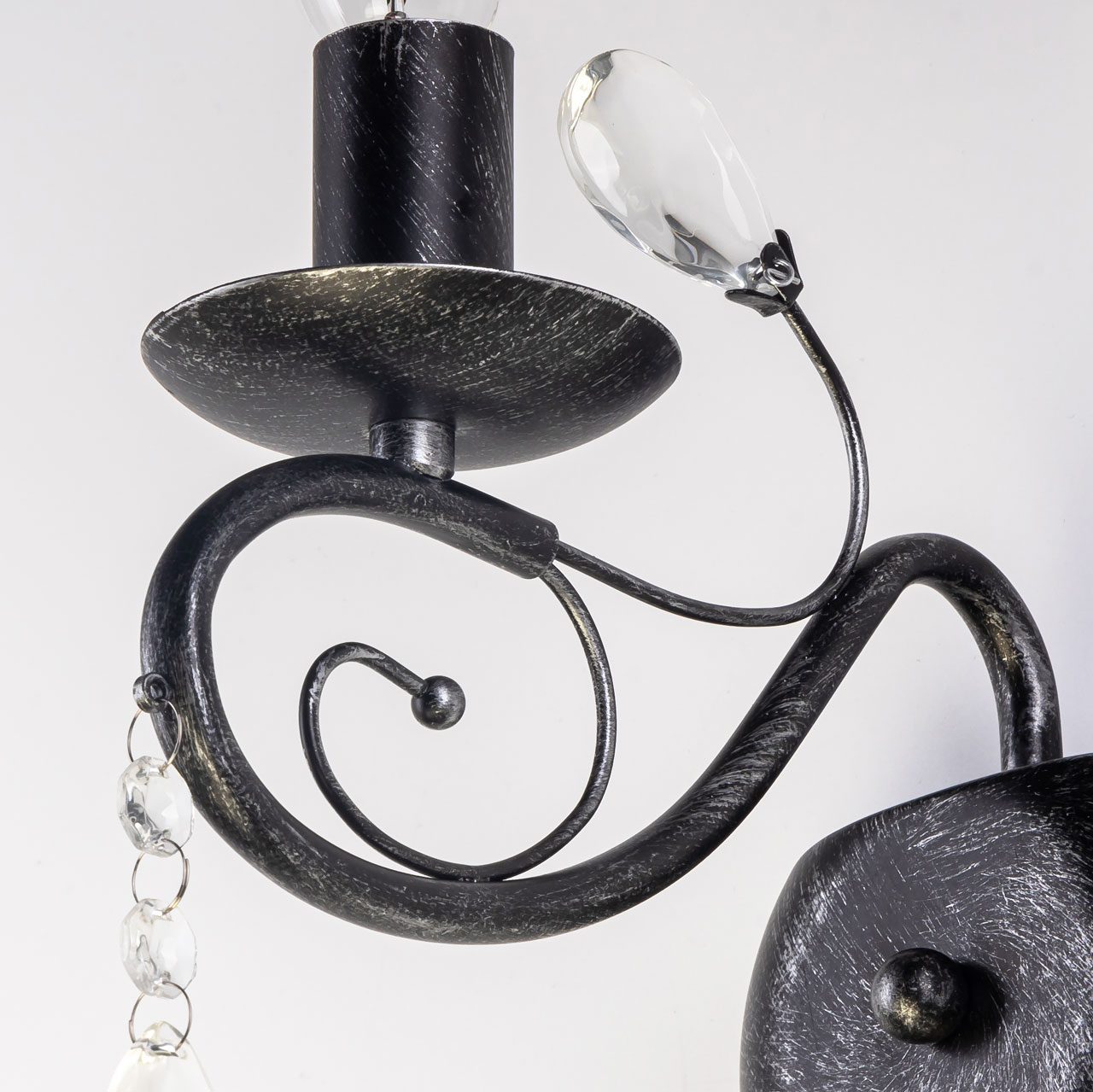 Металлическое основание бра окрашено в черный цвет и обработано по технологии хай-лайт в серебряный цвет. Настенное бра декорировано стеклянными подвесами миндалевидной формы.