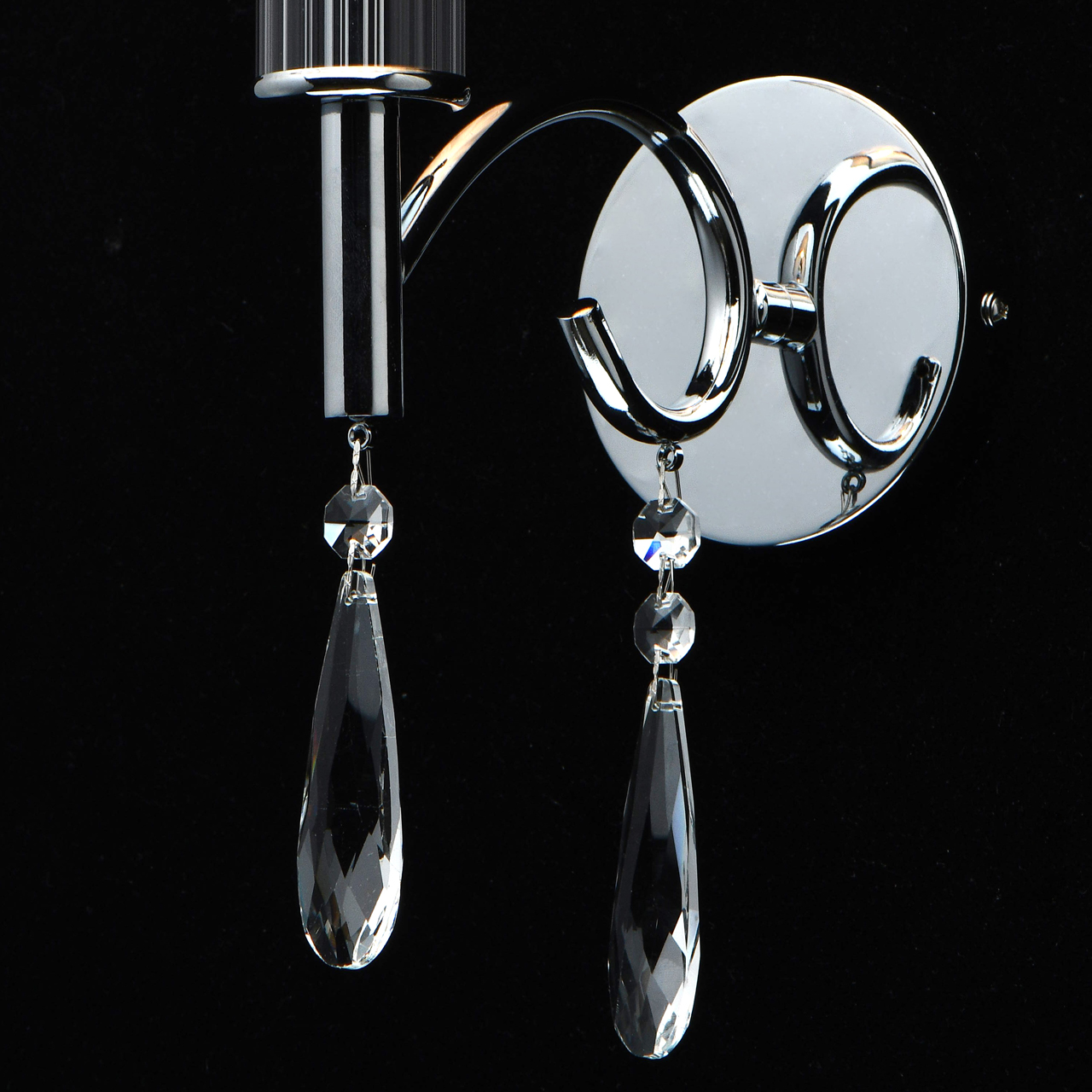 Металлическое основание бра гальванизировано в цвет хрома. Бра декорировано прозрачным хрусталем оригинальной вытянутой формы. Источник света закрыт текстильным абажуром из органзы белого цвета.
