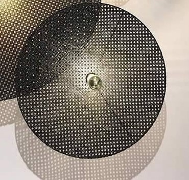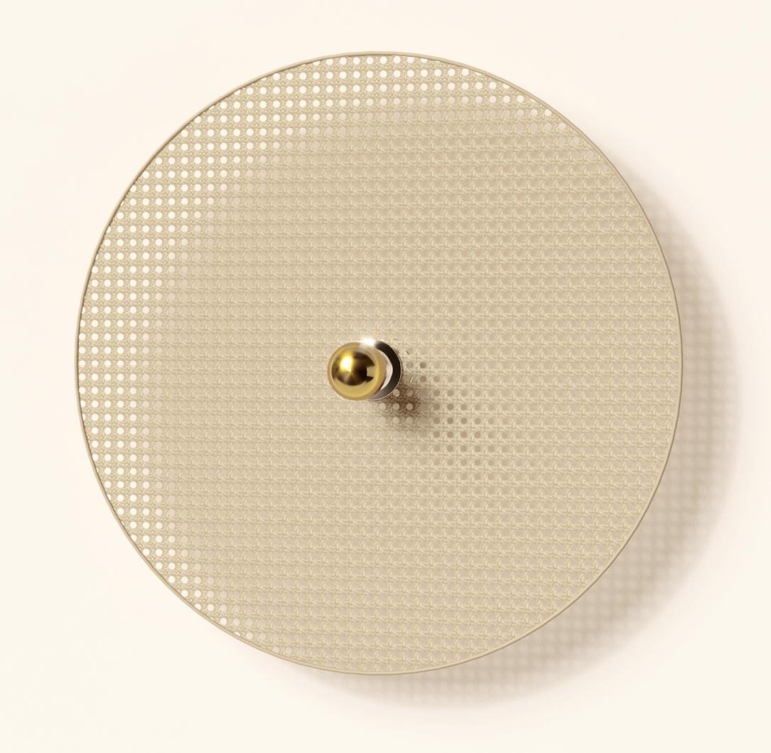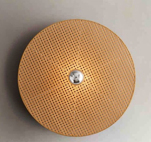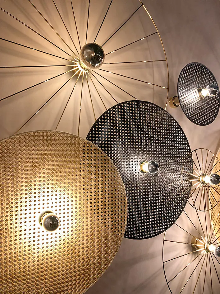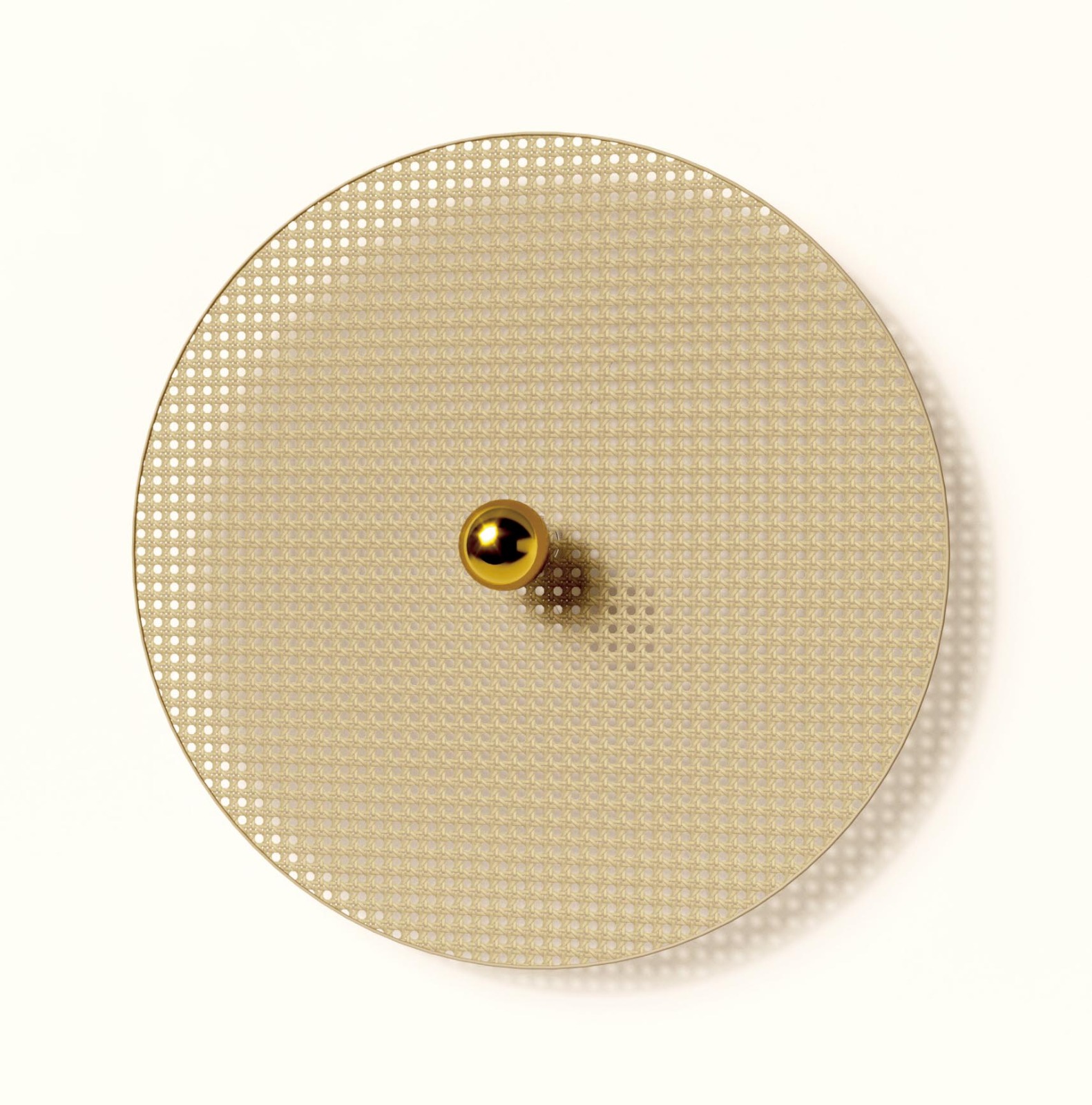 Настенное бра, выполненное из мателла и ротанга в современном стиле. Состоит из металлического фиттинга размером 10 см золотого цвета и рассеивающего диска из ротанга 60 см в черном цвете.