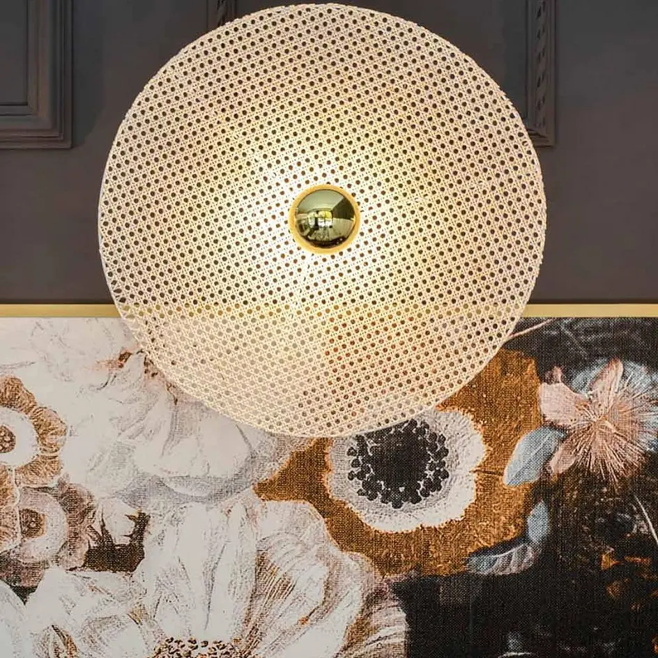 Настенное бра, выполненное из мателла и ротанга в современном стиле. Состоит из металлического фиттинга размером 10 см хромового цвета и рассеивающего диска из ротанга 60 см в натуральном цвете.