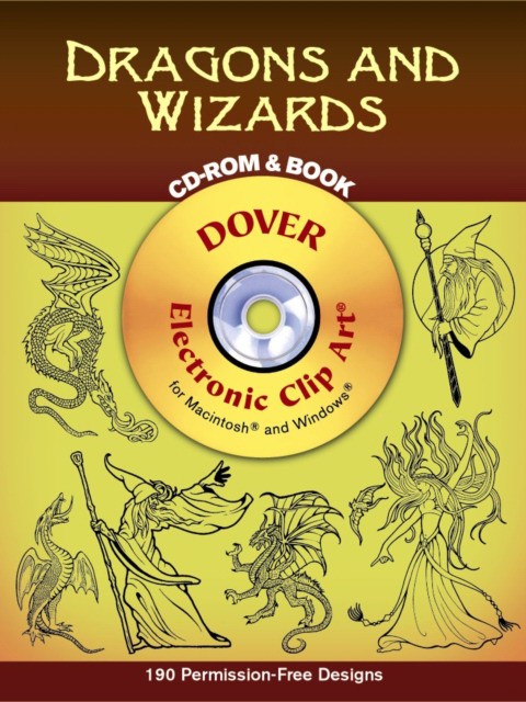 Dragons those vigilant guardians of fair maidens and treasures and a passel of powerful practitioners of wizardry are featured in this exciting CD-ROM and book collection. These 190 original illustrations of smoke- and fire-breathing dragons, scaly creatures of the sea, and wizards with long beards and flowing robes are ready to create instant interest wherever they're used. Included in this set are: One CD-ROM containing 190 high-quality, permission-free images scanned at 600 dpi and saved in six different formats (TIFF, PICT, EPS, BMP, as well as Internet-ready JPEG and GIF). A large-format 48-page book with every image on the CD-ROM printed large and clearly for easy reference.A CD-ROM and book set offering artists and crafters a virtually inexhaustible supply of graphics, this versatile array of easy-to-reproduce art will lend a touch of fantasy to any print project.
