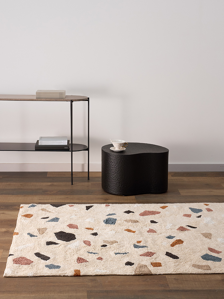 Терраццо — это особый материал родом из Италии, отполированная основа со вкраплениями гранита, мрамора или цветного стекла, создающими характерный мозаичный рисунок. Полы терраццо можно увидеть в парадных залах венецианских дворцов, а мы перенесли классический итальянский паттерн на мягкую поверхность хлопкового ковра. Прекрасное решение для тех, кто любит классику в необычном проявлении.