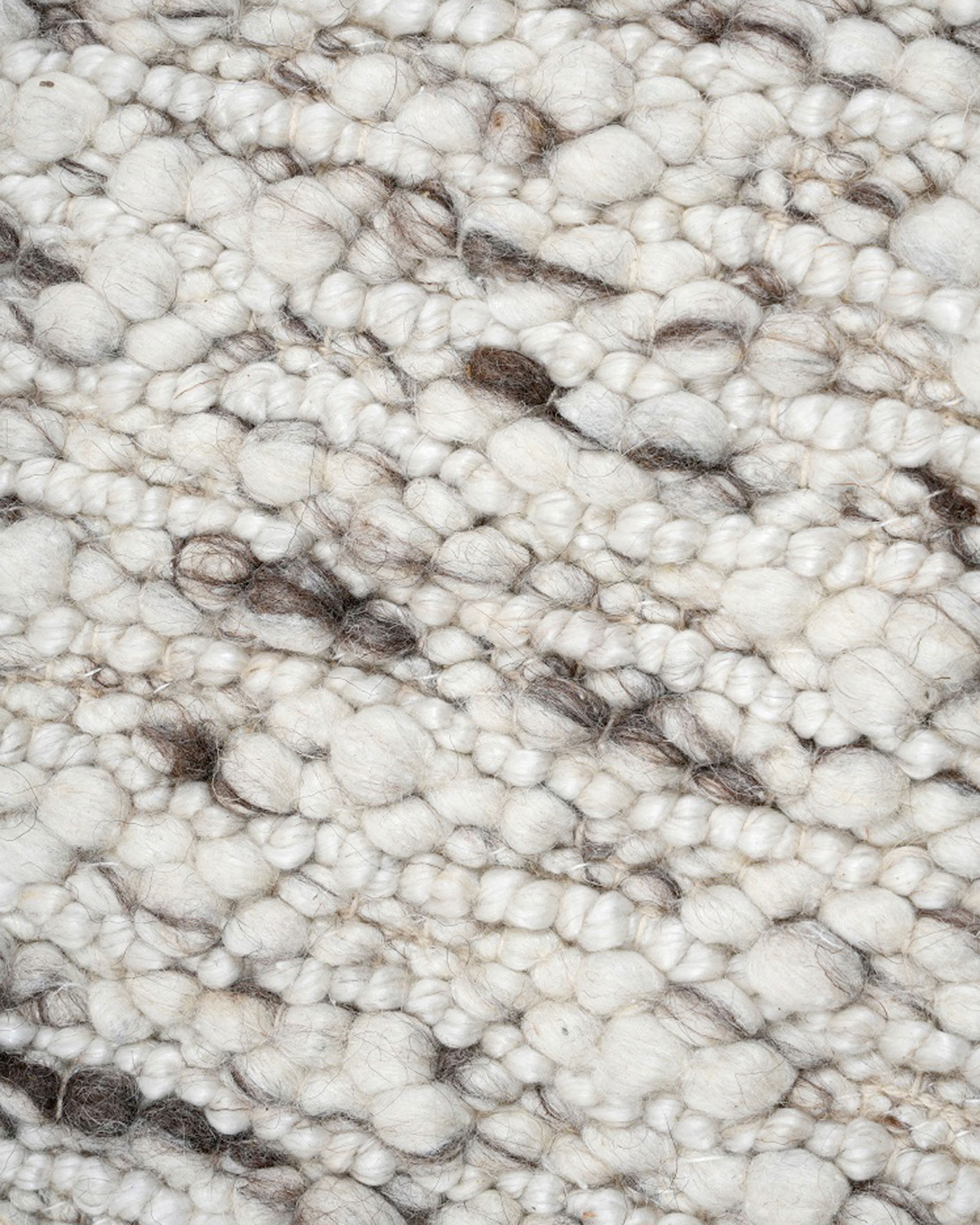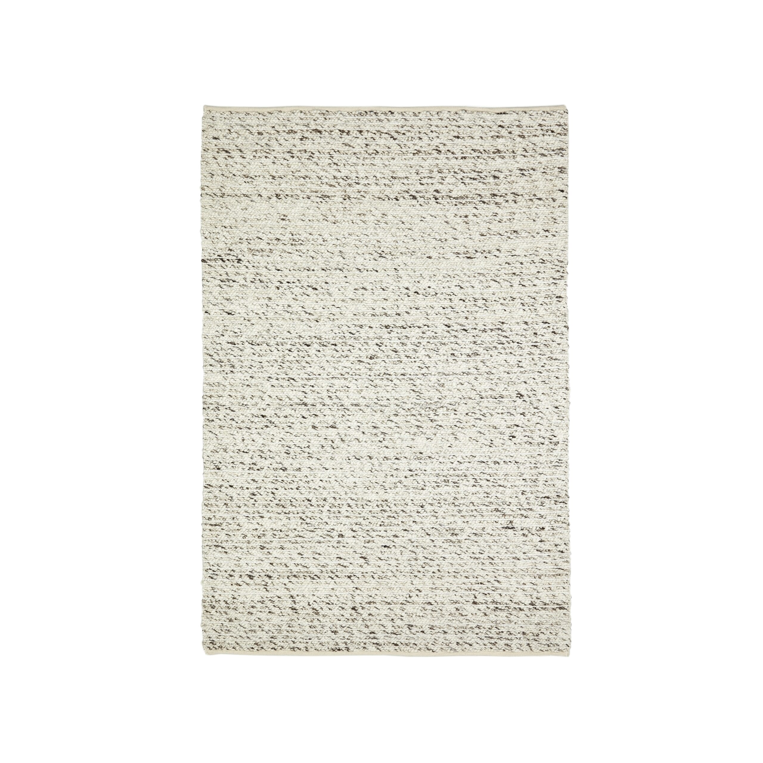 Ковер прямоугольной формы.Он соткан вручную из смесовой нити с натуральным составом (шерсть и хлопок). Нить гипоаллергенная, поэтому ковер подходит для детских комнат. Цвет бело-серый.