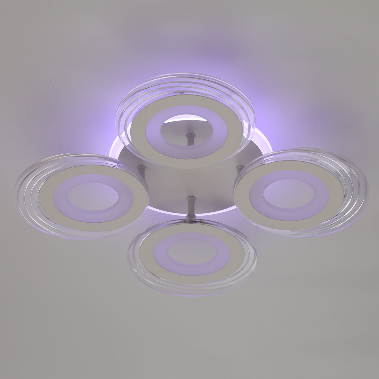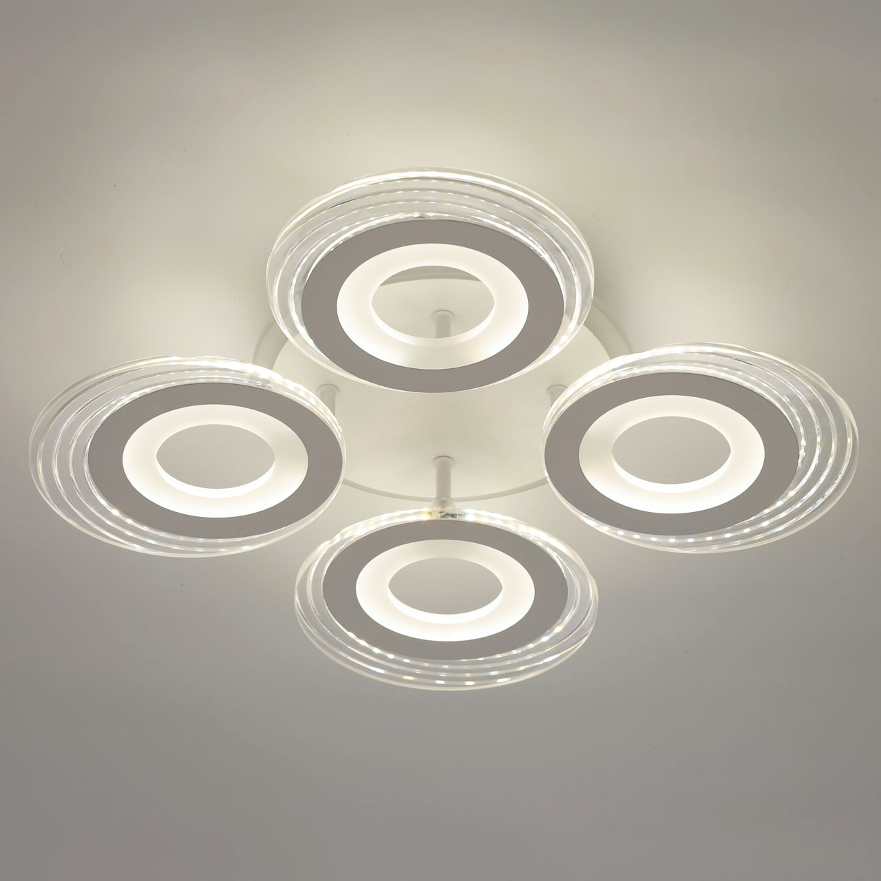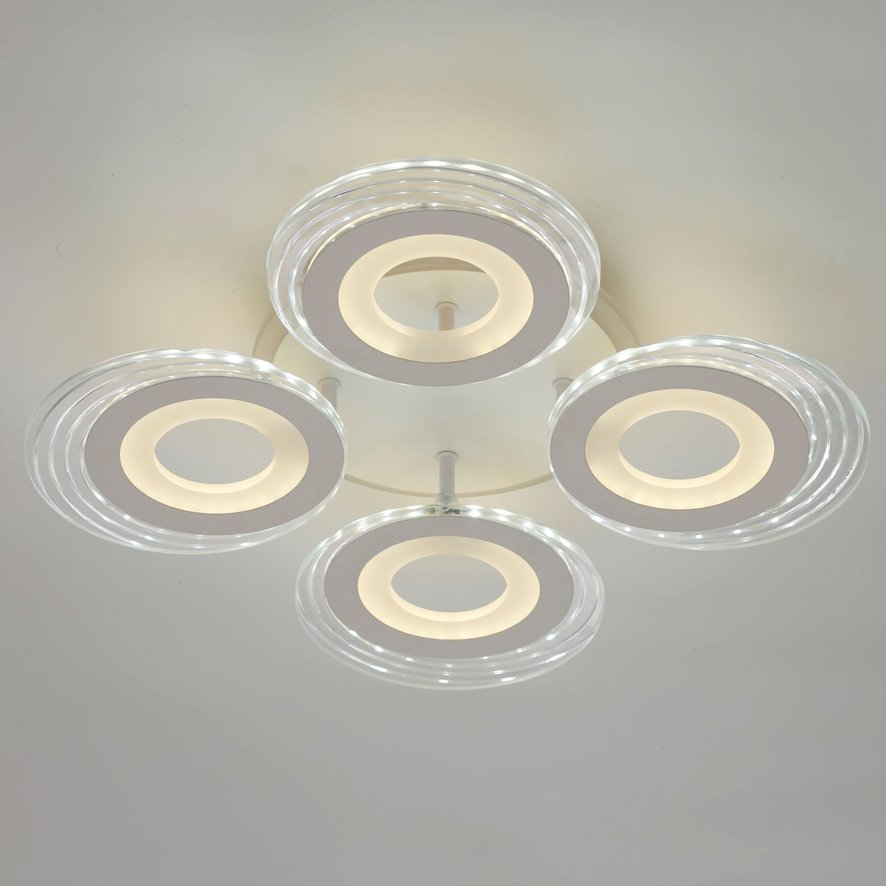 Металлическое основание светильника окрашено в белый цвет. Каркас плафона выполнен из сплава алюминия с цинком и окрашен в цвет основания. Светодиодные источники света закрыты белым матовым и прозрачным акрилом. Дополнительно, в светильнике предусмотрена подсветка потолочной чаши. Светильник приходит в состоянии частичной сборки в компактной упаковке: вся электрика подсоединена, достаточно закрепить плафоны на корпусе.