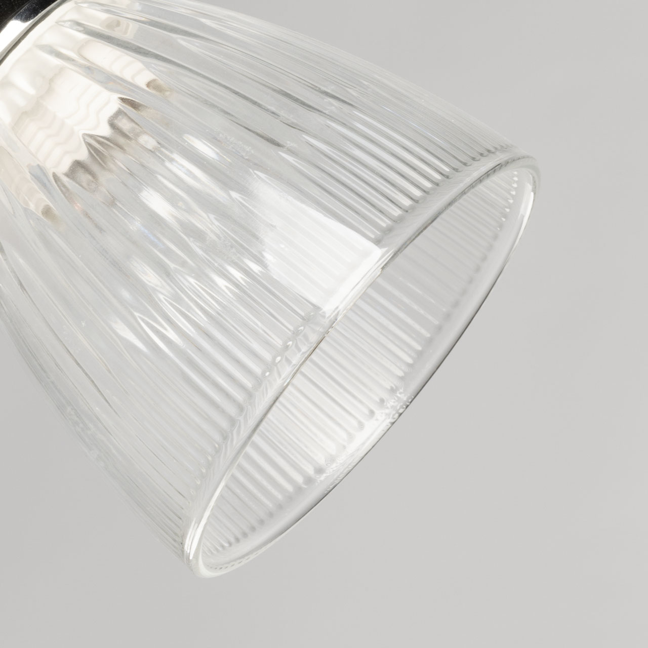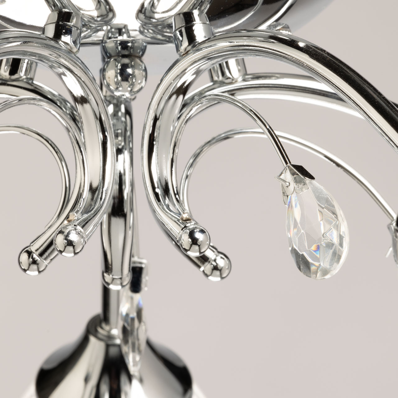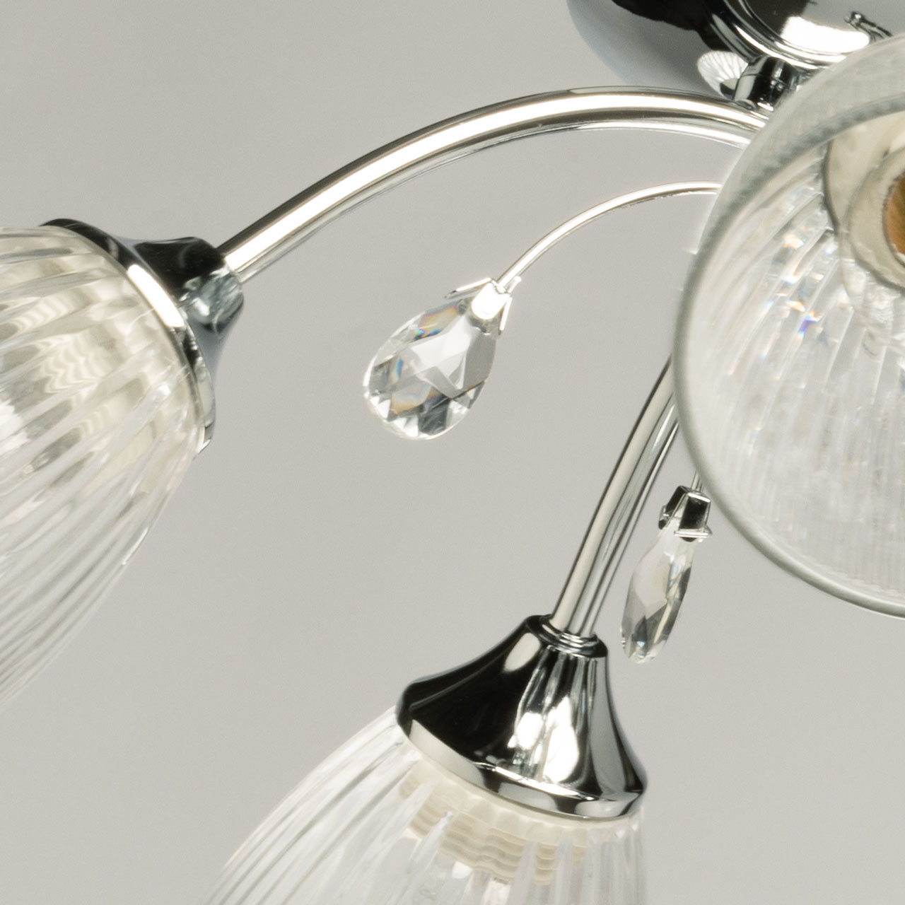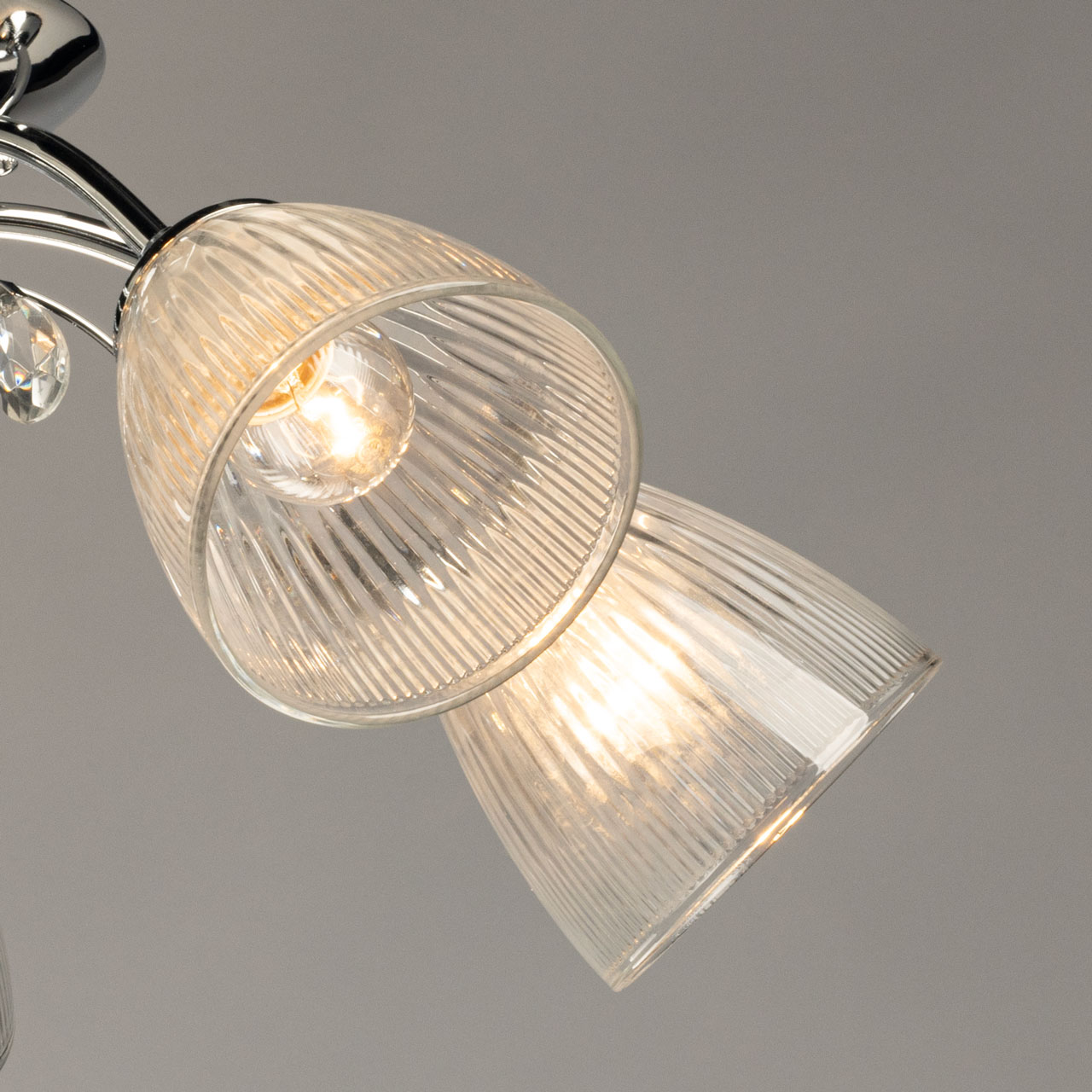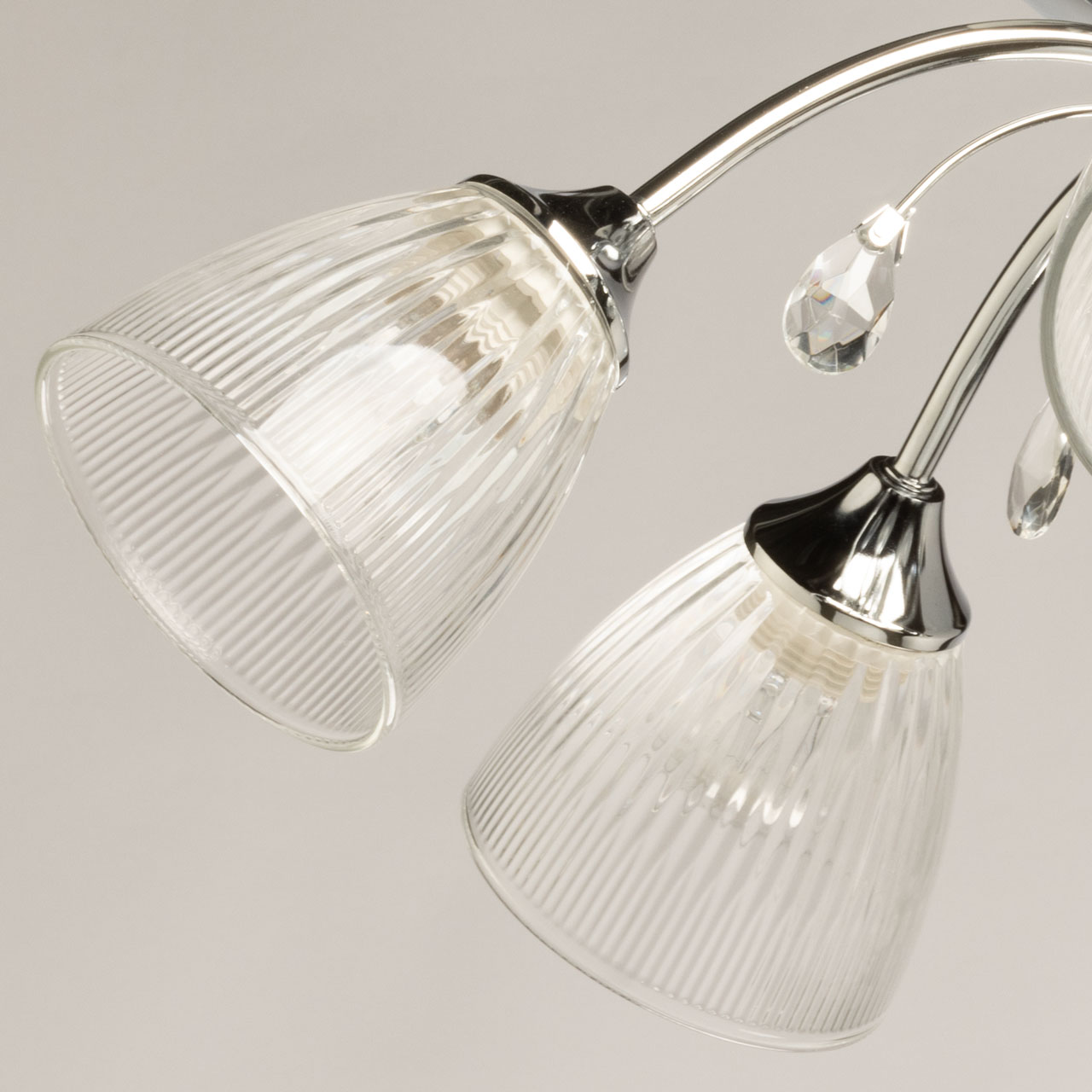 Металлическое основание потолочной люстры гальванизировано в цвет хрома. Прозрачные стеклянные плафоны с линейной фактурой отлиты в форму. Люстра декорирована элементами из прозрачного хрустального стекла.