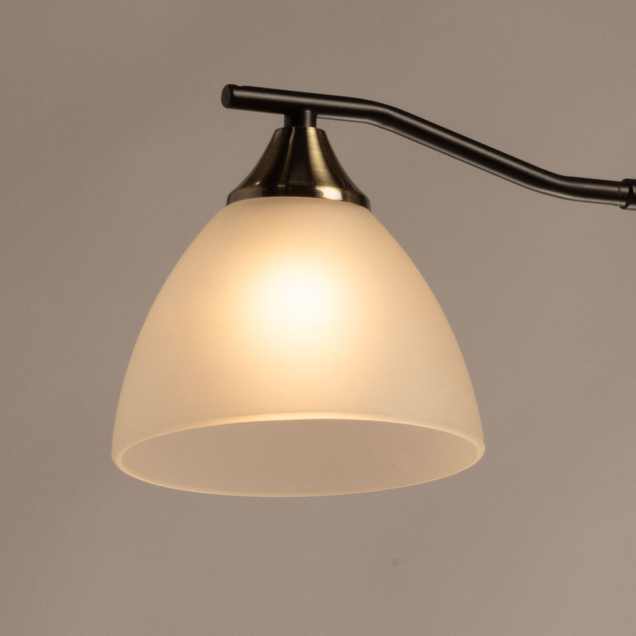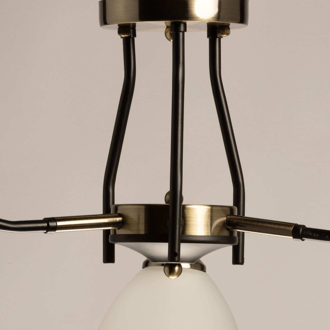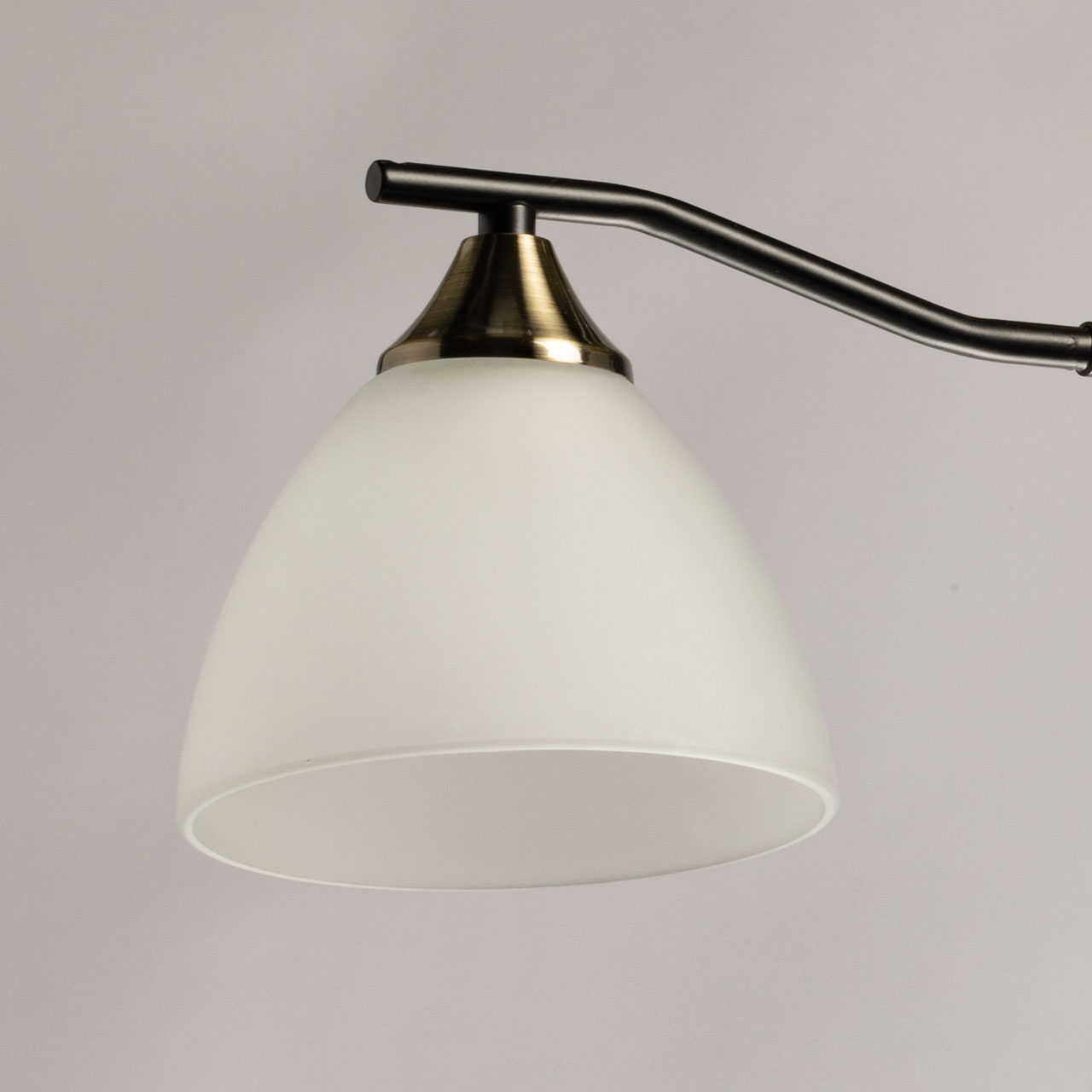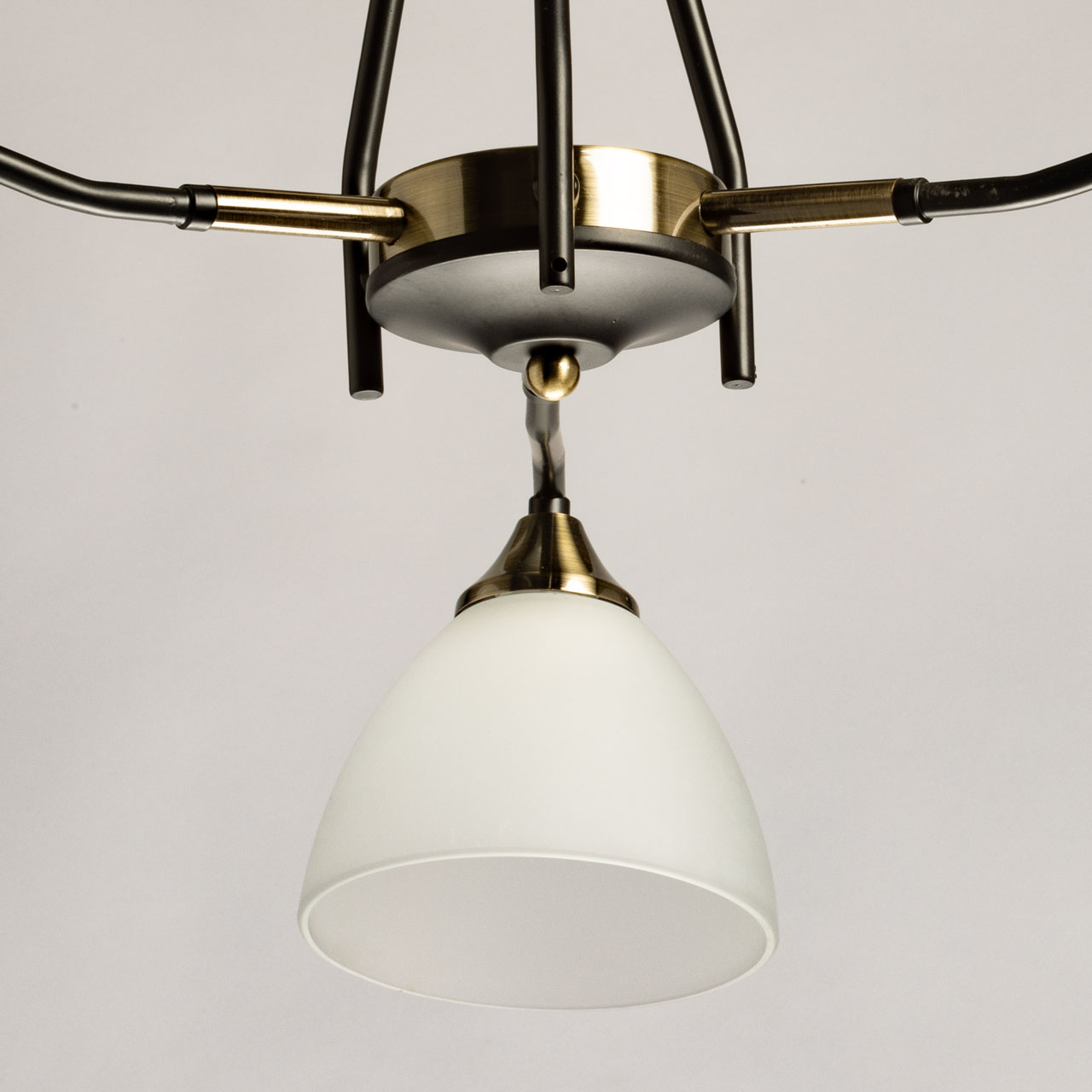 Основание светильника выполнено из металла и окрашено в черный цвет. Отдельные элементы основания гальванизированы в цвет античной бронзы. Стеклянные плафоны отлиты в форму и окрашены в белый цвет изнутри.