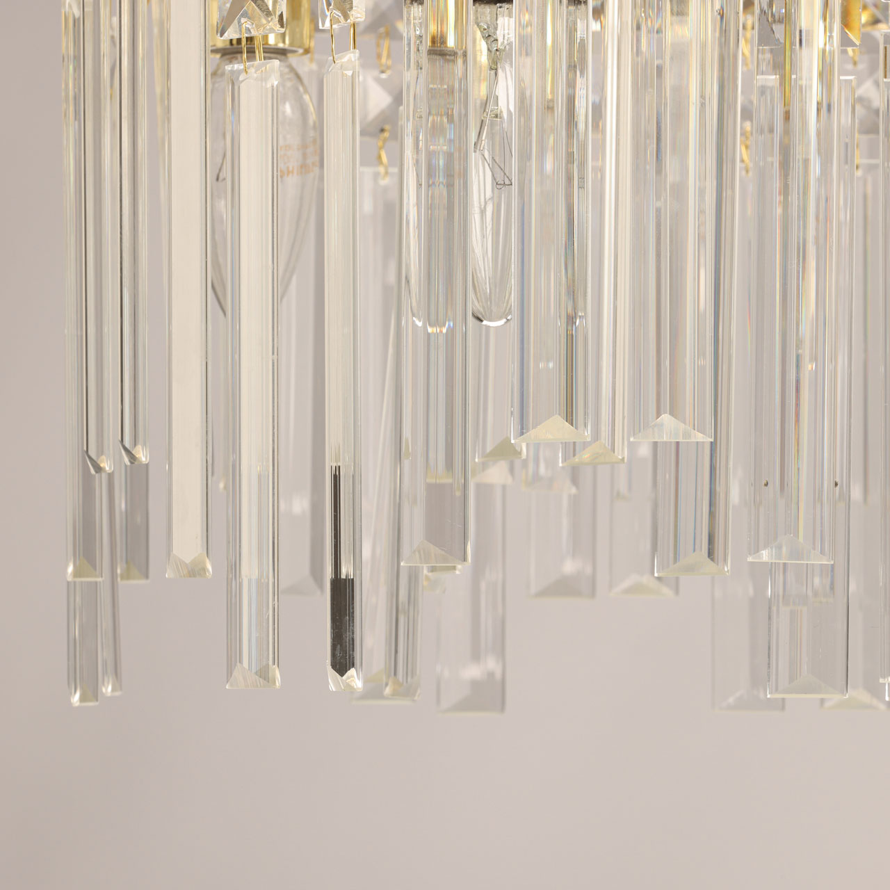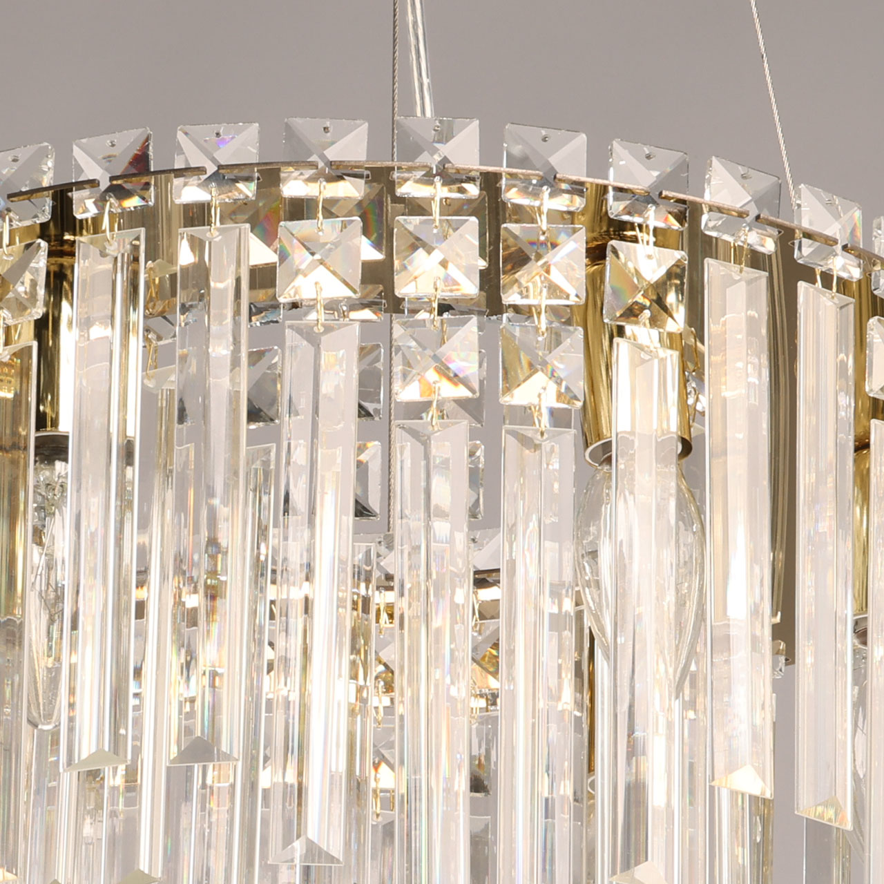 Металлическое основание люстры гальванизировано в цвет золота. Светильник декорирован прозрачным хрусталем вытянутой и квадратной формы.