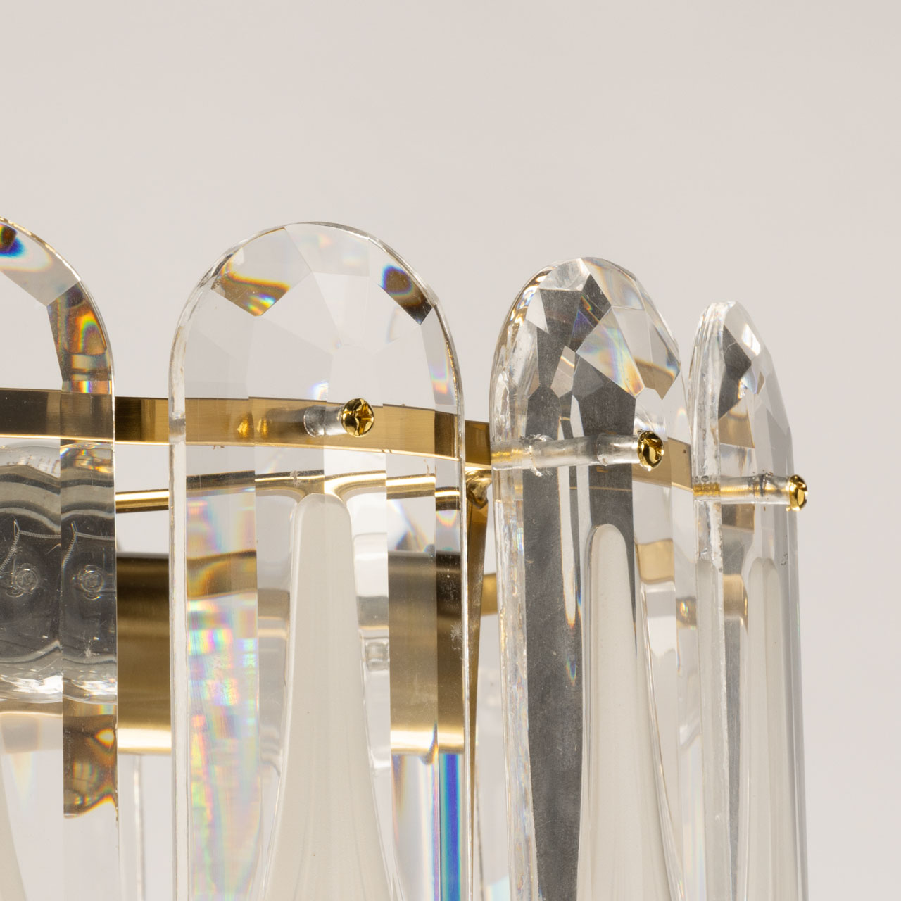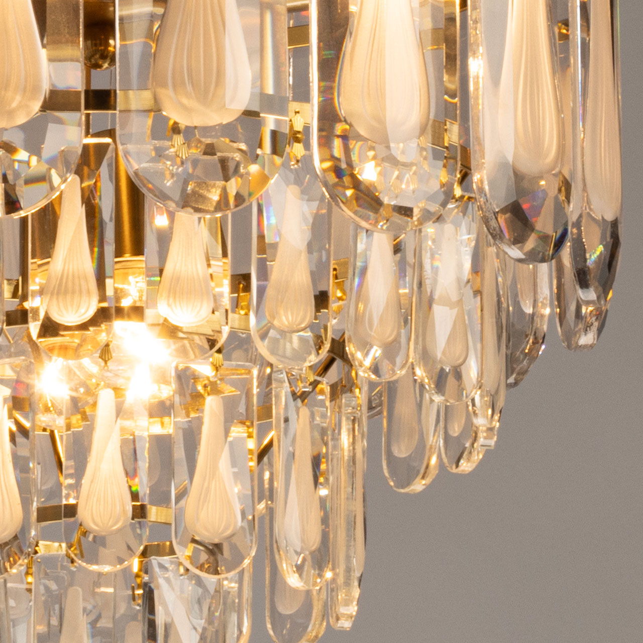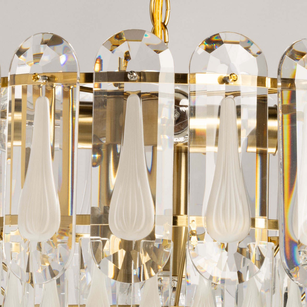 Металлическое основание подвесной люстры гальванизировано в цвет латуни. Люстра декорирована хрустальными прозрачными фактурными пластинами сложной огранки.