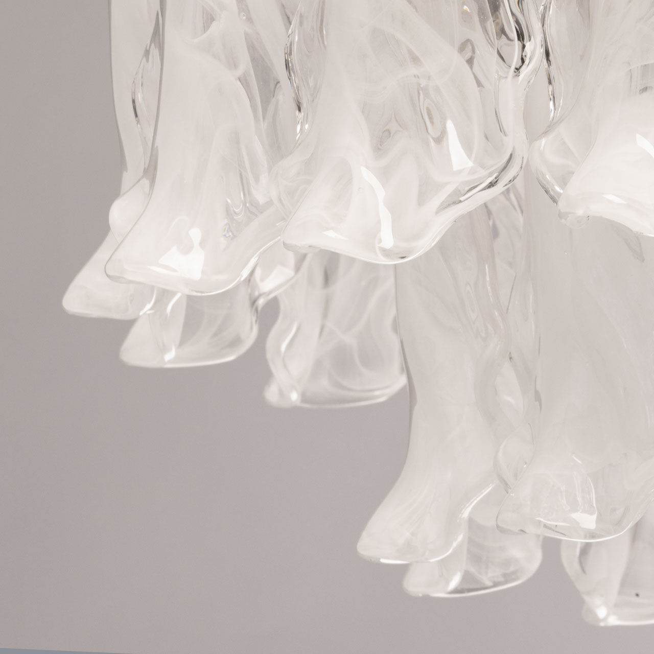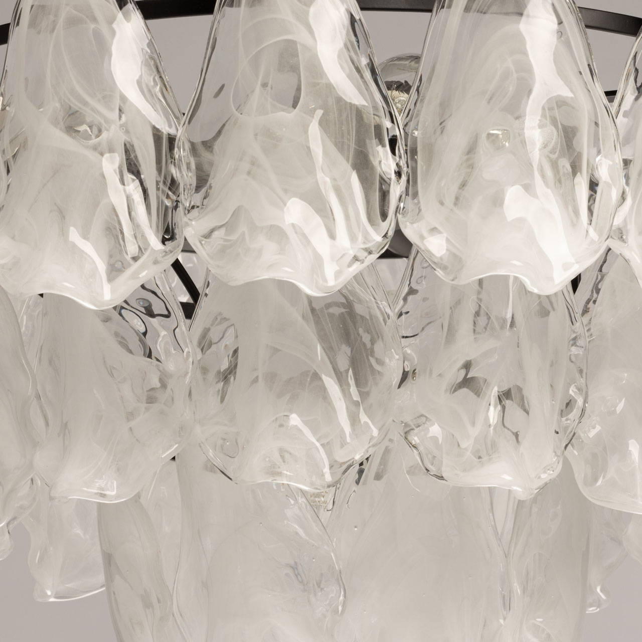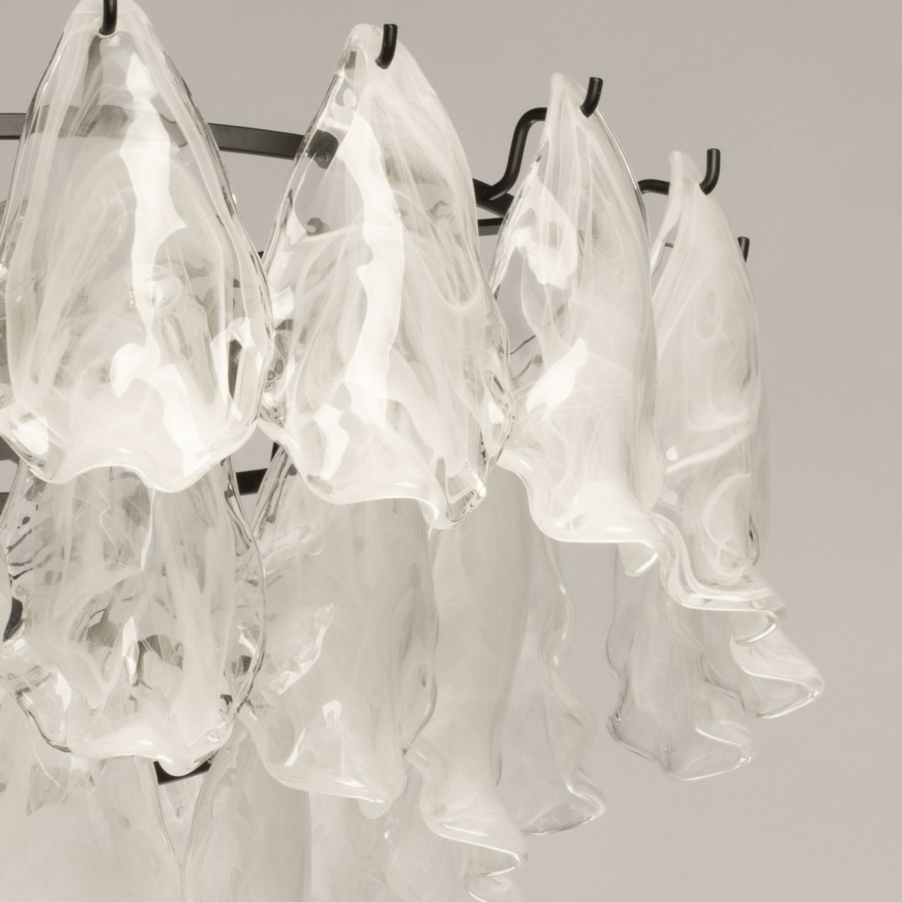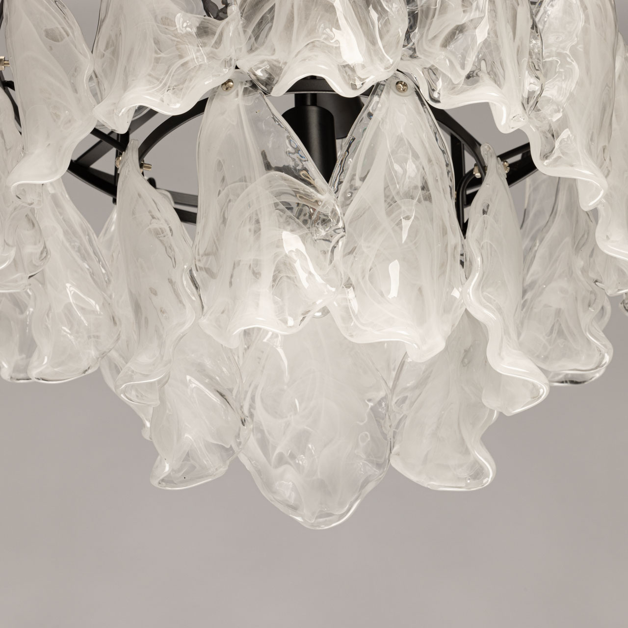 Металлическое основание подвесной люстры окрашено в черный цвет. Светильник декорирован стеклянными пластинами в форме листьев с имитацией под алебастровое стекло.