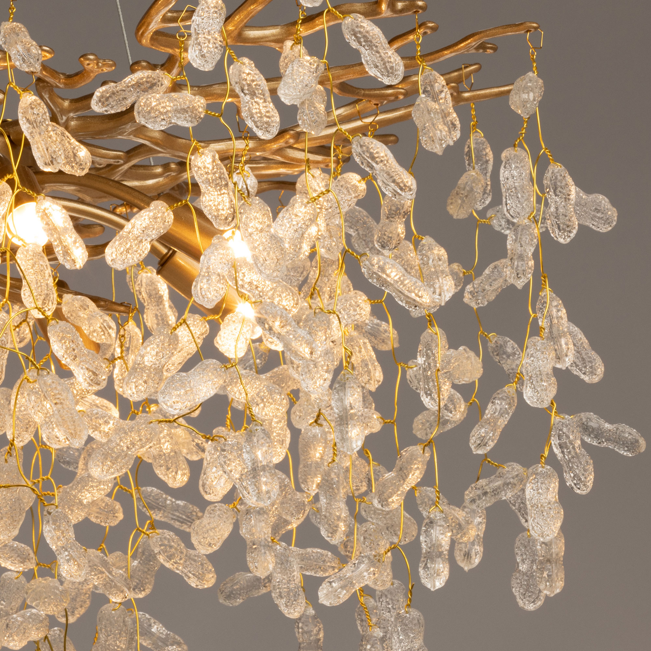 Основание подвесной люстры из сплава алюминия с цинком окрашено в цвет золота. Люстра декорирована матовым фактурным стеклом вытянутой формы.