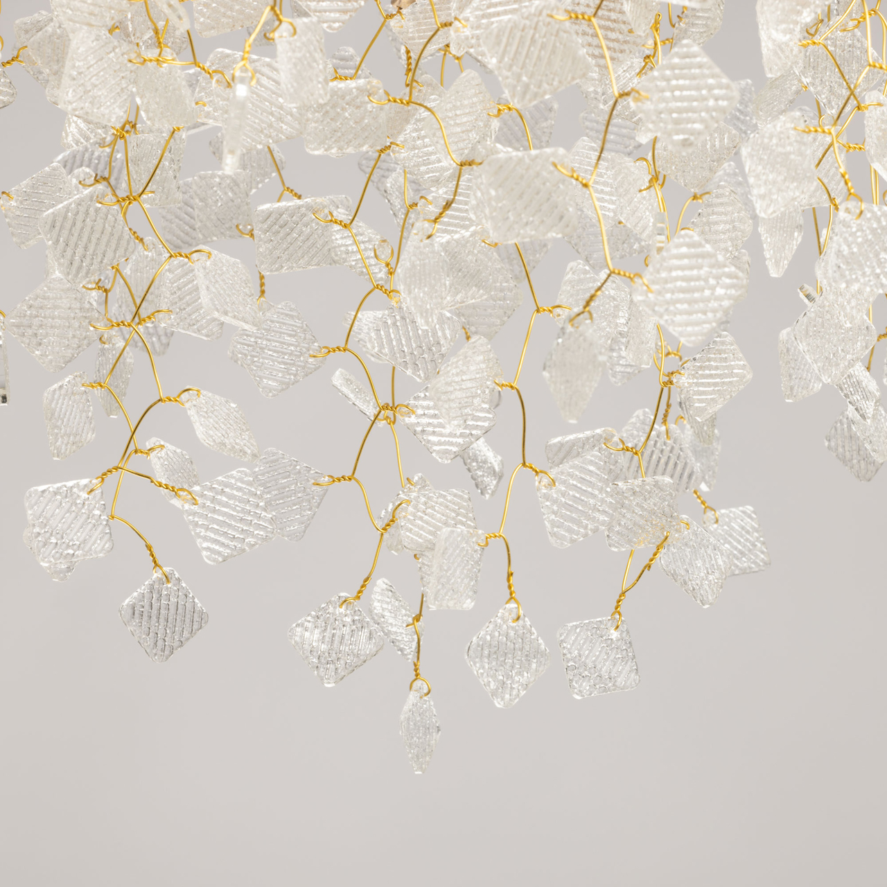 Основание подвесной люстры из сплава алюминия с цинком окрашено в цвет золота. Люстра декорирована прозрачным фактурным стеклом квадратной формы.