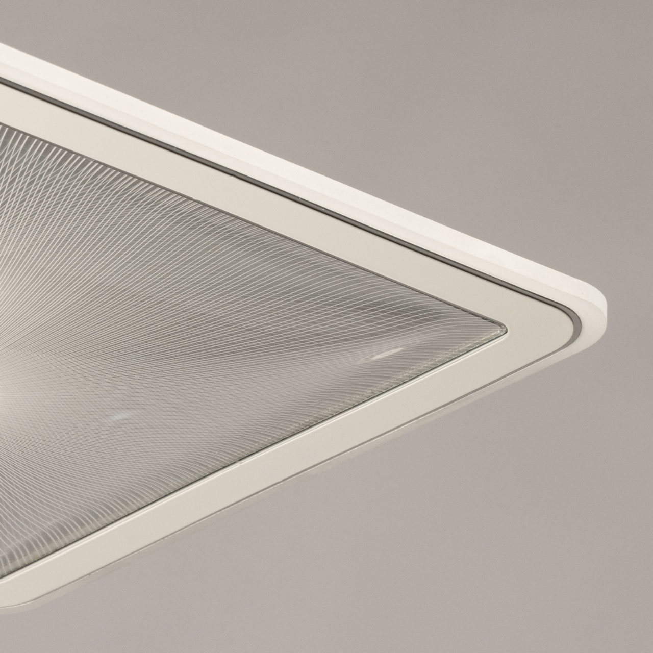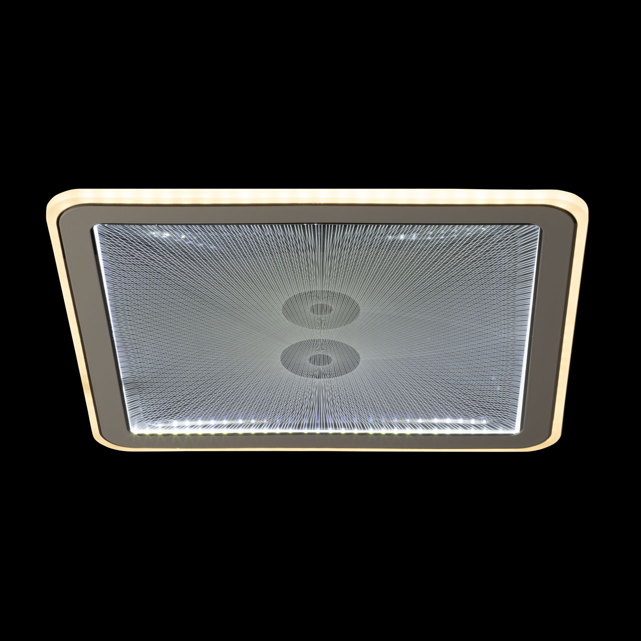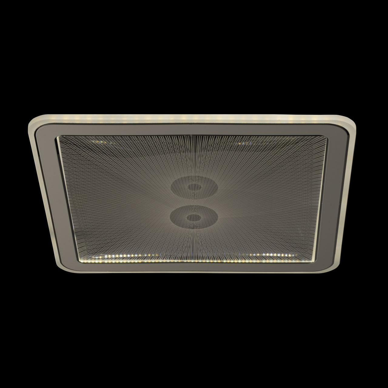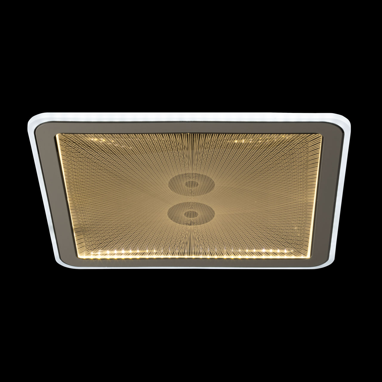 Металлическое основание светильника окрашено в белый цвет. Плафон выполнен из сплава алюминия с цинком и окрашен в цвет серебра. Светодиодные источники света закрыты белым матовым акрилом. Потолочная люстра декорирована металлической пластиной, гальванизированной в цвет хрома и прозрачным акрилом с 3D-эффектом.
