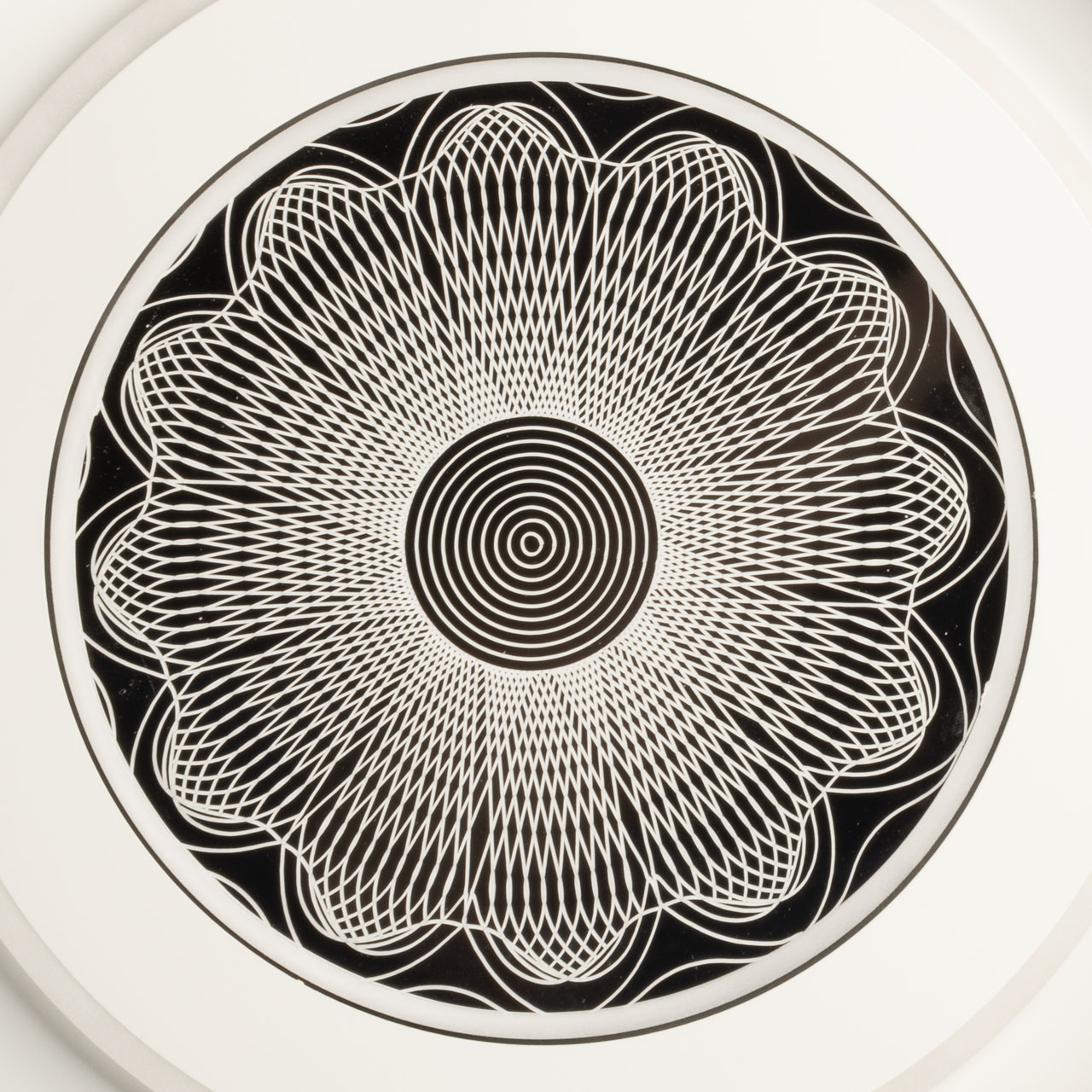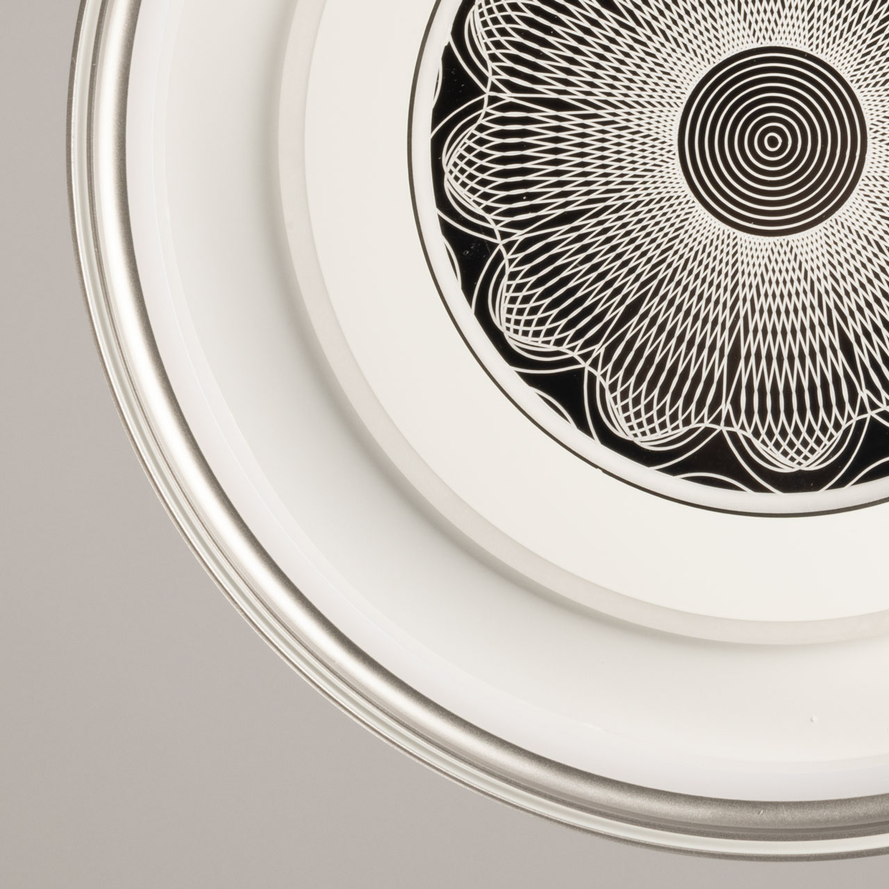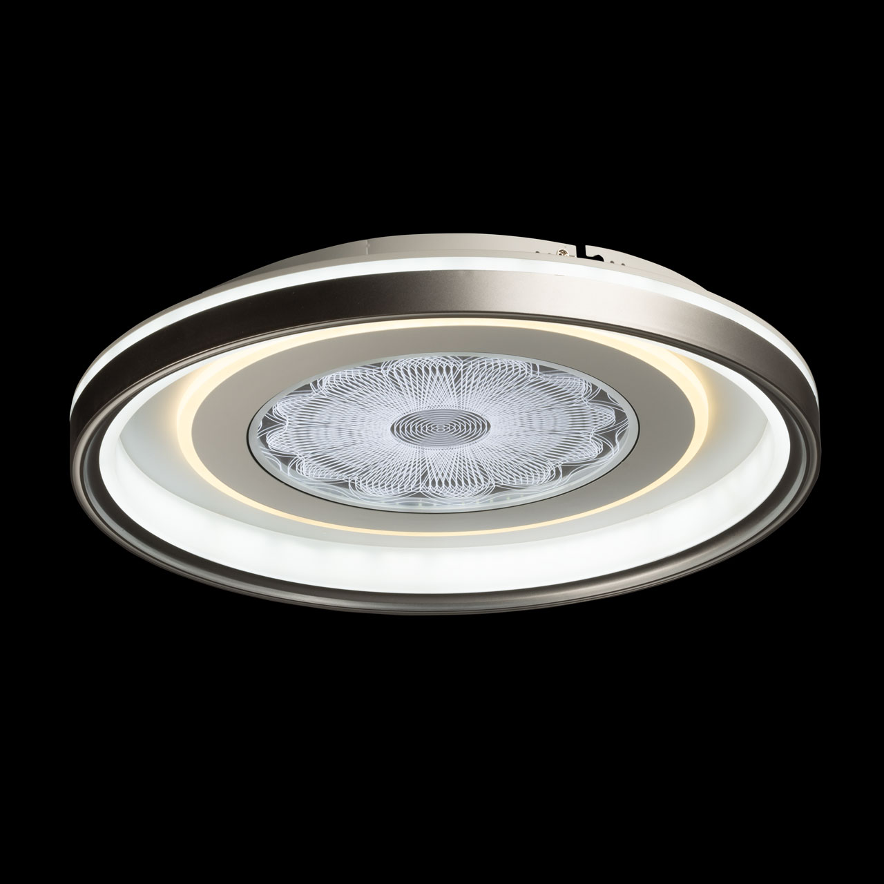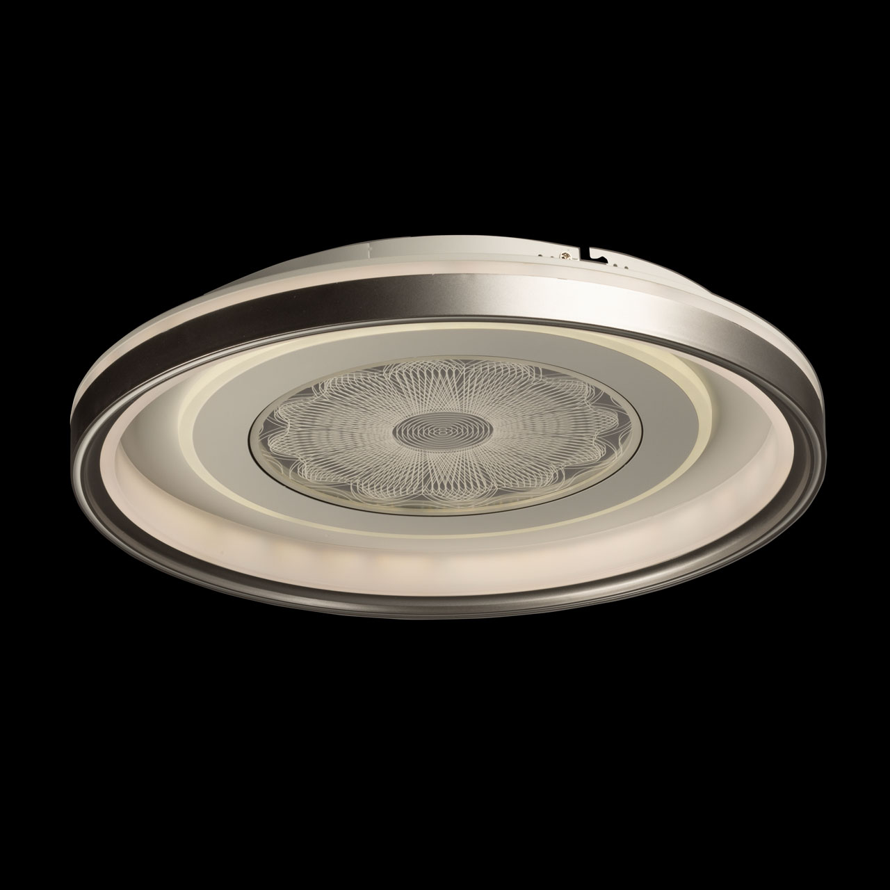 Металлическое основание потолочной люстры окрашено в белый цвет. Корпус плафона выполнен из сплава алюминия с цинком и окрашен в серебряный и белыйцвет. Светодиодные источники света закрыты прозрачным акрилом с 3D-эффектом. Светодиоды по периметру плафона закрыты матовым акрилом