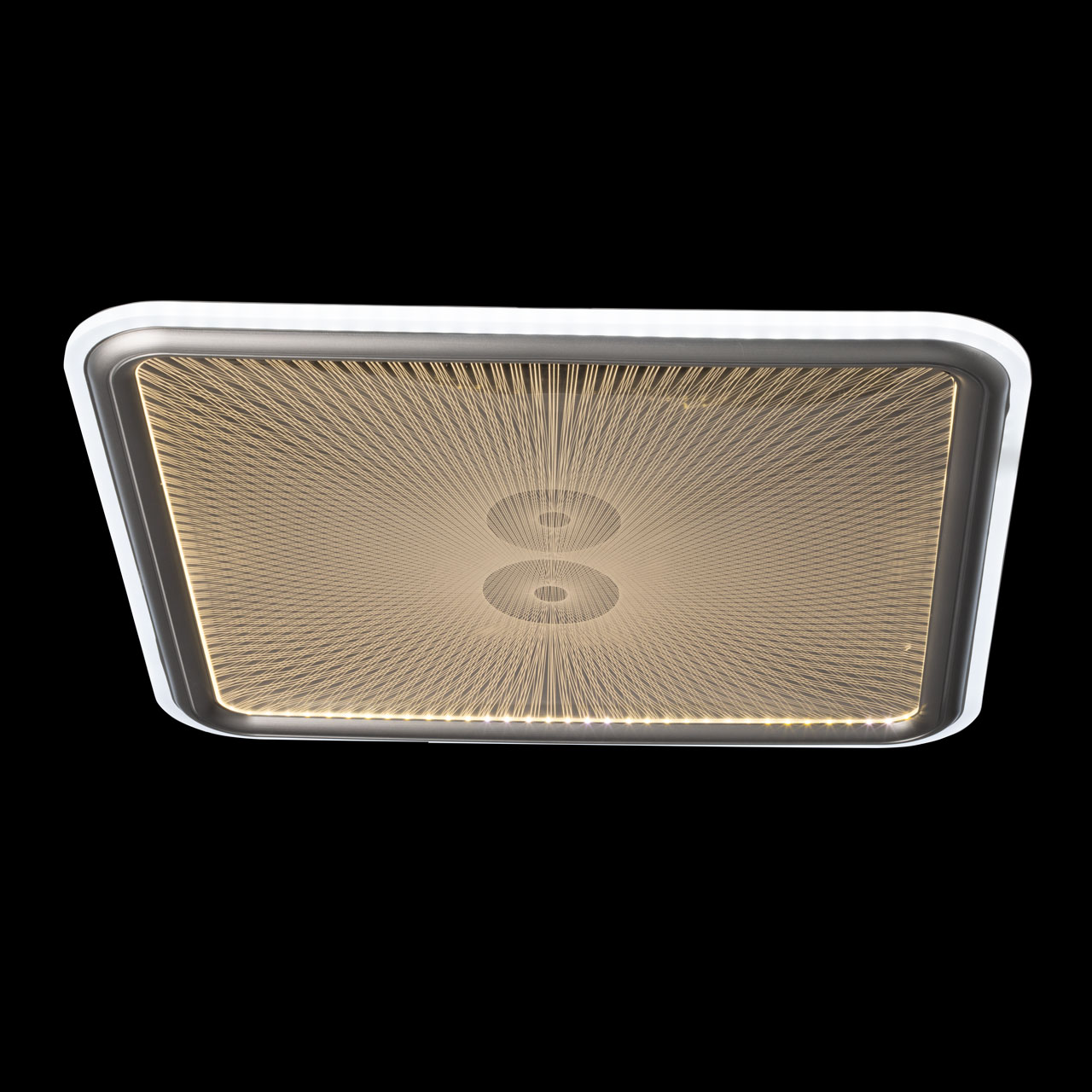 Металлическое основание светильника окрашено в белый цвет. Плафон выполнен из сплава алюминия с цинком и окрашен серый цвет. Светодиодные источники света закрыты белым матовым акрилом. Потолочная люстра декорирована металлической пластиной, гальванизированной в цвет хрома и прозрачным акрилом с 3D-эффектом.