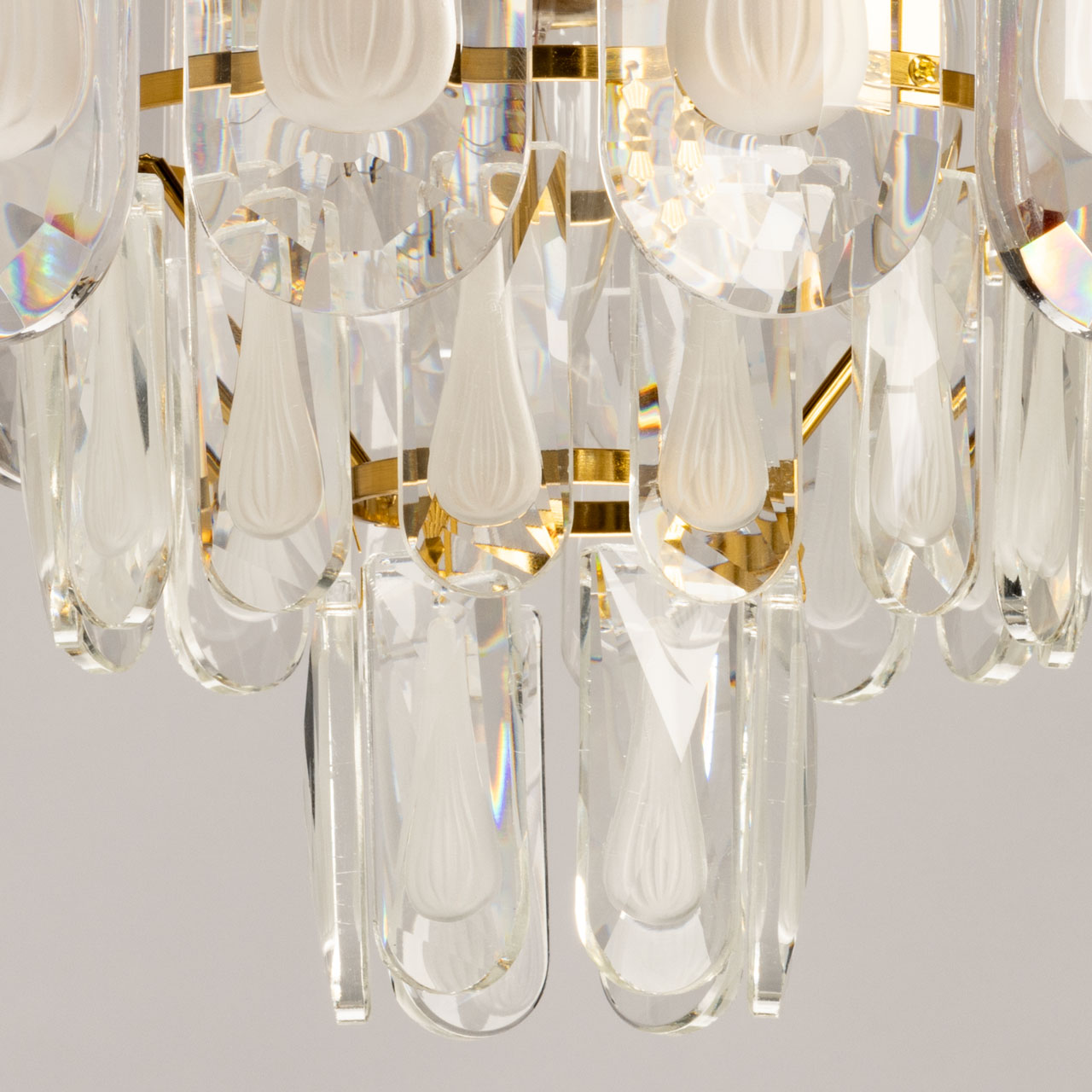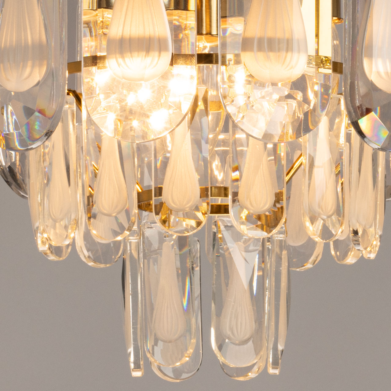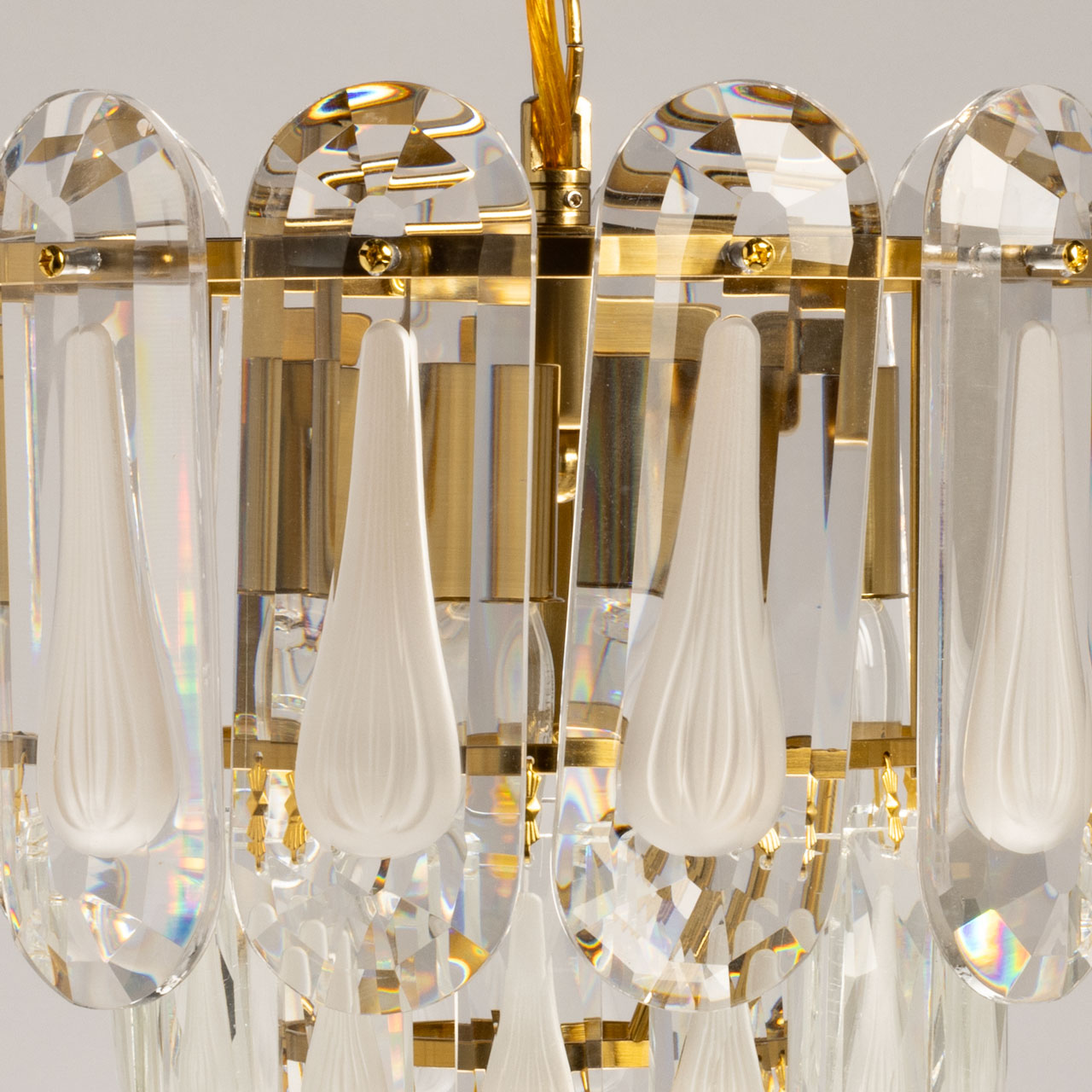 Металлическое основание подвесной люстры гальванизировано в цвет латуни. Люстра декорирована хрустальными прозрачными фактурными пластинами сложной огранки.