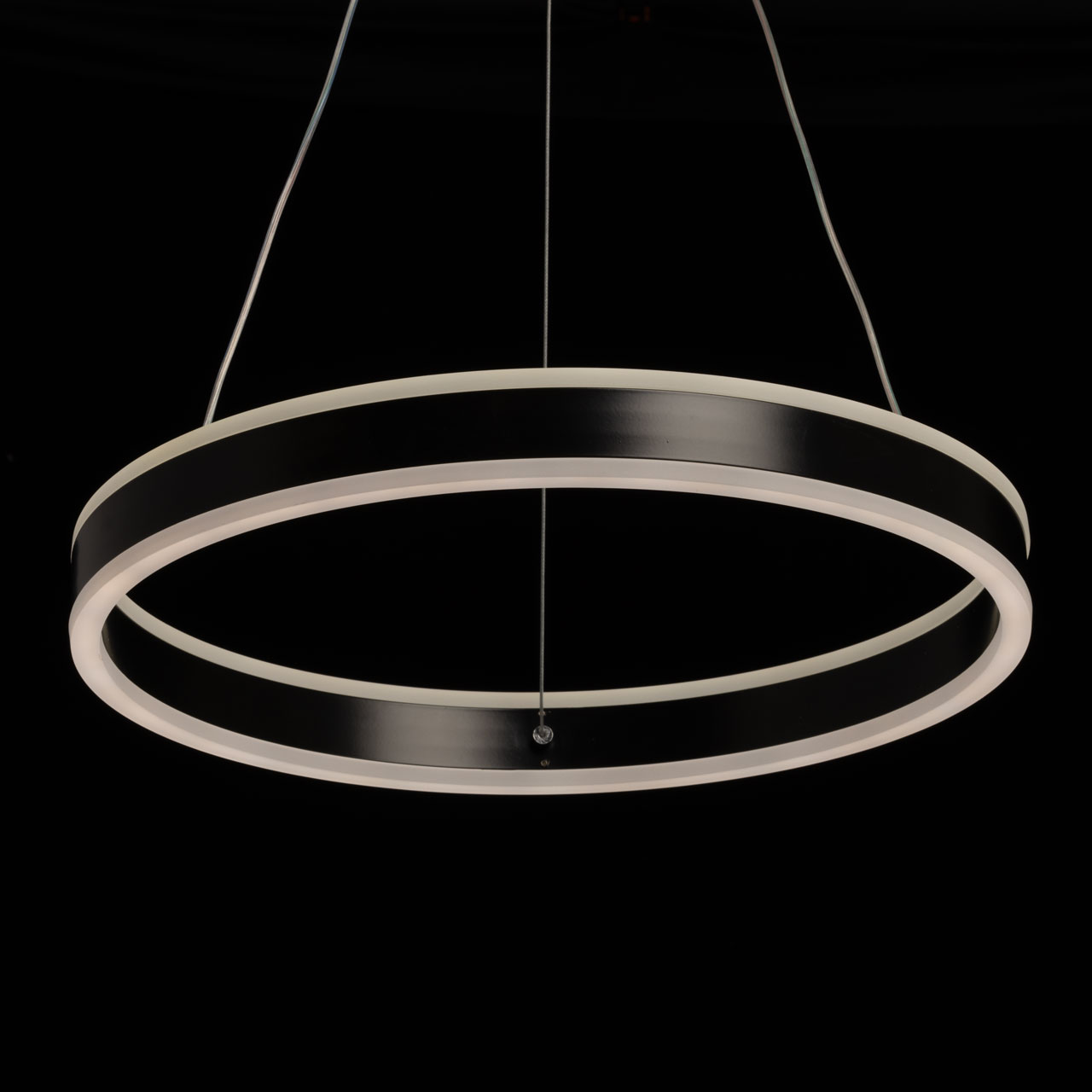 Металлическое основание подвесной люстры окрашено в черный цвет. Плафон люстры выполнен из сплава алюминия с цинком и окрашен в цвет основания. Светодиодные источники света закрыты белым матовым акрилом.