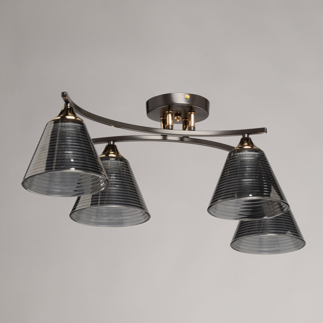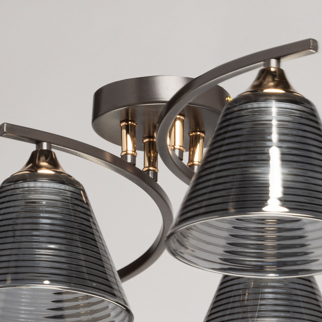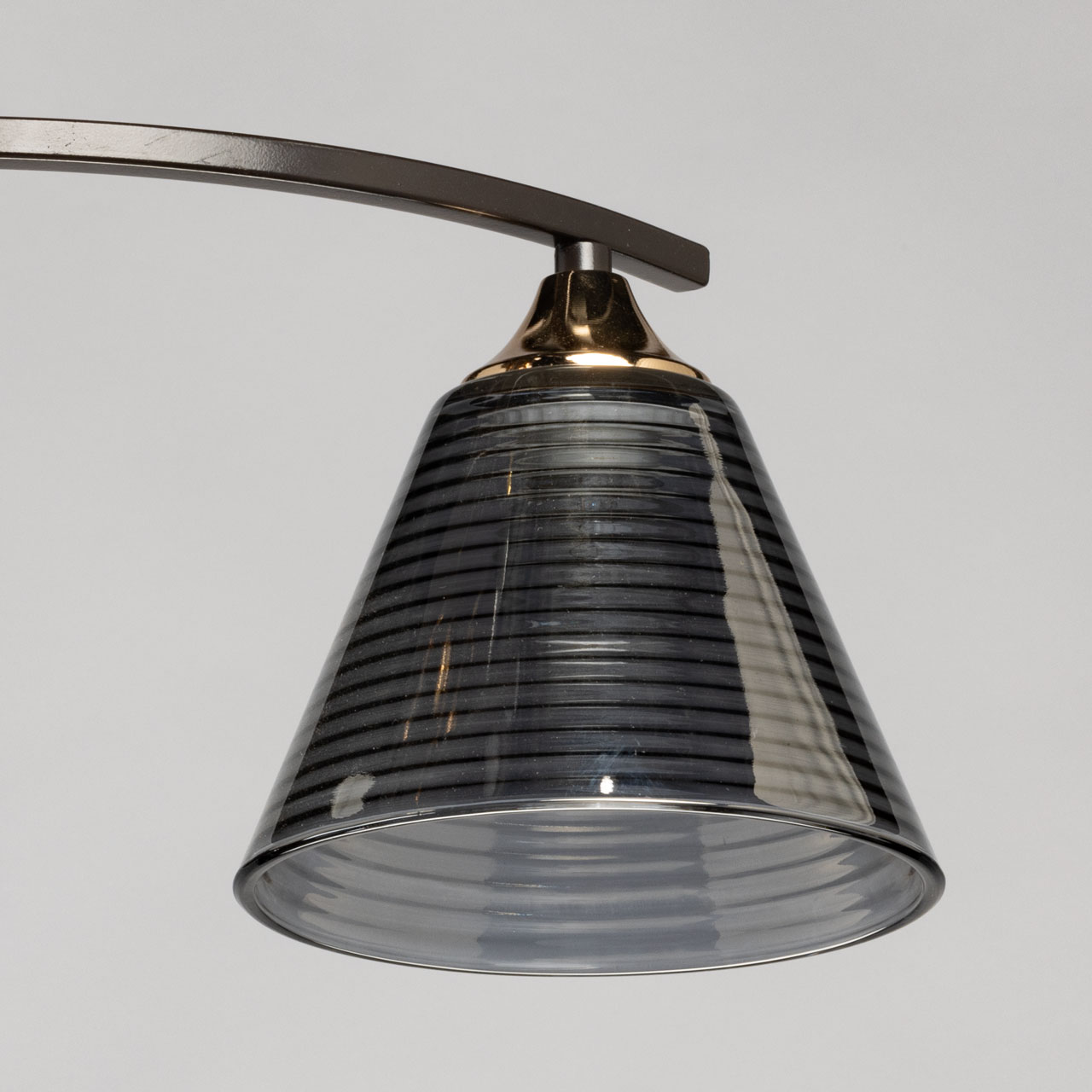 Основание светильника выполнено из металла и окрашено в цвет кофе. Отдельные элементы основания гальванизированы в цвет золота. Стеклянные плафоны отлиты в сложную форму с внутренней текстурой и гальванизированы в дымчатый цвет.