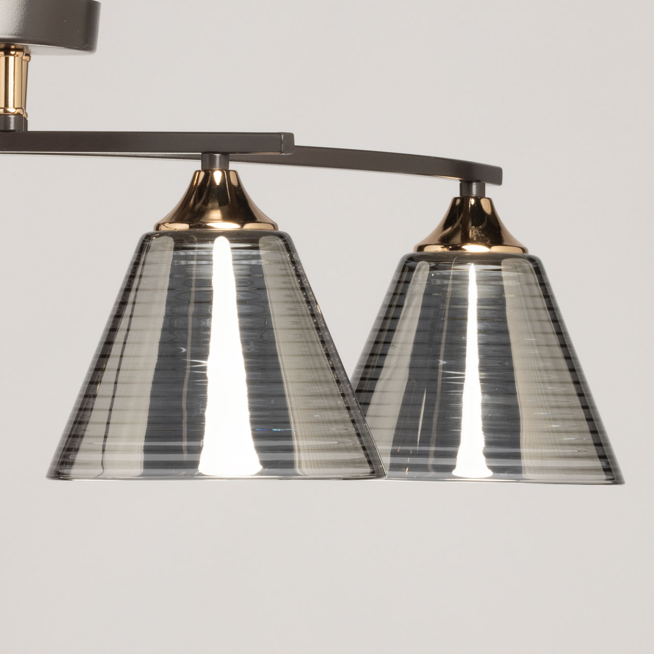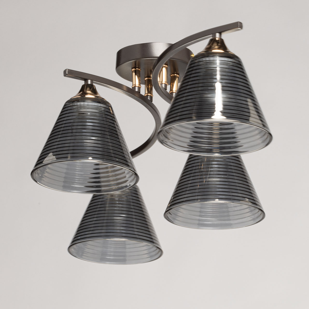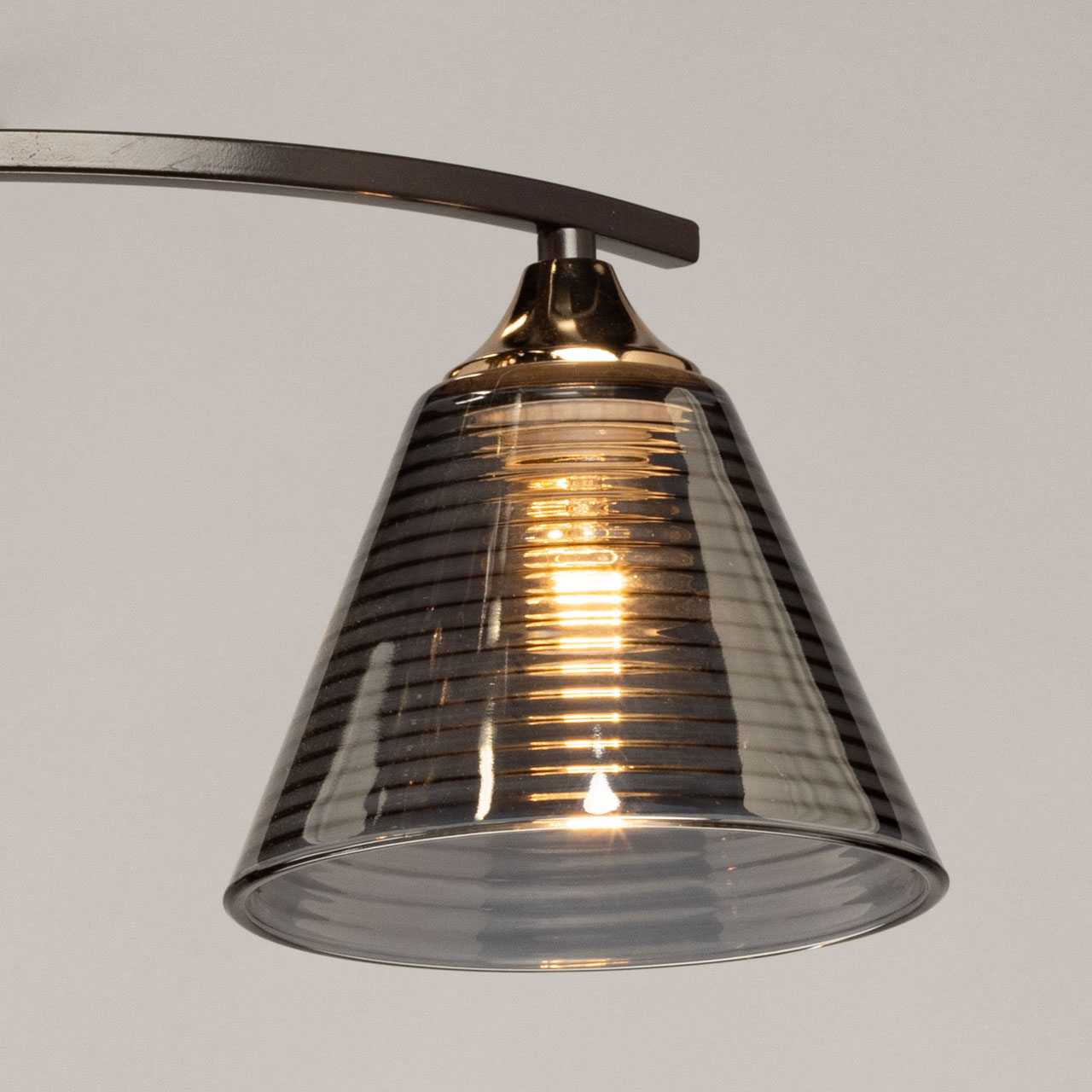 Основание светильника выполнено из металла и окрашено в цвет кофе. Отдельные элементы основания гальванизированы в цвет золота. Стеклянные плафоны отлиты в сложную форму с внутренней текстурой и гальванизированы в дымчатый цвет.
