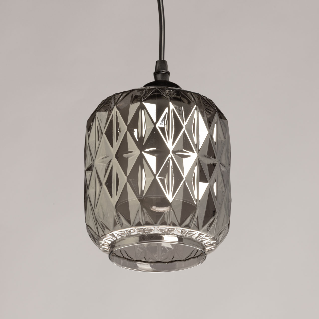 Металлическое основание окрашено в черный цвет. Традиционный источник света закрыт стеклянным фактурным плафоном, гальванизированным в дымчатый цвет.