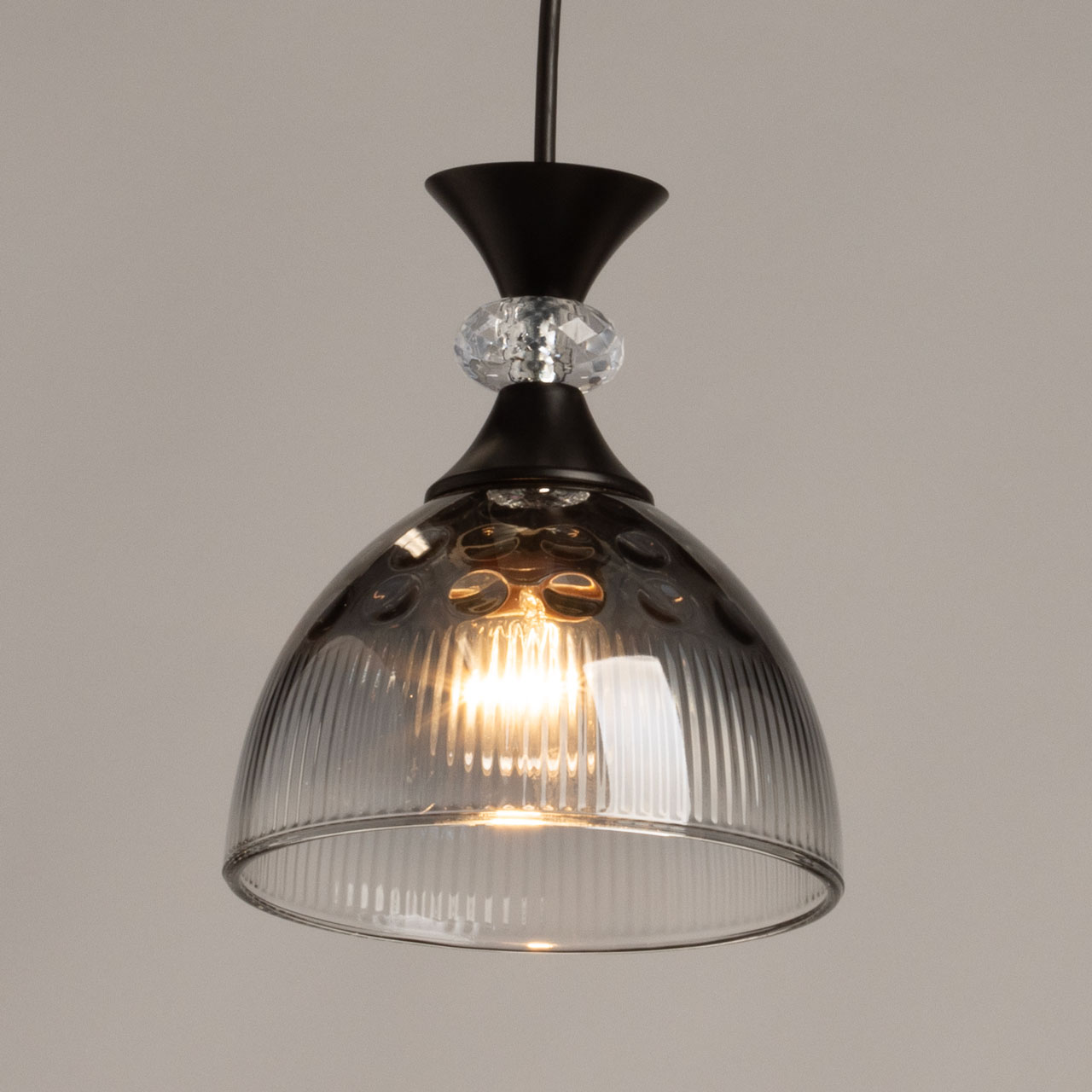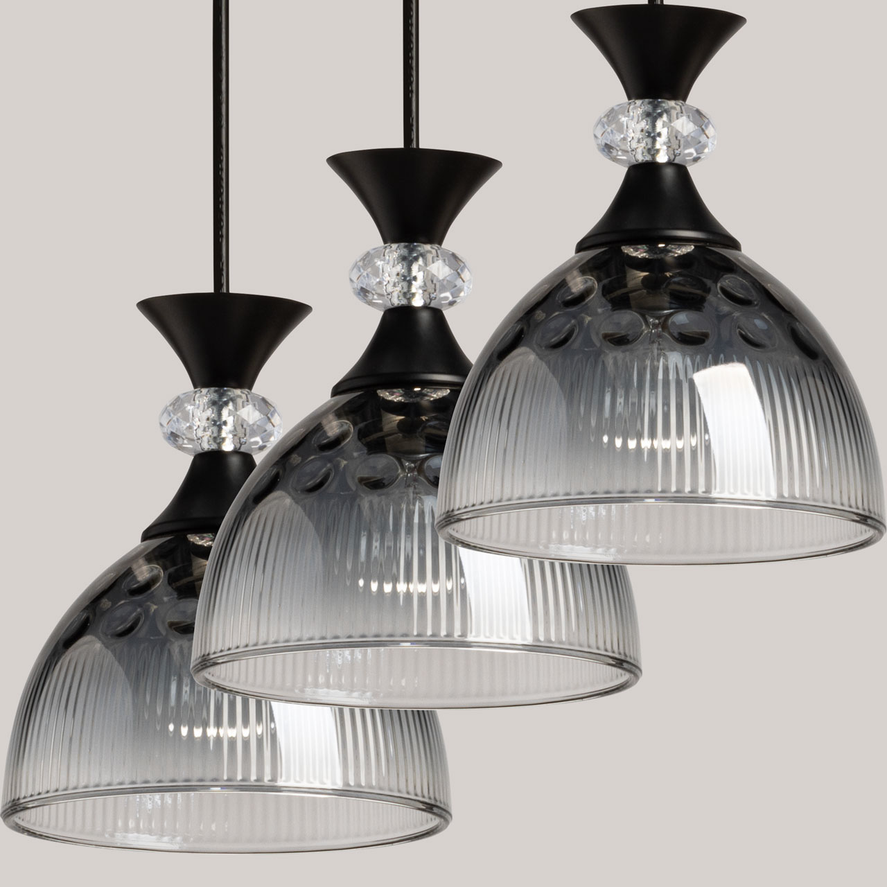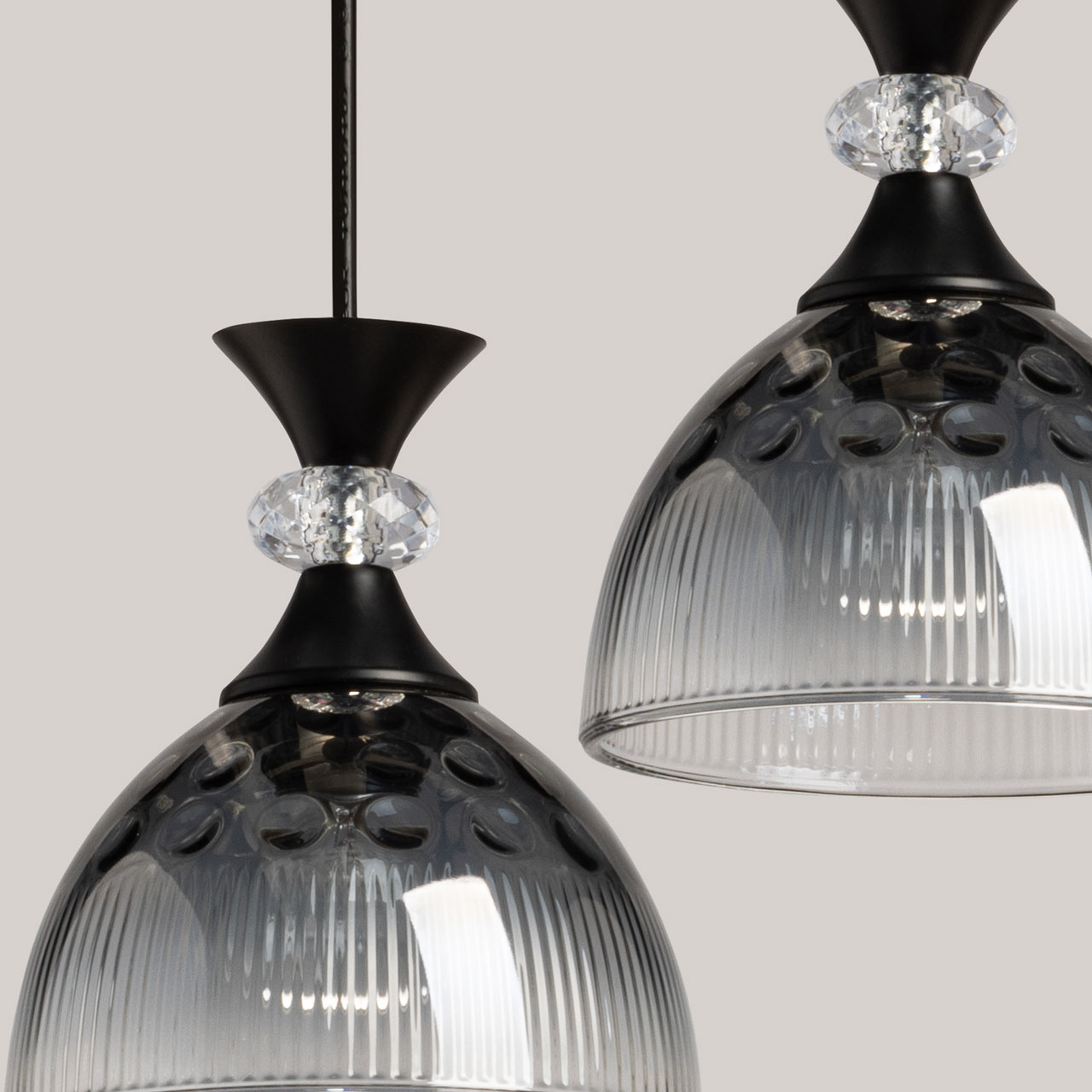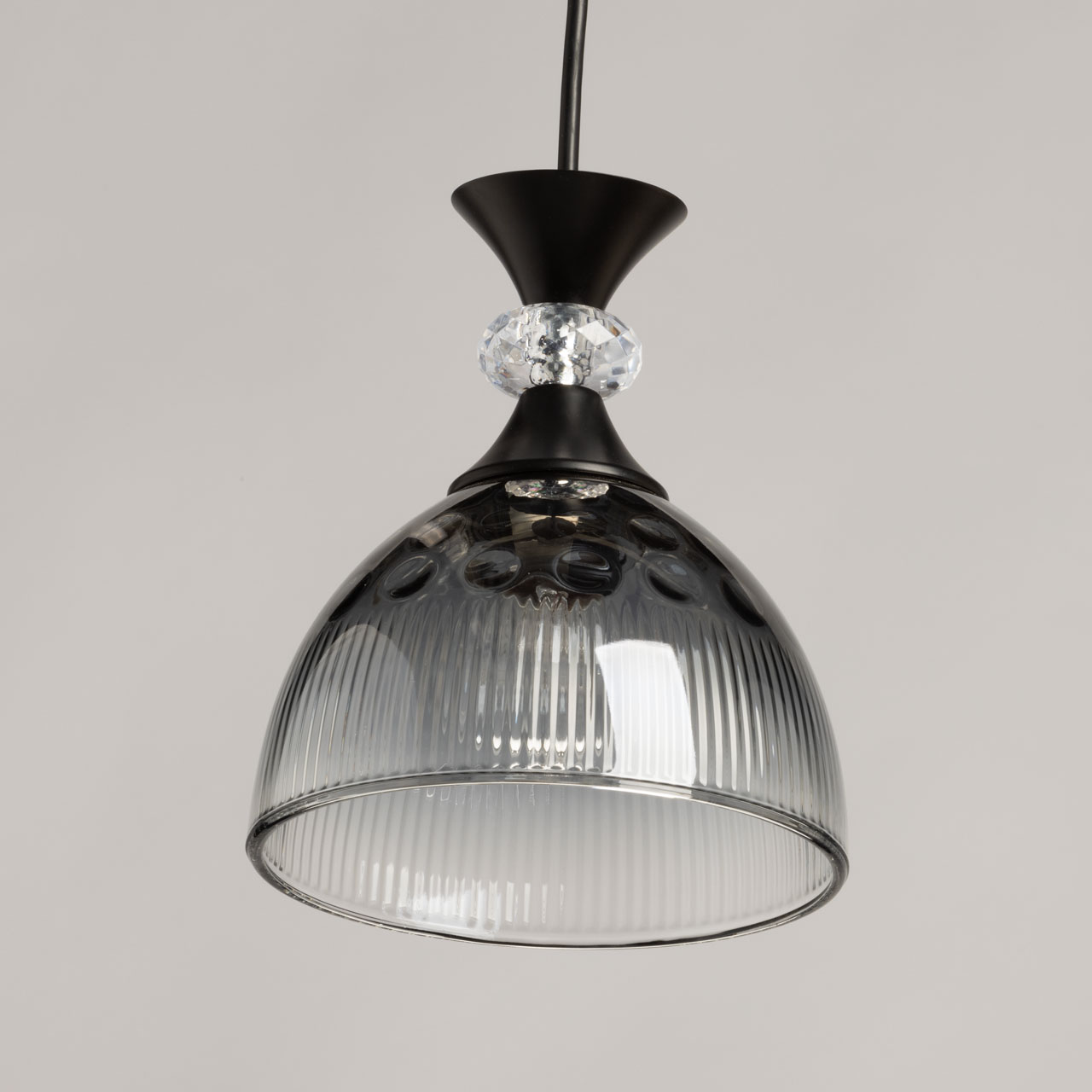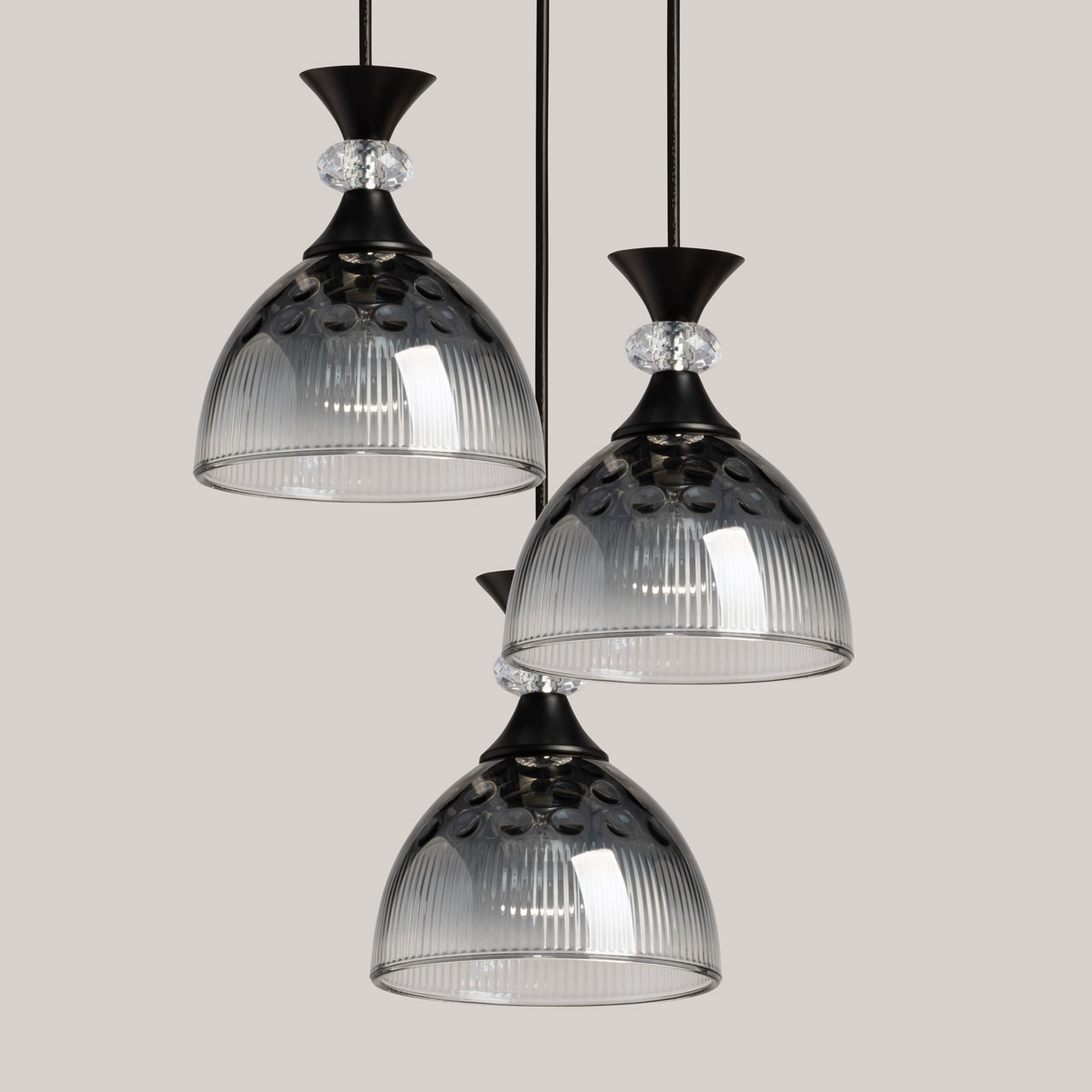 Металлическое основание светильника окрашено в черный цвет. Стеклянные плафоны отлиты в сложную форму и гальванизированы в дымчатый цвет с эффектом градиента от темного к светлому. Декоративный элемент на подвесе выполнен из акрила.
