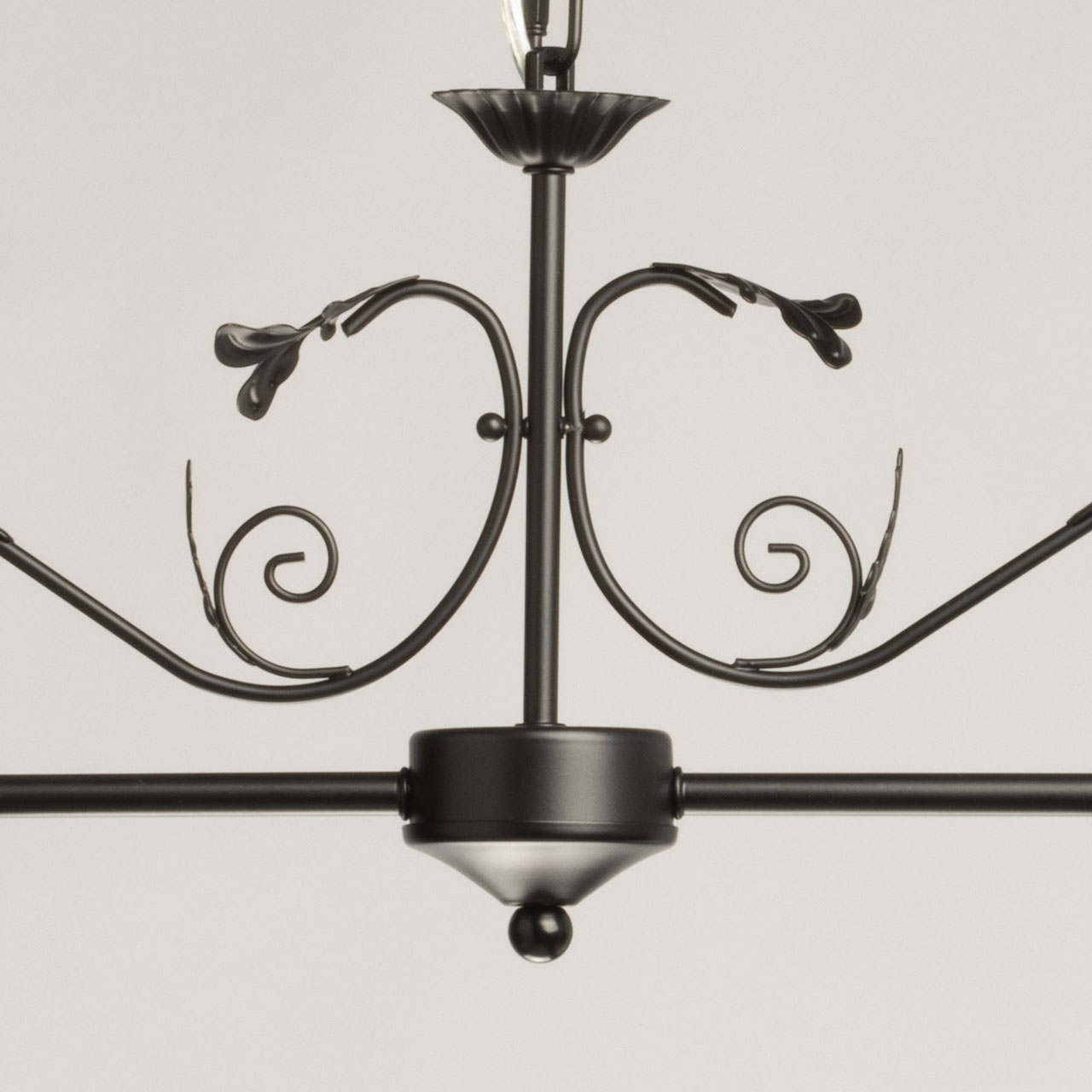 Металлический подвесной светильник идеально подойдет для освещения загородного дома в английском стиле или апартаментов в стиле лофт. Два плафона из металла, окрашенного в черный цвет, закреплены на фигурном кованом основании. В качестве подвеса служит цепь, что позволяет регулировать высоту светильника. Люстра создаст романтическую атмосферу уютным вечером у камина, подойдет для оформления кабинета или библиотеки.