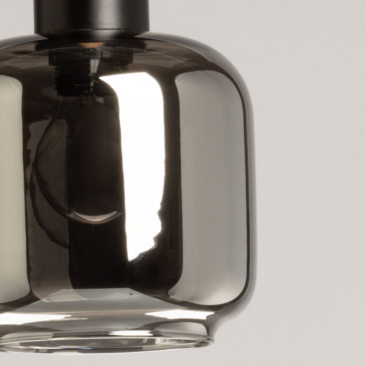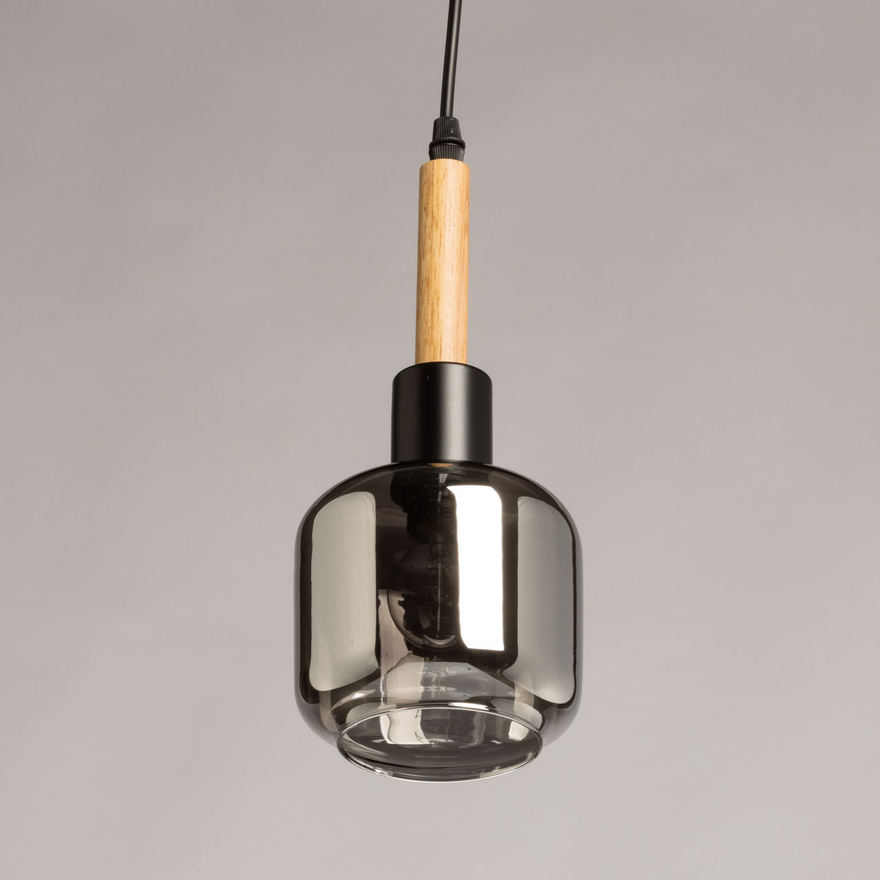 Металлическое основание подвесного светильника окрашено в черный цвет. Стеклянный плафон отлит в оригинальную форму и гальванизирован в дымчатый цвет. Подвес декорирован элементом из натурального светлого дерева.