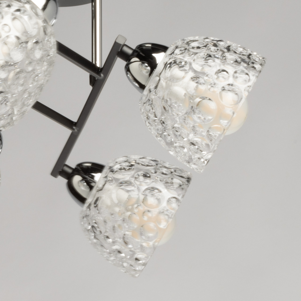 Основание светильника выполнено в форме квадрата из прочного металла, окрашенного в глубокий черный цвет. Этот цвет не только придает изделию строгость и элегантность, но и делает его универсальным элементом, который легко впишется в различные стили интерьера. Плафоны светильника выполнены из прозрачного стекла, отлитого в уникальную форму с текстурным рисунком. Этот интересный дизайн не только добавляет визуального интереса, но и создает эффект игры света и тени, наполняя комнату мягким и уютным светом. Прозрачное стекло позволяет свету свободно проходить, а пузырьковая текстура придает плафонам оригинальность и шарм.Светильник оснащен четырьмя плафонами на шарнирах, что позволяет менять направление света в зависимости от ваших потребностей. Это особенно удобно для создания локального освещения, когда необходимо выделить определенные зоны в комнате, например, рабочую область или угол для чтения. Возможность регулировки направления света делает этот светильник универсальным инструментом для освещения.Цоколь E14 позволяет использовать лампы различной мощности, что дает возможность адаптировать яркость освещения под конкретные задачи. Такой светильник отлично подходит для освещения комнат площадью до 8 кв. метров, что делает его идеальным выбором для небольших помещений.Светильник из коллекции Торес прекрасно вписывается в различные стили интерьера. Его минималистичный дизайн идеально подходит для современных интерьеров в стиле минимализм, где важна простота и функциональность. В то же время, черный металл и текстура стекла делают его отличным дополнением к интерьеру в стиле лофт, где преобладают индустриальные элементы и открытые пространства.