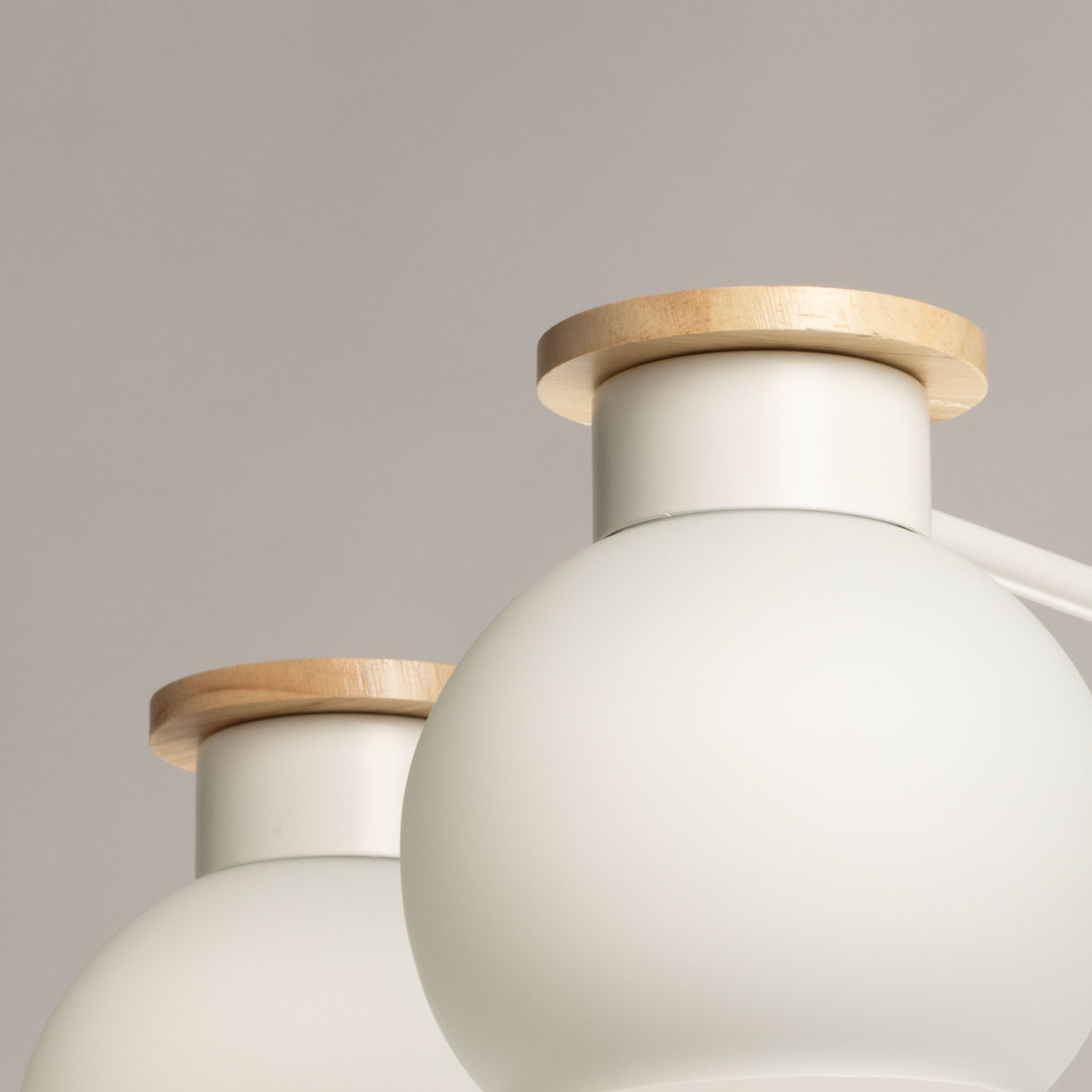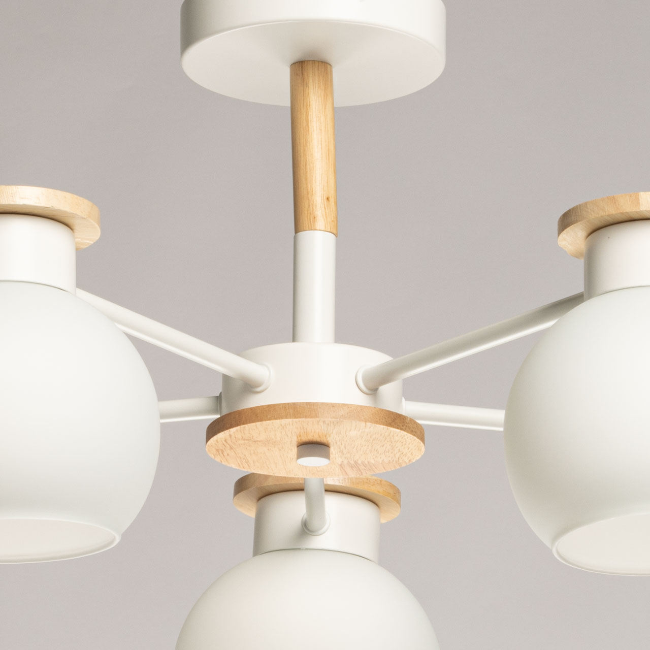 Металлическое основание потолочной люстры окрашено в белый цвет. Стеклянные плафоны отлиты в форму и окрашены в белый цвет с внутренней стороны. Светильник декорирован элементами из натурального светлого дерева.