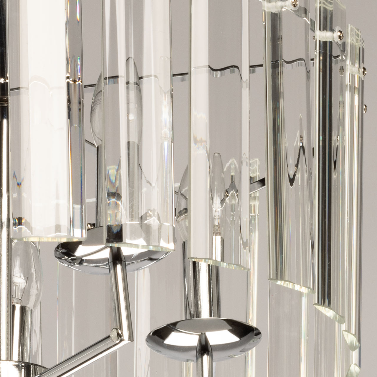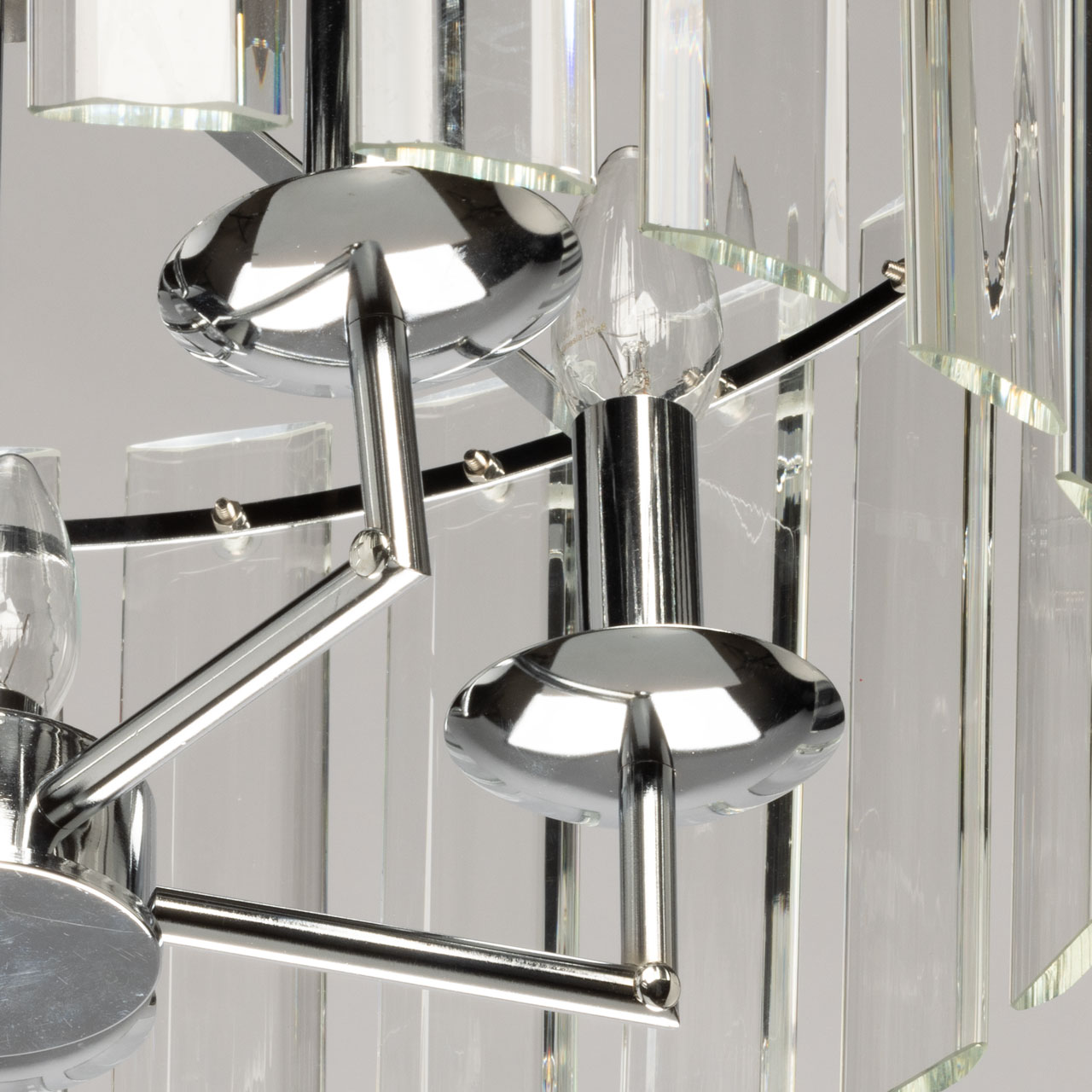 Основание подвесной люстры из сплава алюминия с цинком гальванизировано в цвет хрома Декор — прозрачное стекло прямоугольной вытянутой формы.