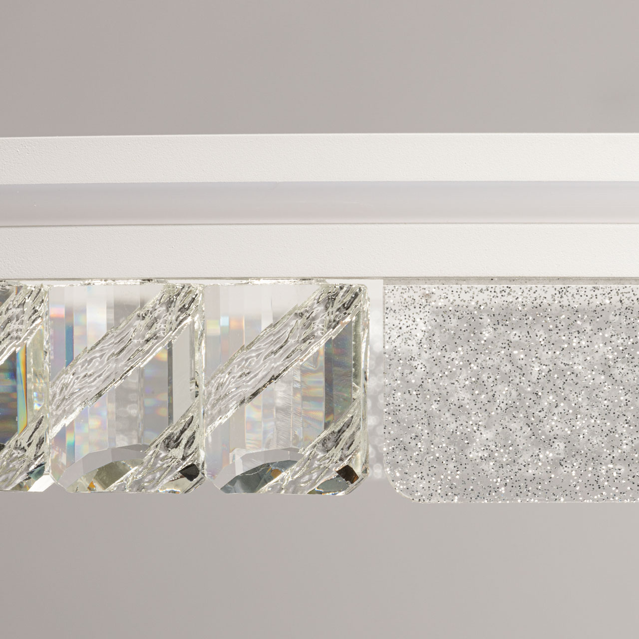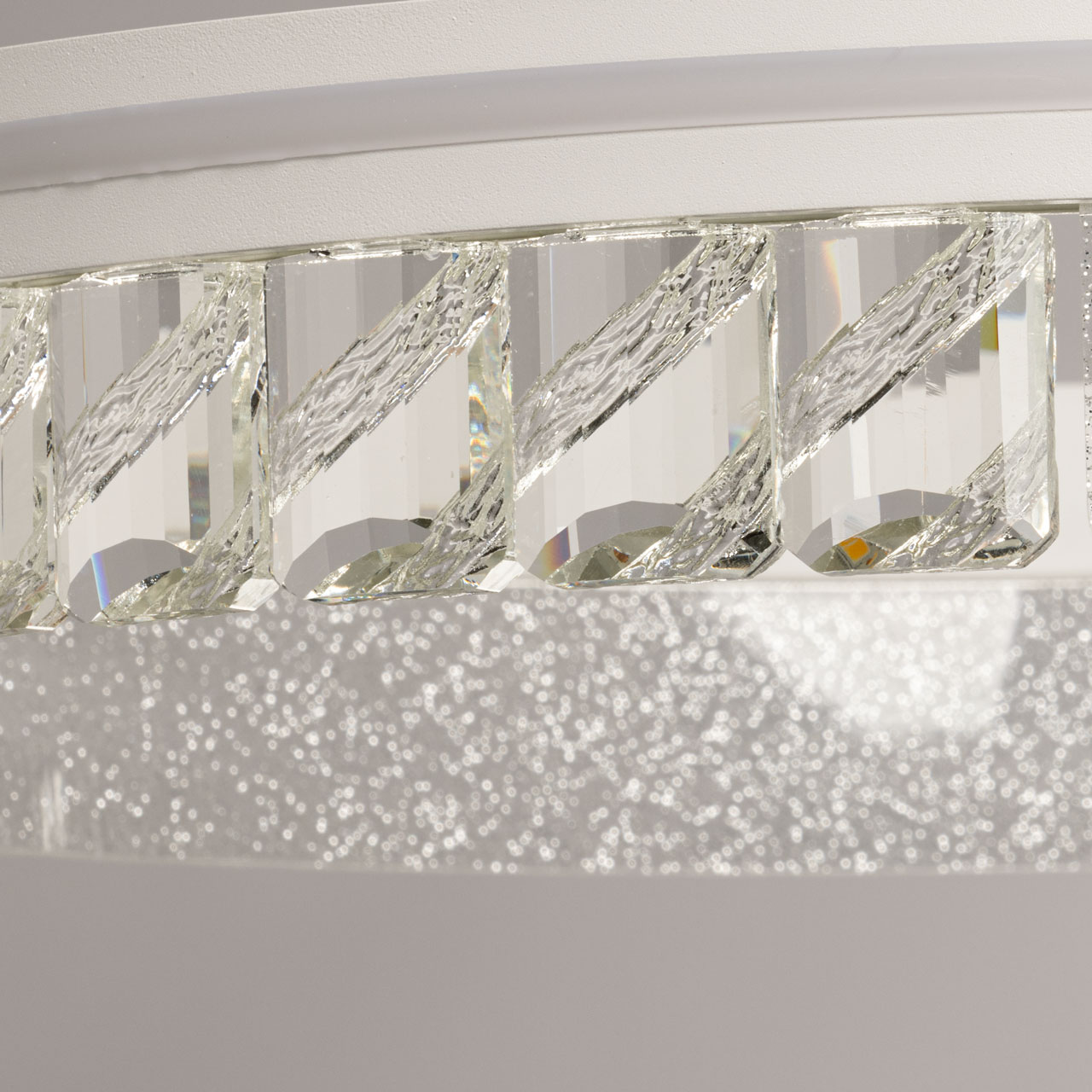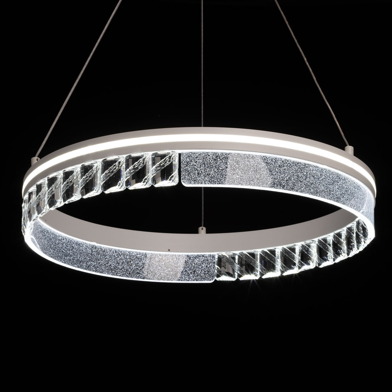 Металлическое основание подвесной люстры окрашено в белый цвет. Плафон люстры выполнен из сплава алюминия с цинком и окрашен в цвет основания. Светодиодные источники света закрыты белым матовым акрилом. Светильник декорирован прозрачным акрилом с блестками и прозрачным хрусталем
