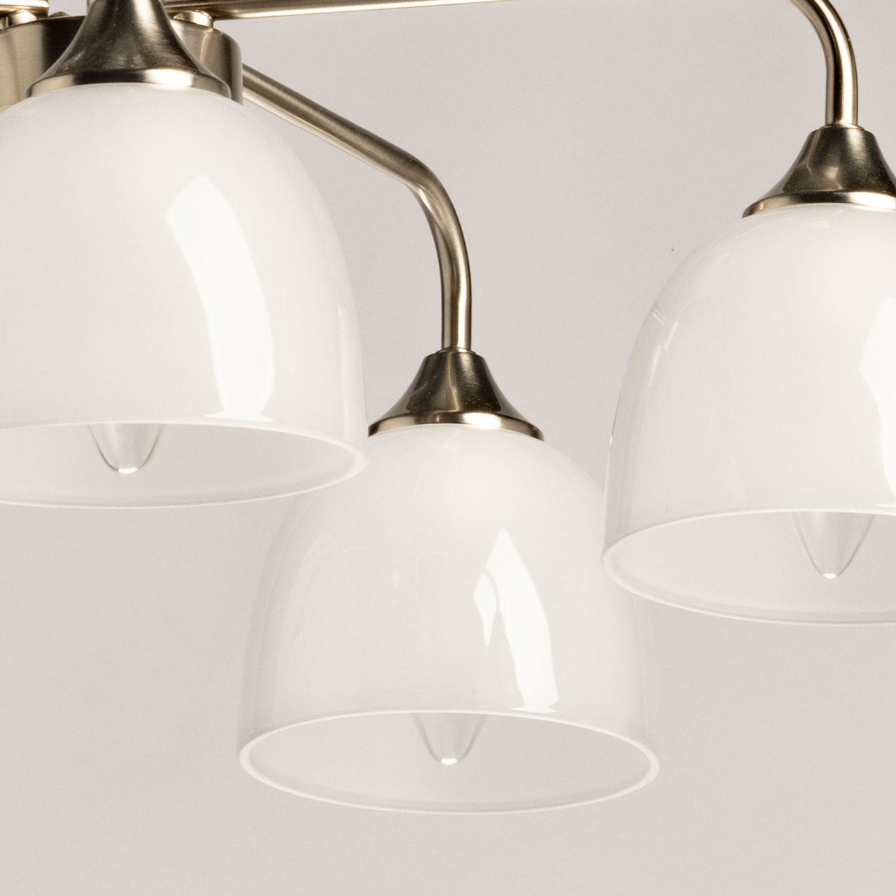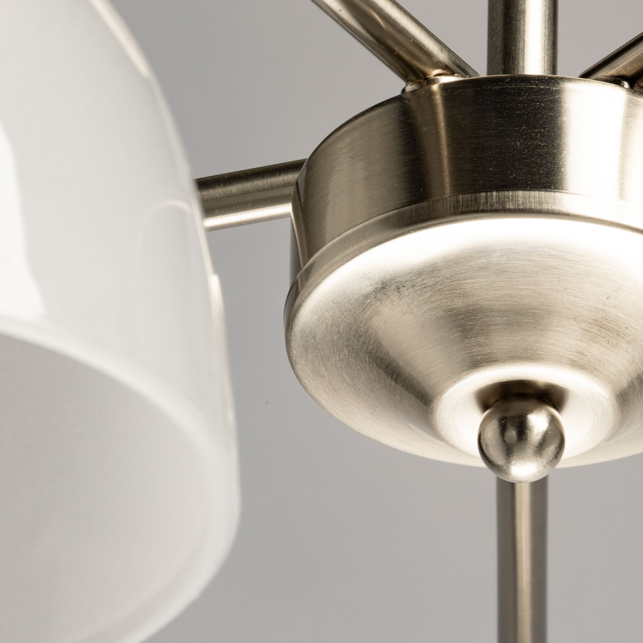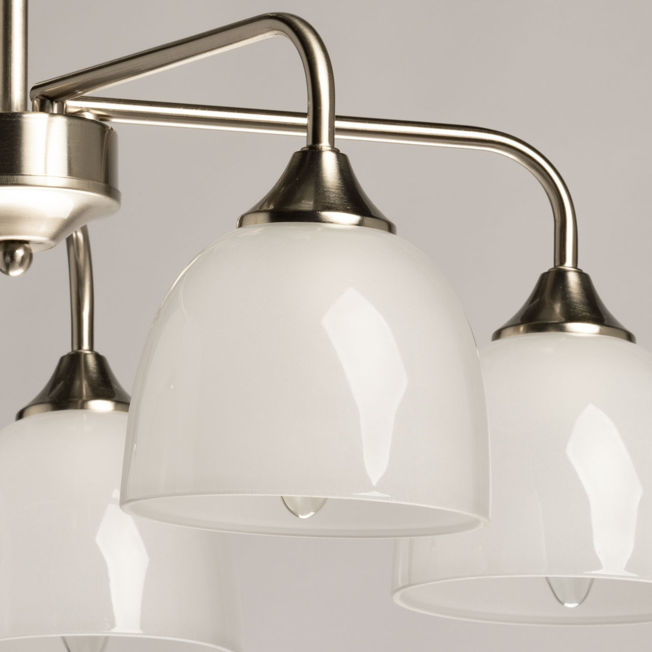 Металлическое основание потолочной люстры гальванизировано в цвет серебра. Стеклянные плафоны отлиты в форму и окрашены в белый цвет изнутри.