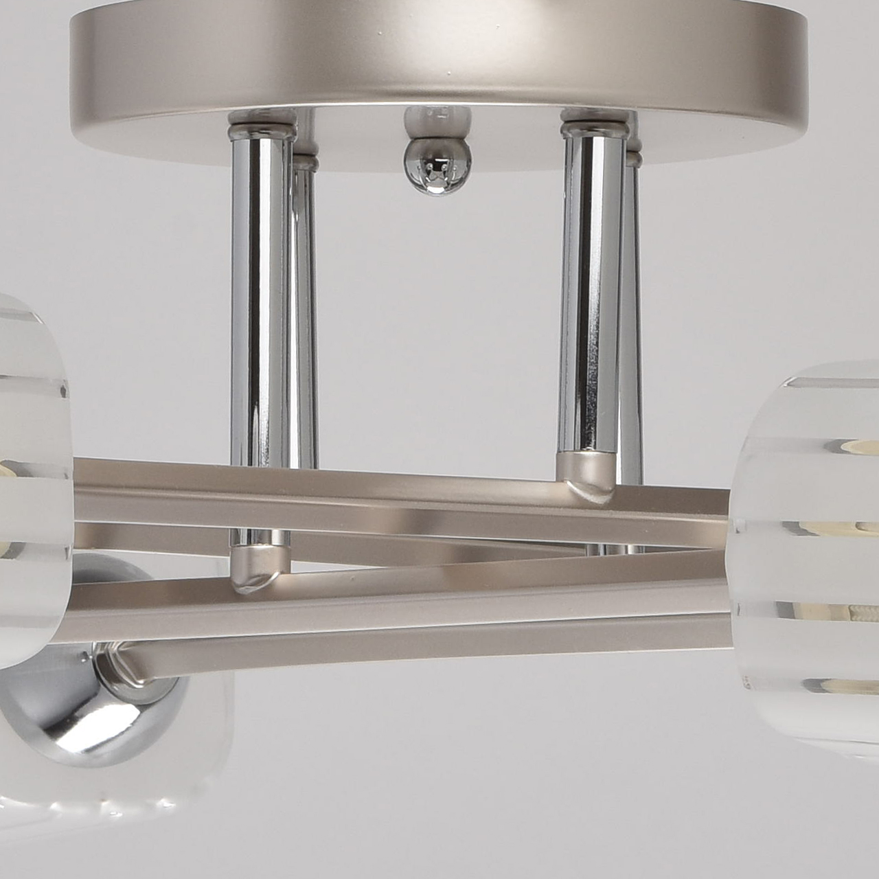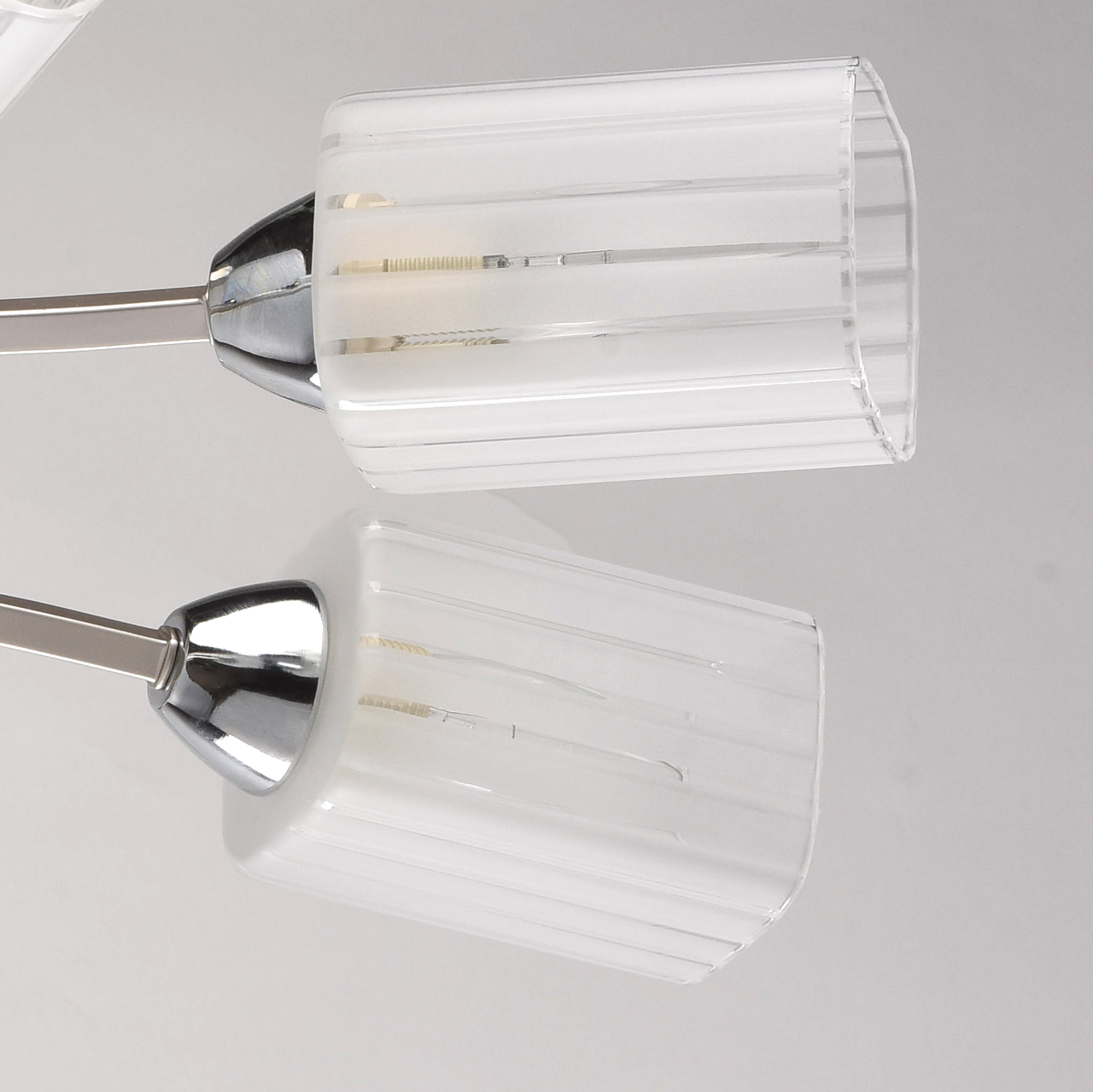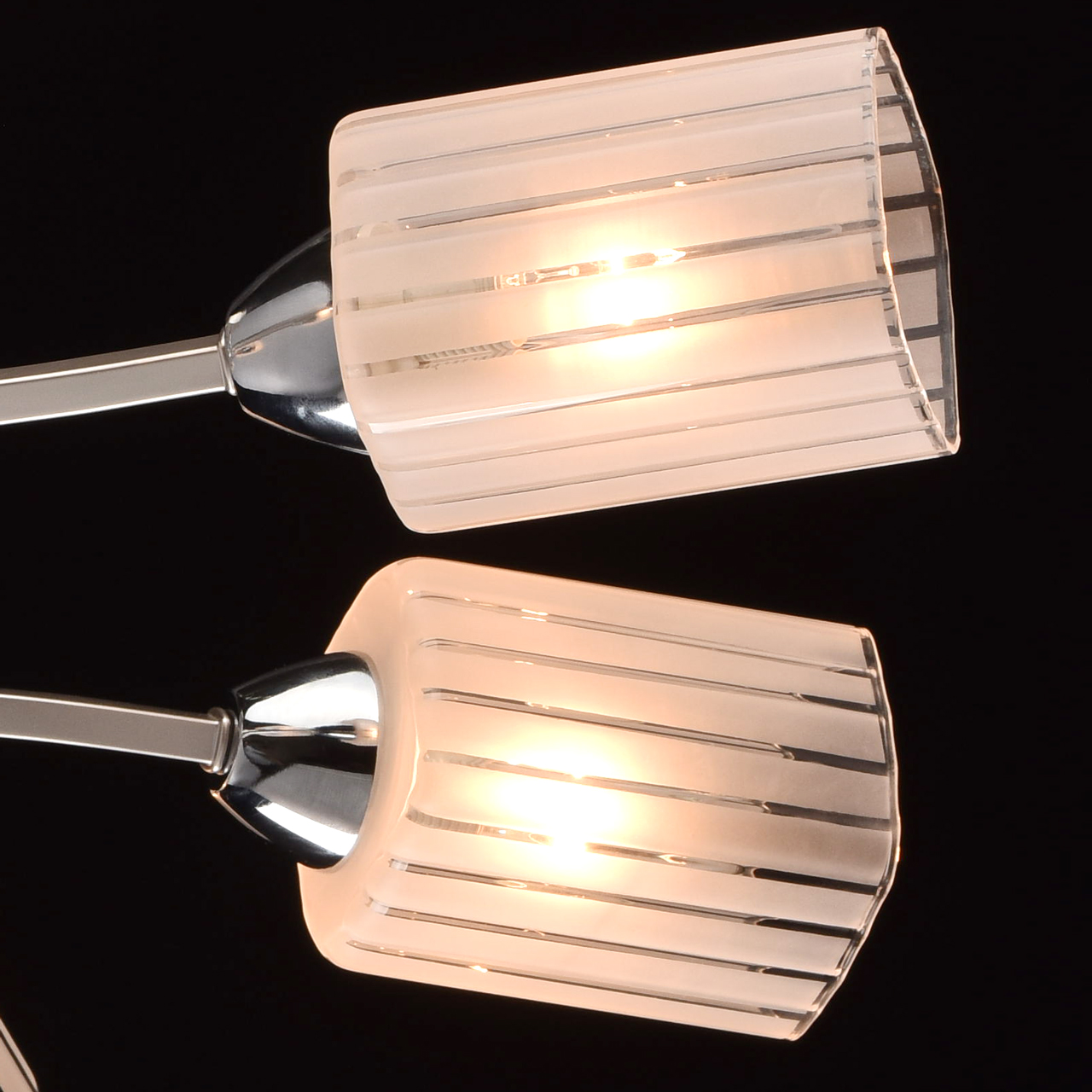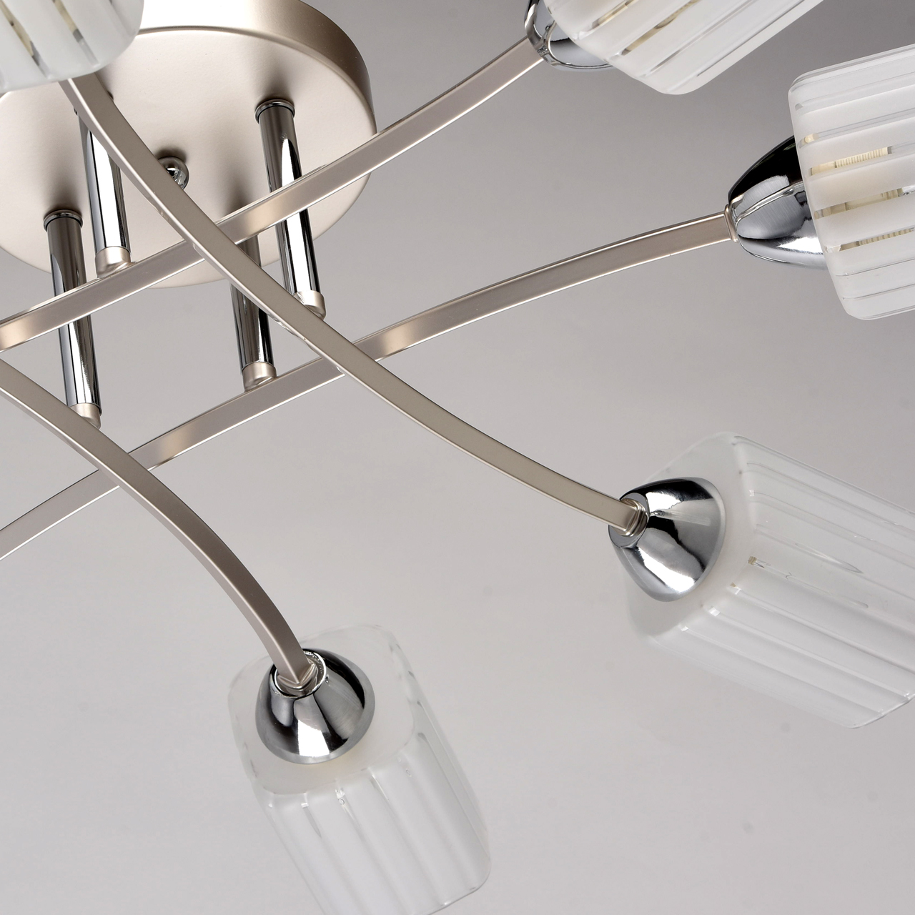 Основание: металл. Потолочная чаша и рожки окрашены в цвет перламутрового серебра, стержни и держатели плафонов — гальванизация в цвет хрома. Потолочная чаша и держатели плафонов изготовлены по технологии обработки на токарном станке. Плафоны: стекло, отлито в форму. Плафоны матированы по трафарету.