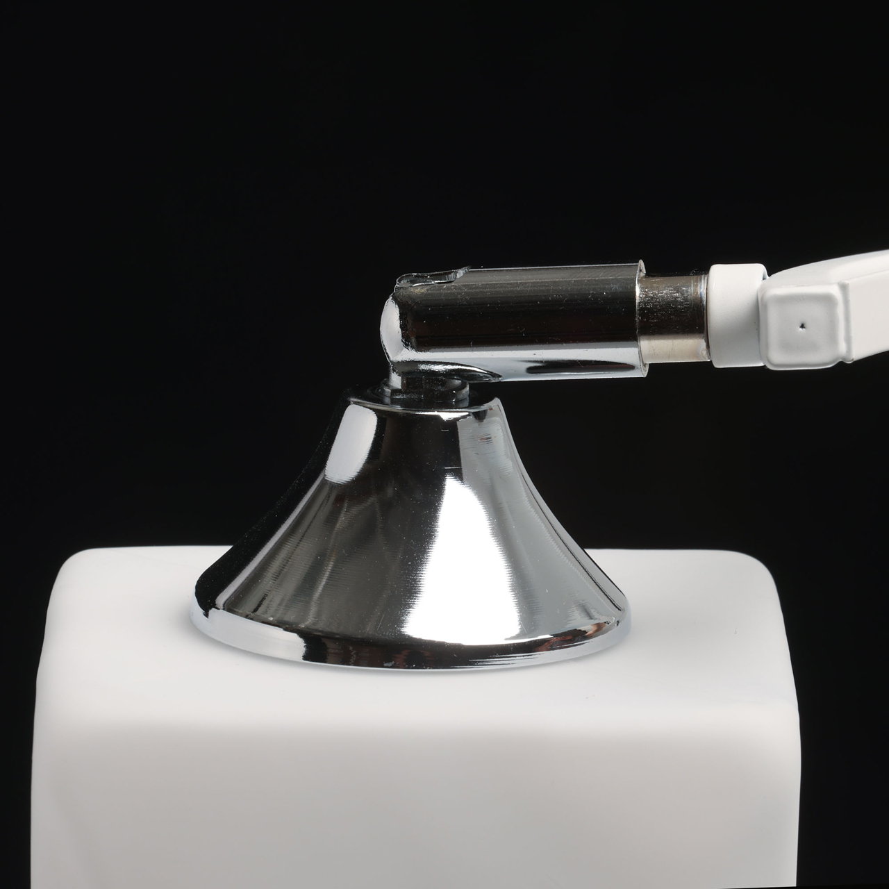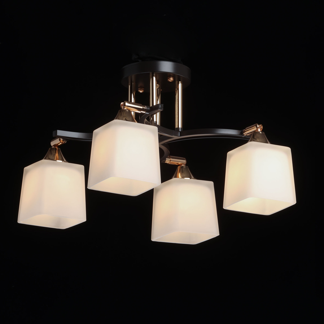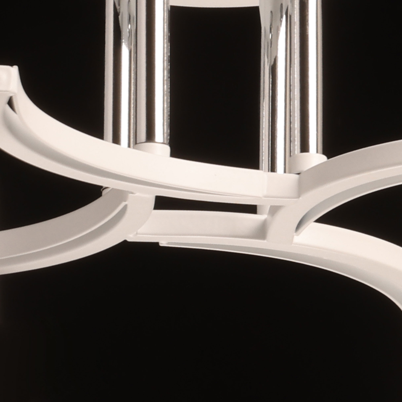 Металлическое основание потолочной люстры окрашено в белый цвет. Отдельные элементы основания гальванизированы в цвет хрома. Стеклянные плафоны отлиты в оригинальную форму и окрашены в белый цвет с внутренней стороны.