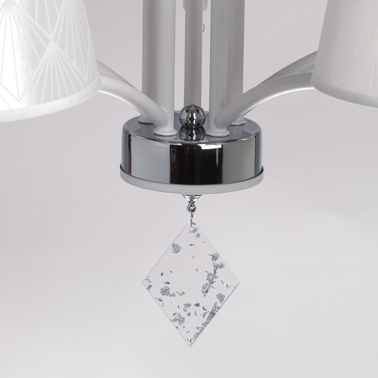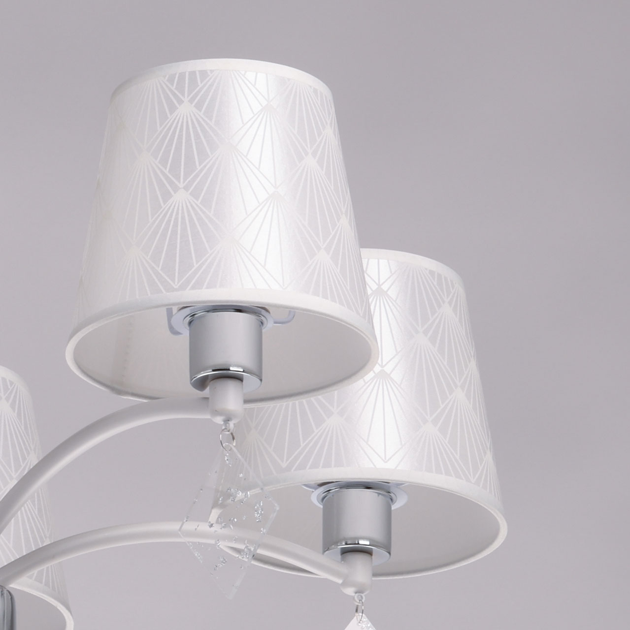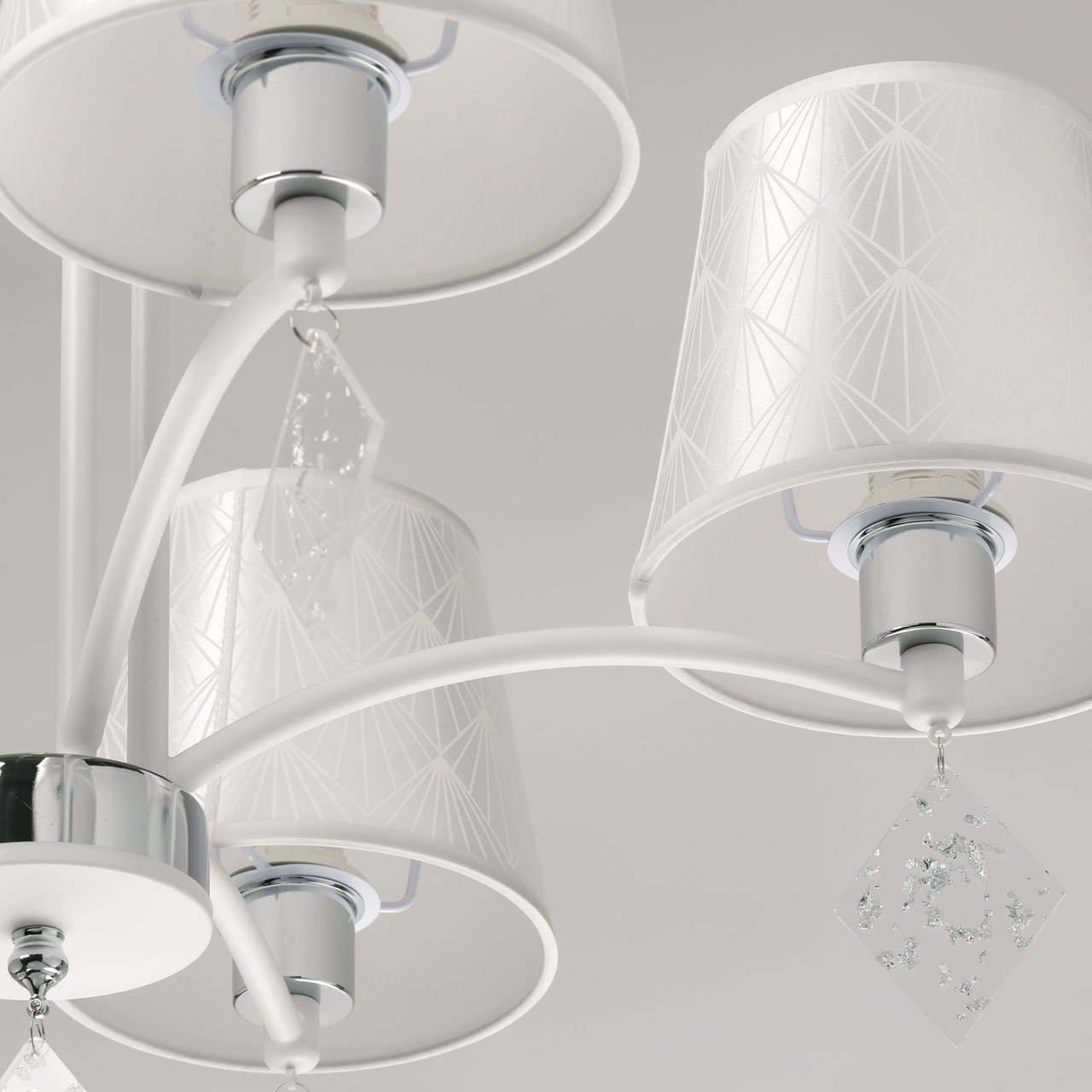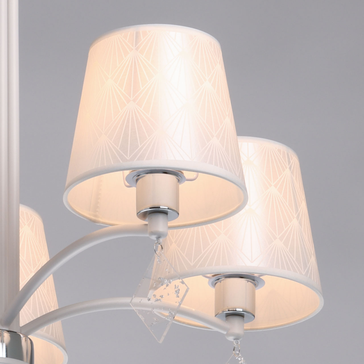 Металлическое основание люстры окрашено в белый цвет. Отдельные элементы основания гальванизированы в цвет хрома. Традиционные источники света закрыты атласными абажурами белого цвета с геометричным рисунком. Абажуры прошиты и отделаны белым кантом. Люстра декорирована подвесками из фактурного прозрачного акрила.
