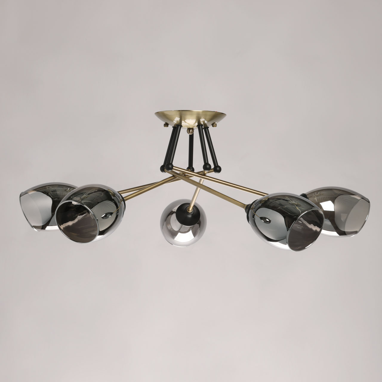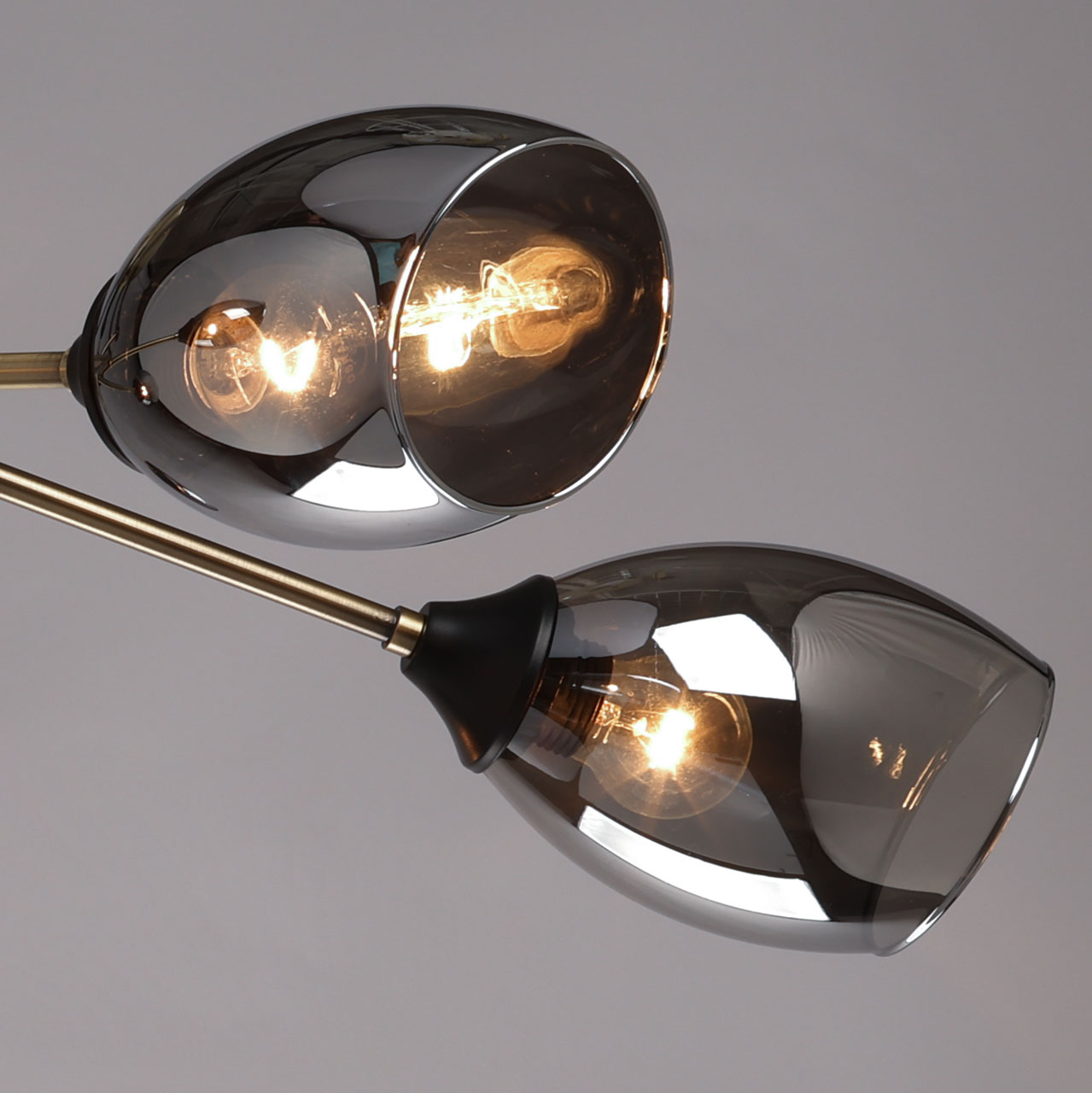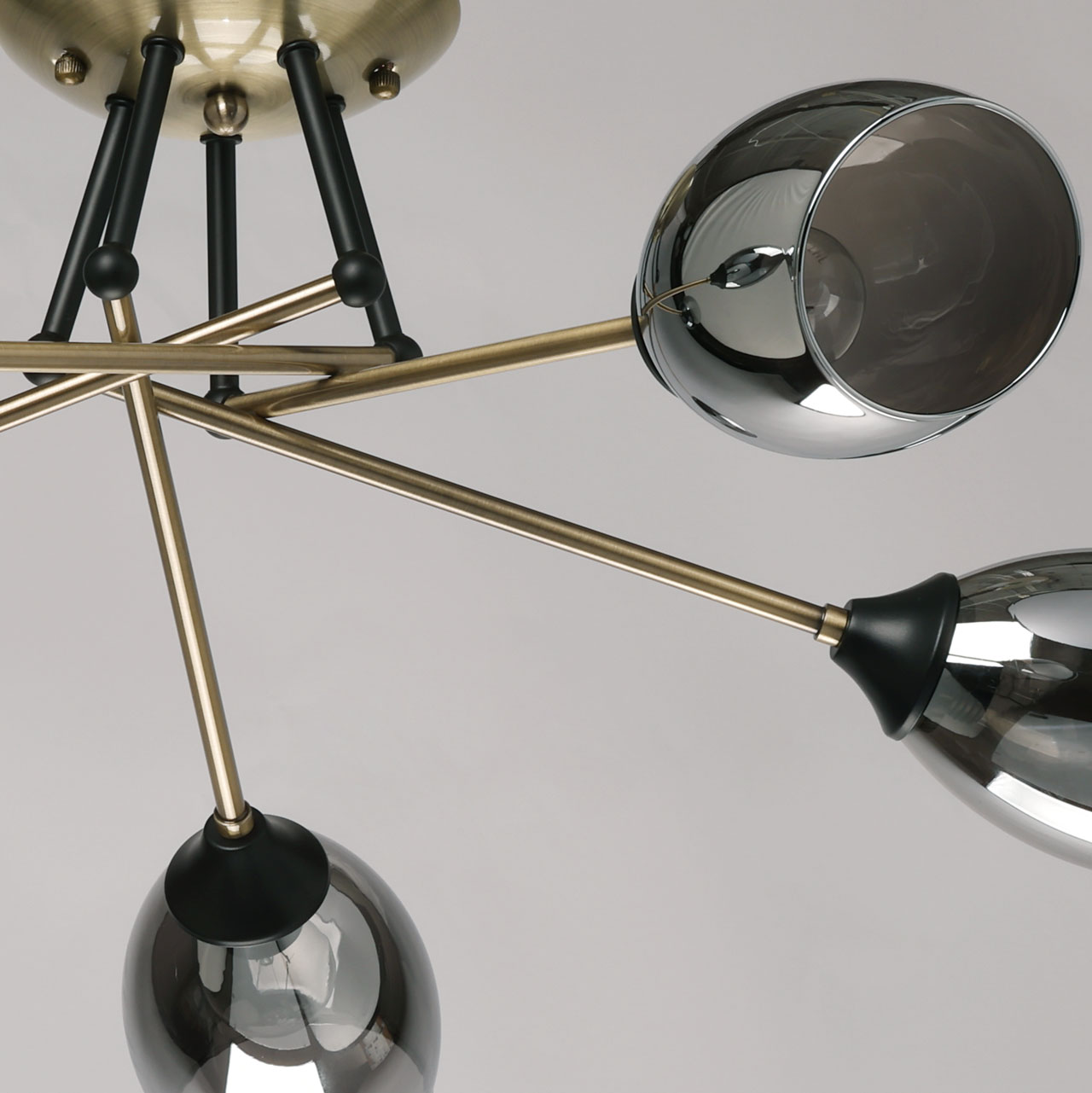 Металлическое основание потолочной люстры гальванизировано в цвет античной бронзы. Отдельные элементы основания окрашены в черный цвет. Традиционные источники света закрыты стеклянными плафонами, гальванизированными в дымчатый цвет.